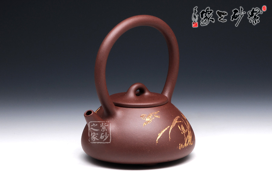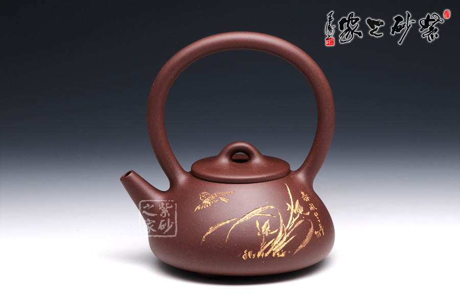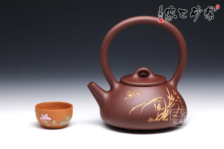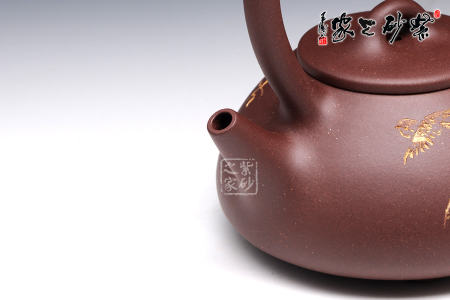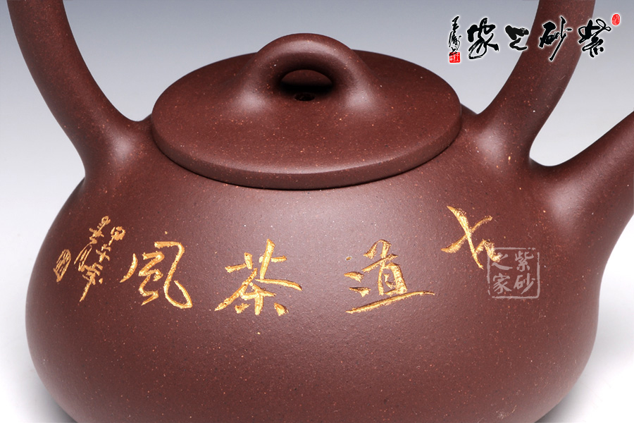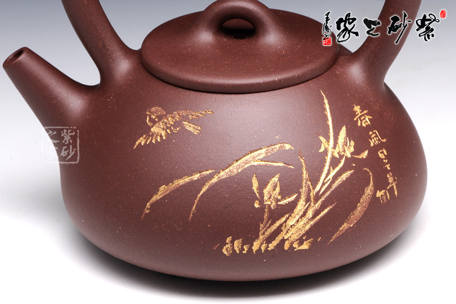 石瓢提梁是紫砂壺經(jīng)典壺型之一。該壺器形敦厚,大氣渾厚,線條流暢飽滿,提梁的空間感處理頗好,虛實(shí)結(jié)合,妙韻渾然天成。以三角形和圓形的結(jié)合,展現(xiàn)了非常優(yōu)雅的工藝美術(shù)。壺身正面,清淺刻繪了蘭花和飛鳥,逼真動人,似有春風(fēng)蕩漾開來;背面的行書“古道茶風(fēng)”清新柔和,將品茗吃茶的趣味闡述得非常通透。