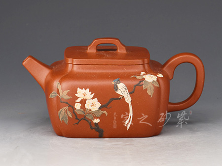 此壺壺身采用泥繪的工藝進(jìn)行裝飾,壺身正面裝飾的是泥繪牡丹,一株長(zhǎng)勢(shì)極好 的牡丹極為逼真,葉茂花碩,一朵牡丹開(kāi)得國(guó)色天香、雍容華貴,一只花骨朵延伸到壺嘴一側(cè);壺身反面裝飾的是泥繪詩(shī)詞“華貴”二字,簡(jiǎn)約唯美,朝氣勃發(fā)。