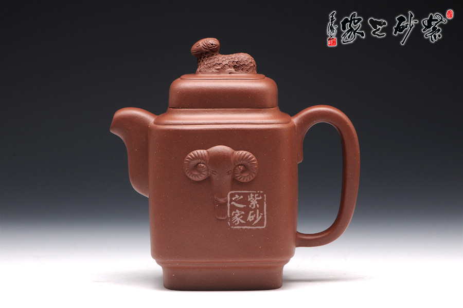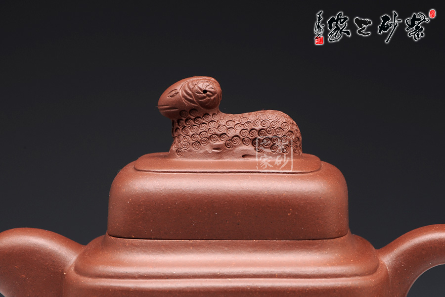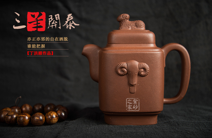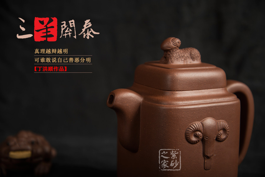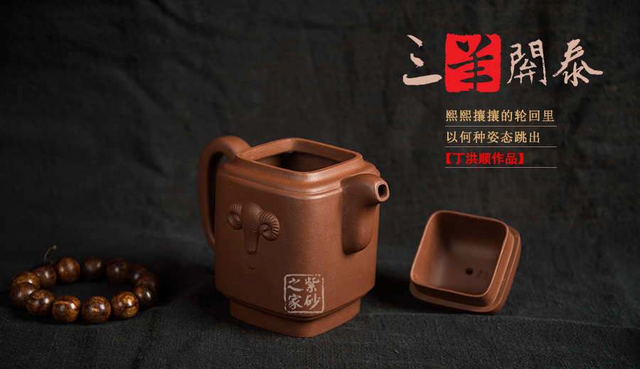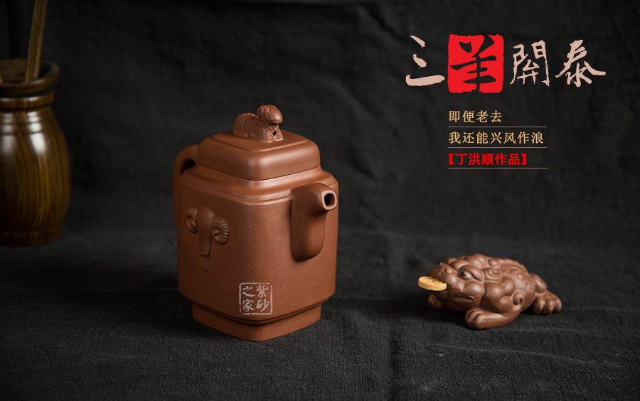 三羊開泰壺樸雅自然,以方器入型,表現(xiàn)出紫砂的沉穩(wěn)和寧靜感受。