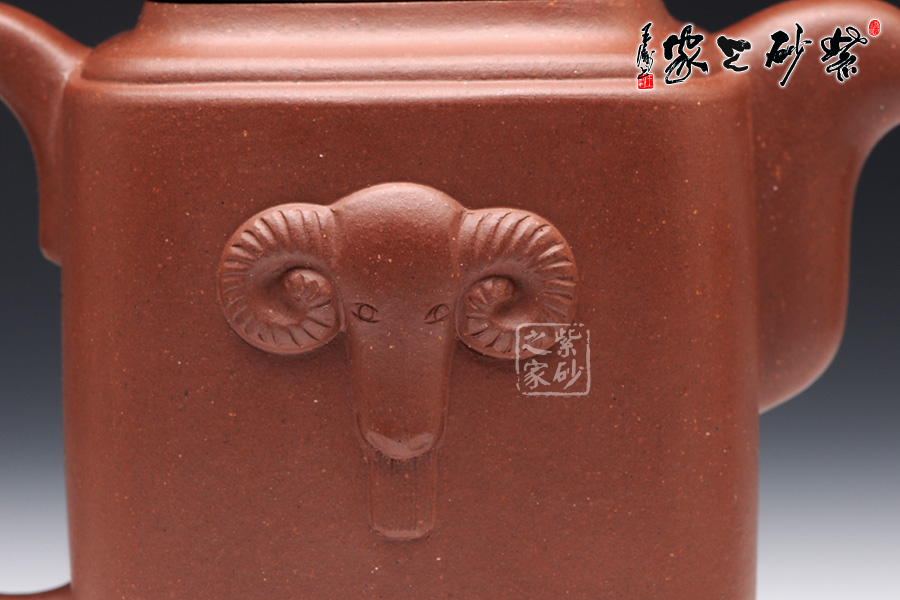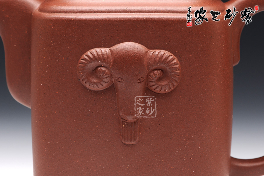 四方形壺身上下修長,橫平豎直,工藝水準(zhǔn)高下立見。平穩(wěn)足底收攏,與上部的肩線對應(yīng),呈現(xiàn)出對稱的美感。四方壓蓋同樣延續(xù)了此壺的風(fēng)格,工整平滑之上,一只俯臥的山羊作為壺鈕,美觀又迎合壺名。彎流壺嘴線條凝重不散,短促蓄勢。細(xì)長壺把瘦而不亂,更顯精煉持重。左右壺身上的兩只羊頭,與壺鈕一起,正合三羊開泰之意。