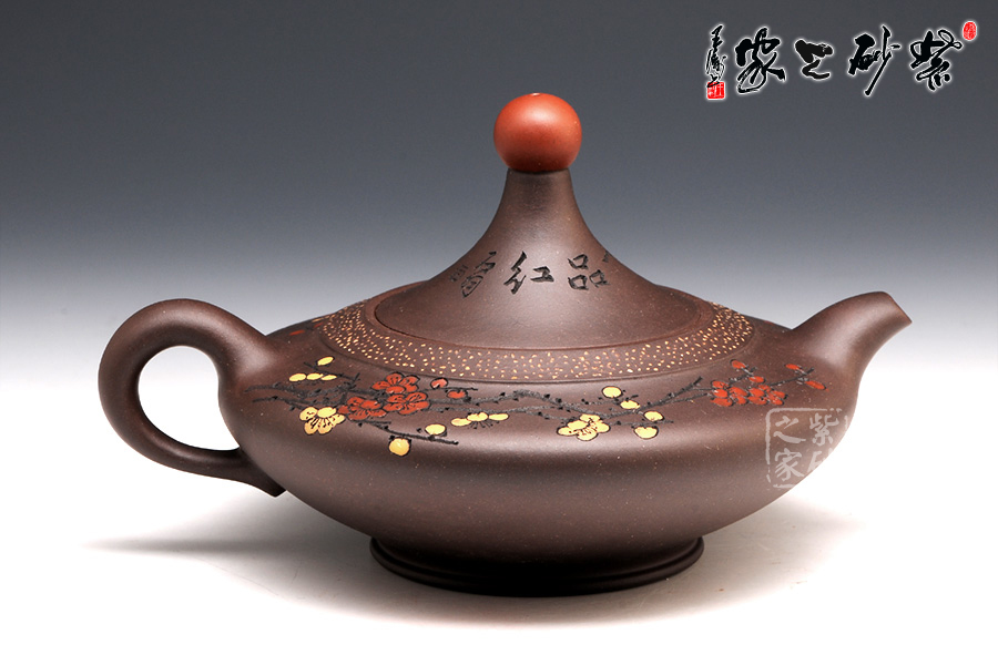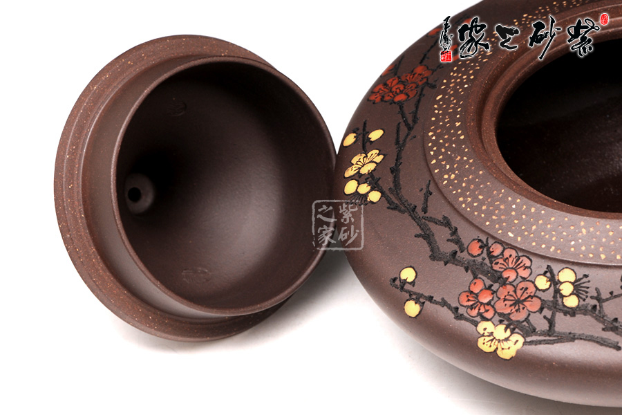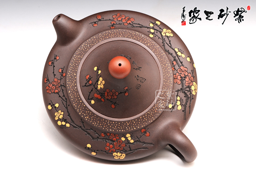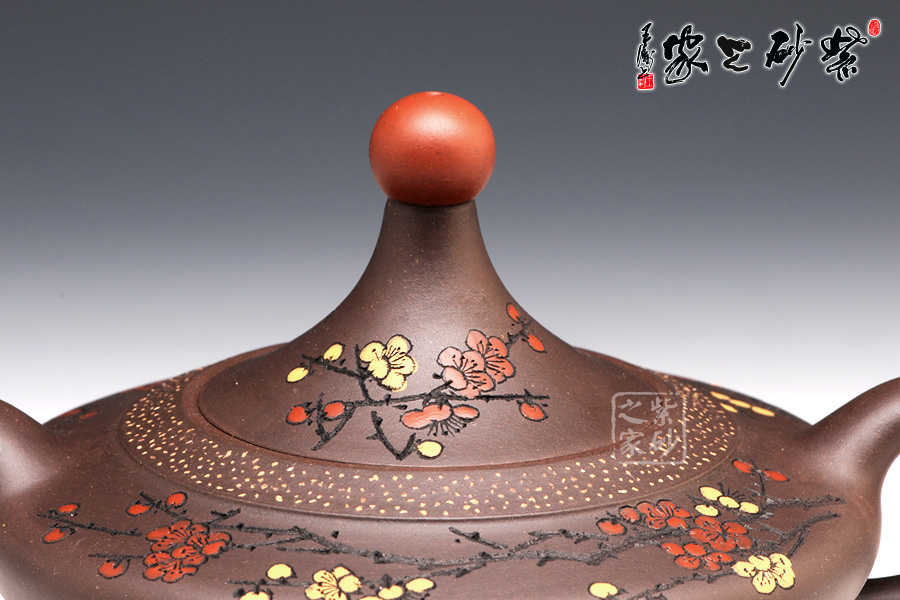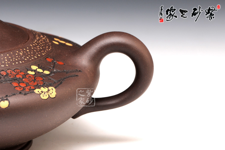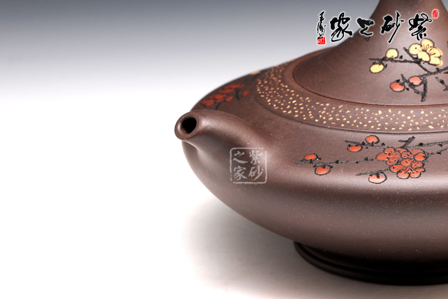 壺型宛若神燈,上豐下斂,氣韻不凡。圈足平穩(wěn)端莊,云線的美感似要爆出一般。壺嘴從壺身自然胥出,彎流設(shè)計,線條自然延伸,味道不散。耳形把線條曼妙,粗細漸變,圍繞出的空間美觀動人。嵌蓋周圍一圈調(diào)砂制作,色澤金黃,美感突出。壺鈕似紅日一點,又像玉珠一顆,斗笠狀拱衛(wèi)在壺蓋中央,美妙可人。圍繞在壺身周圍的一圈梅花刻繪更艷麗精致,一紅一黃兩種色澤交相輝映。
