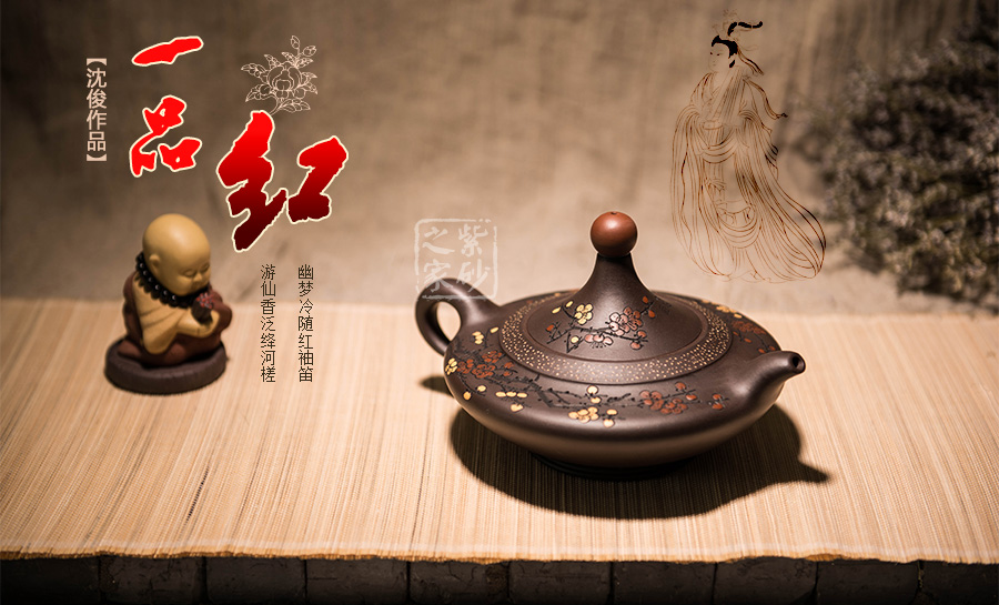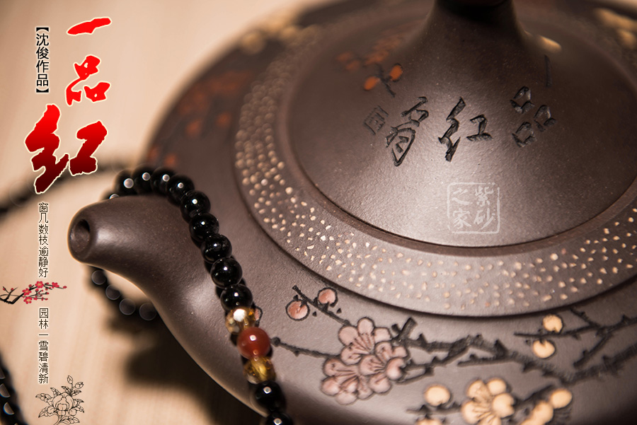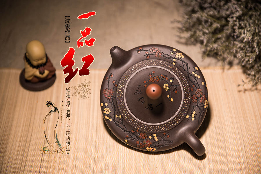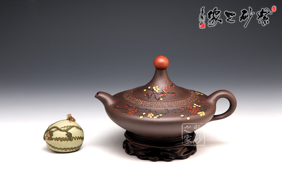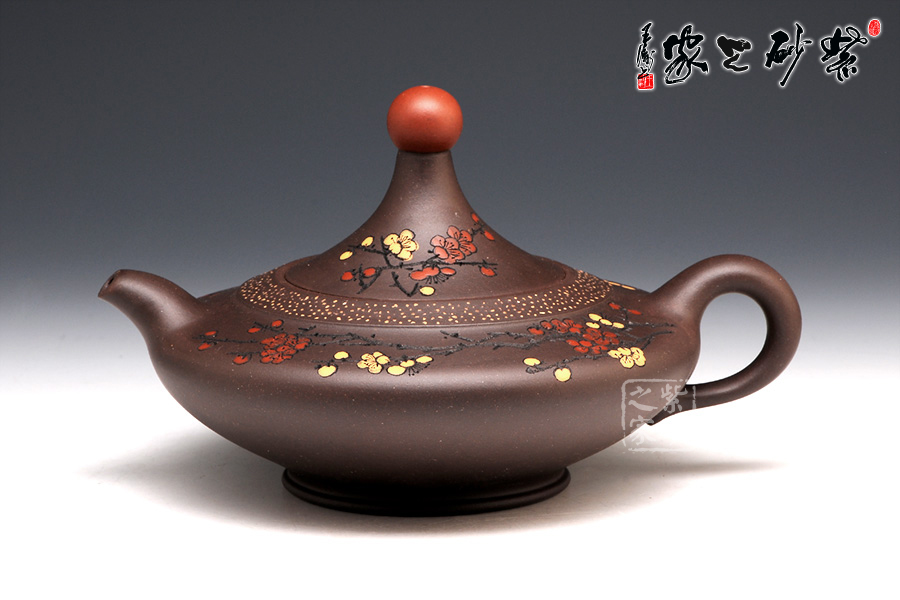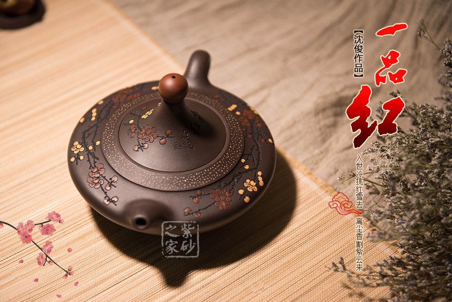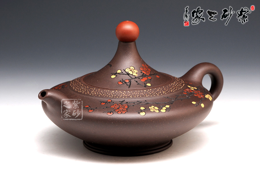 壺型宛若神燈,上豐下斂,氣韻不凡。圈足平穩(wěn)端莊,云線的美感似要爆出一般。壺嘴從壺身自然胥出,彎流設(shè)計,線條自然延伸,味道不散。耳形把線條曼妙,粗細漸變,圍繞出的空間美觀動人。嵌蓋周圍一圈調(diào)砂制作,色澤金黃,美感突出。壺鈕似紅日一點,又像玉珠一顆,斗笠狀拱衛(wèi)在壺蓋中央,美妙可人。圍繞在壺身周圍的一圈梅花刻繪更艷麗精致,一紅一黃兩種色澤交相輝映。