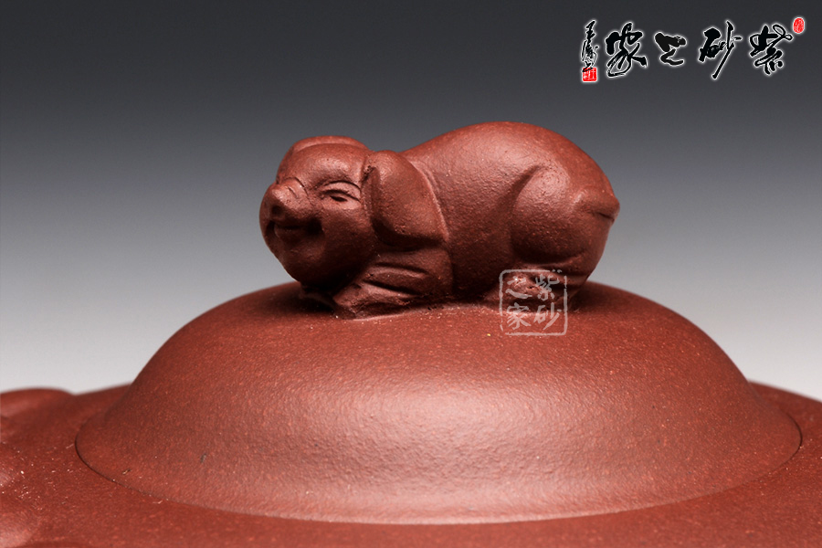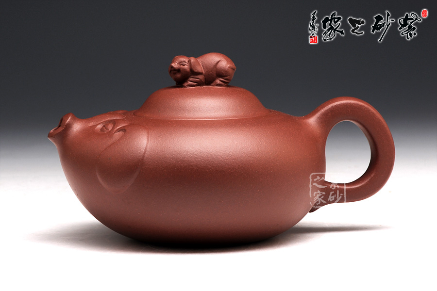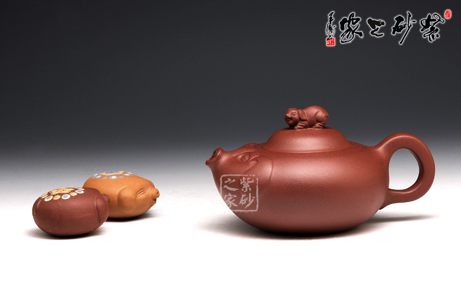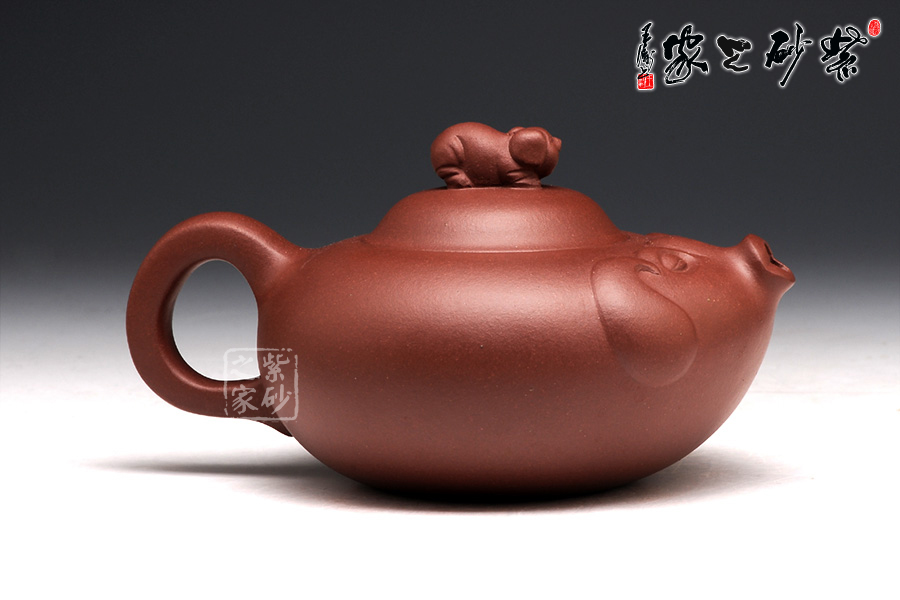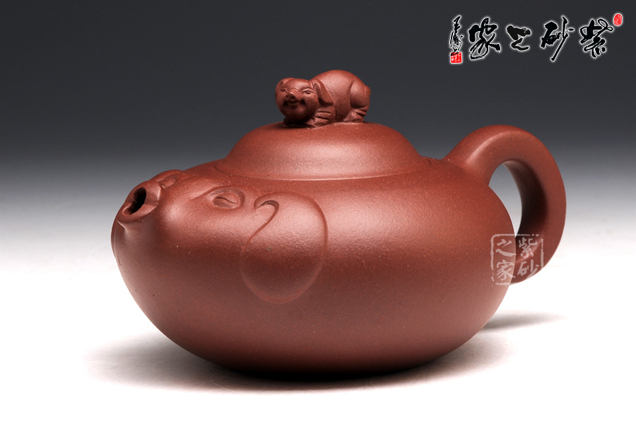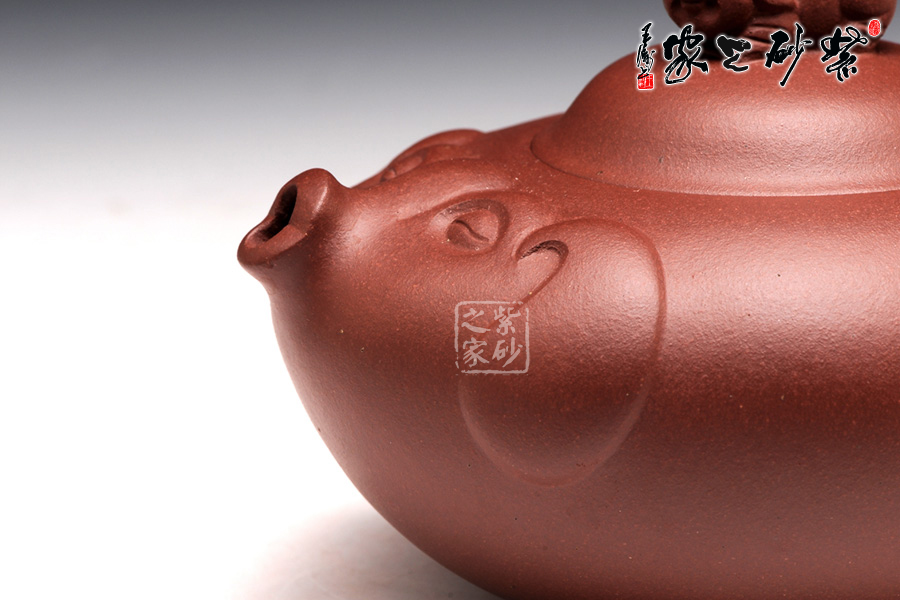 壺身圓滑美妙,輪廓飽滿,是豬的肚子。壺嘴短小可愛(ài),正是豬撅起的鼻子。圍繞著壺嘴一圈,是用線條裝飾出的豬面部,眼睛微閉,耳朵擺動(dòng),恰是開(kāi)心的表情。壺蓋如倒置碗一枚,小豬作為壺鈕,體態(tài)豐腴,神情可愛(ài)。壺把從壺身流出,自然收尾,正是豬尾巴。整款作品構(gòu)思獨(dú)特,趣味動(dòng)人。