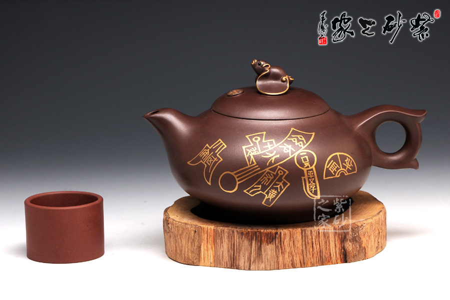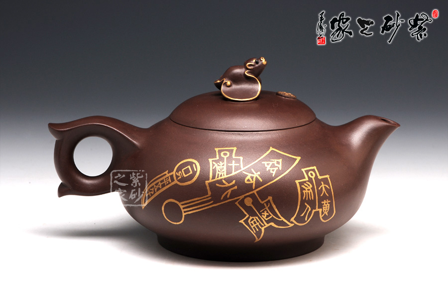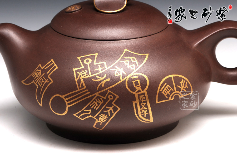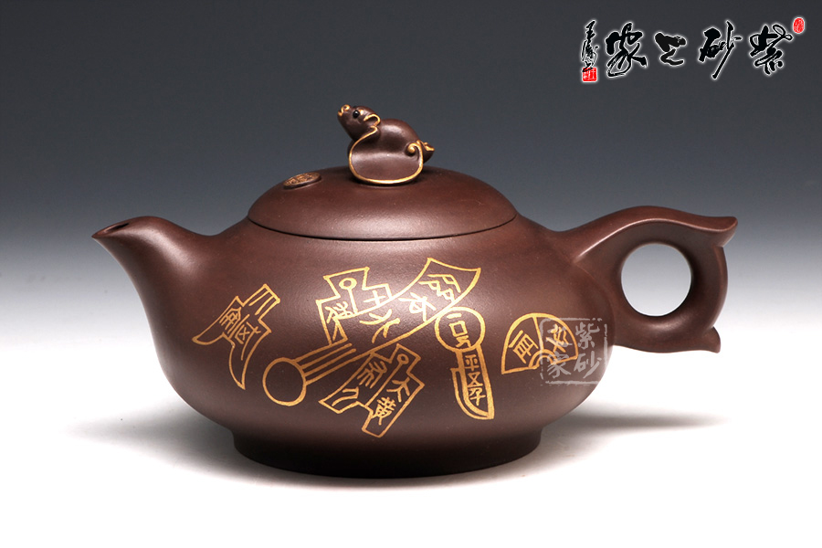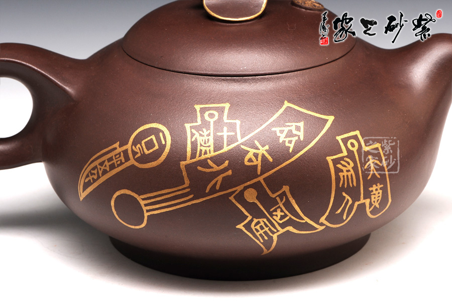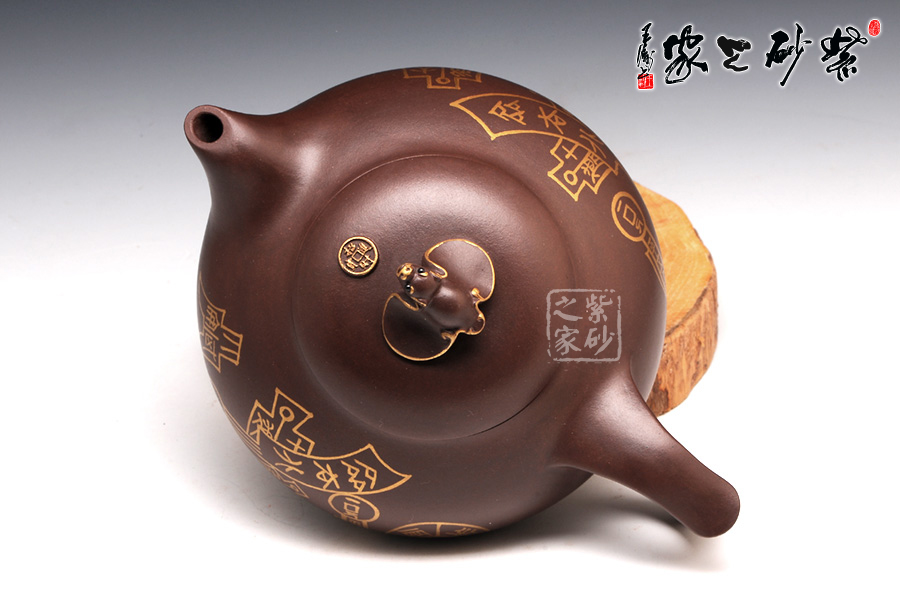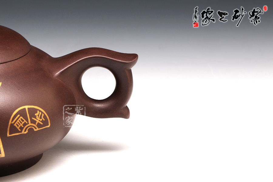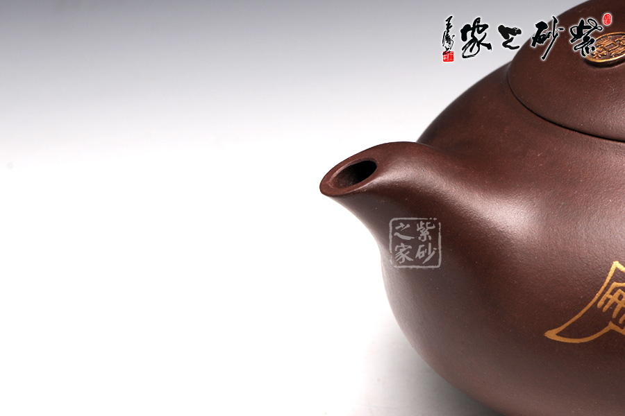 壺型有蝙蝠的形態(tài),壺身圓潤光滑,從上到下逐漸豐盈飽滿,是蝙蝠的肚子。圈足工整平穩(wěn),韻味典雅不俗。壺嘴從壺身胥出,嘴口平整,外觀細(xì)膩,似蝙蝠的面部。壺把呈圈形,圓中有方,上下飛翼對稱,是蝙蝠的翅膀。壺蓋之上是一只蝙蝠的造型壺鈕,鑲金裝飾更高貴不凡。兩面裝飾的鑲金古錢幣意味悠遠(yuǎn),寓意更好。