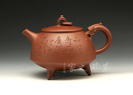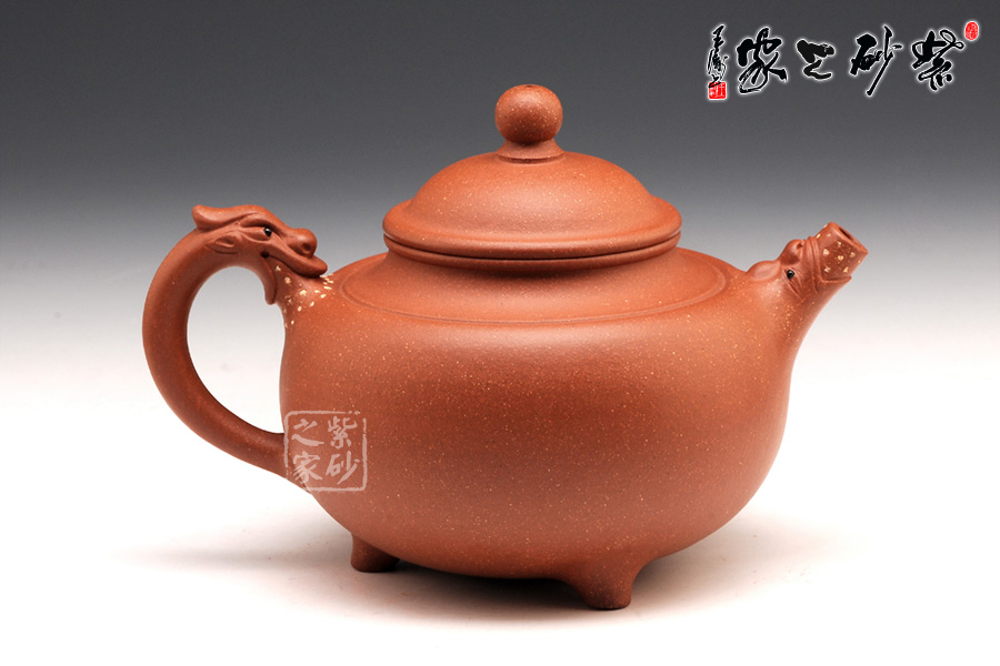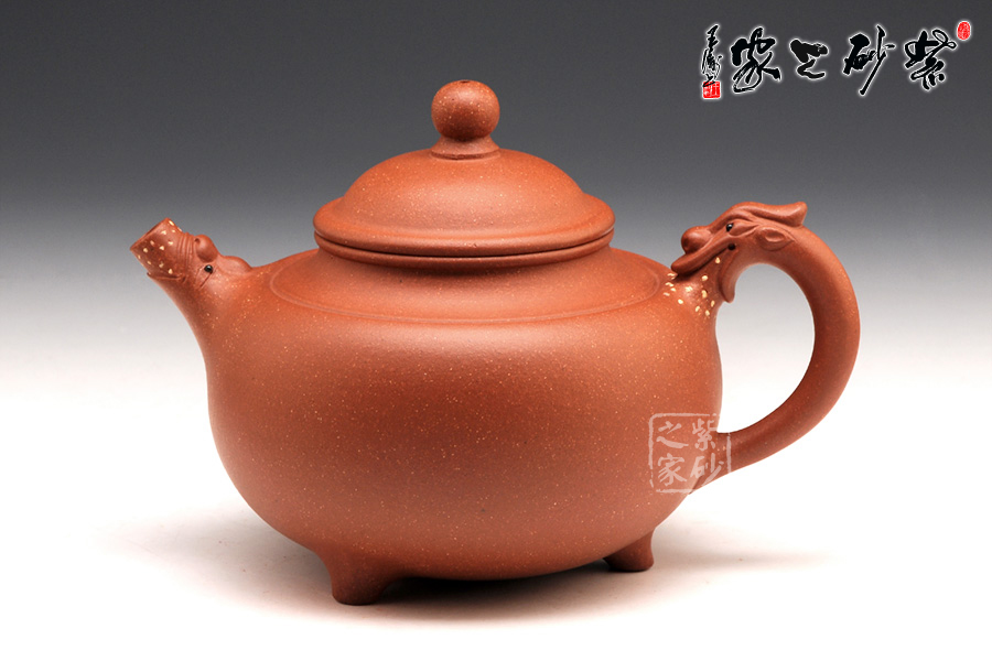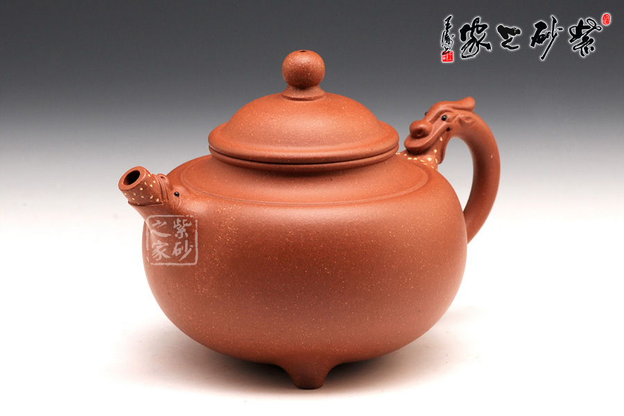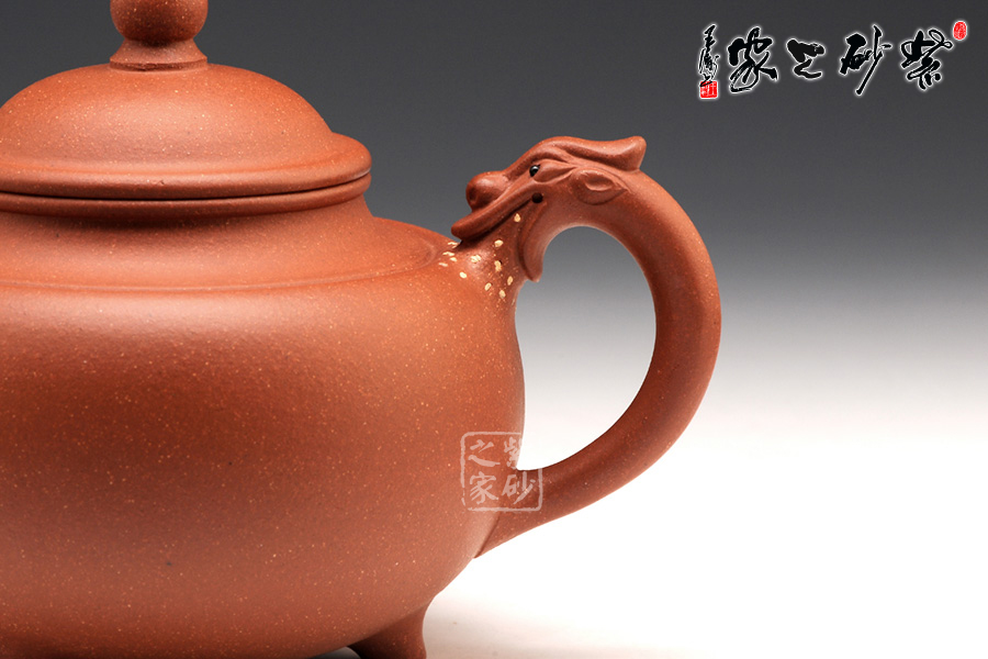 該壺整體由三腳香爐鼎為主體造型,做工精細,形制敦實古樸,壺身簡潔大氣,十分豐滿,壺身極扁而圓潤,質如璞玉;平蓋嚴絲合縫,與壺口緊密貼合,蓋面上凸而平實,拔高壺身的高度,一粒精美的圓珠作為壺鈕,珠圓玉潤;暗接龍形直流嘴 霸氣胥出,迅猛有力;龍形飛把隨壺身傾斜,暗接同樣精湛無痕,端握舒適稱手;鋪砂裝飾華麗精致,壺底三足鼎立,足尖外撇,古拙而富有老味。此壺是實和珍藏的佳品。