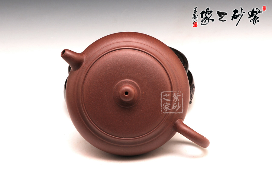 線圓為晚清民國經(jīng)典壺式之一,但此線圓壺卻不同以往。壺身依舊是扁圓球型,但并非兩片合并??诓颗c半球狀蓋相切,壺底簡潔,為一捺底,珠型鈕與蓋渾然一體,整個壺在扁圓中富于韻味。壺流自壺腹胥伸自然,把高挑圓潤下留垂耳,與流對應(yīng)稱勢。肩部位置的線條提攜整壺神韻,線條細長美觀、角圓,變化中求統(tǒng)一,以求完美。
