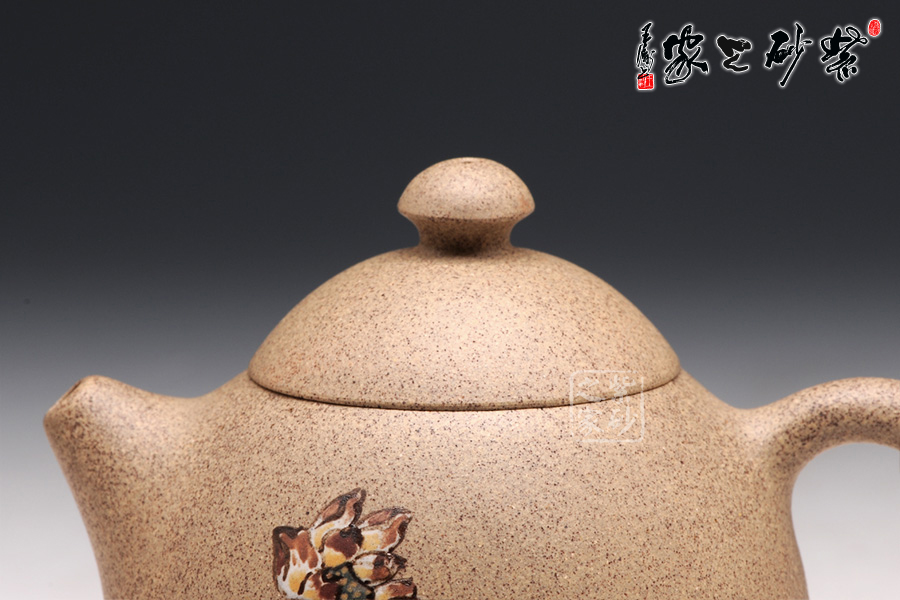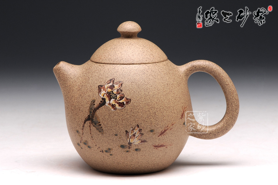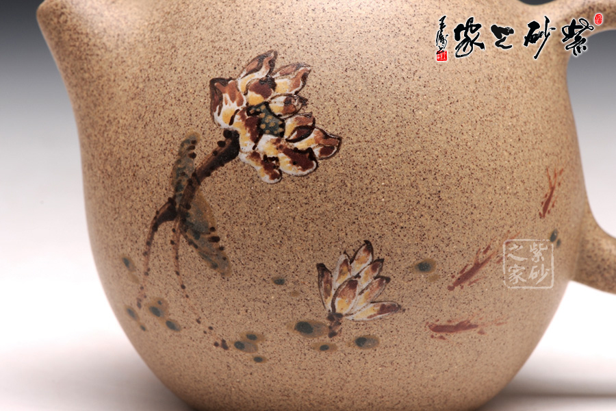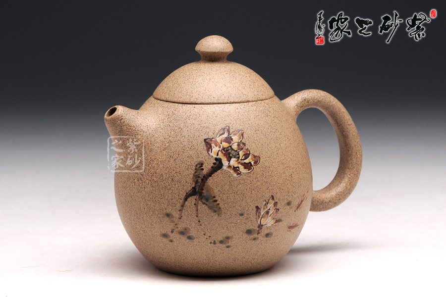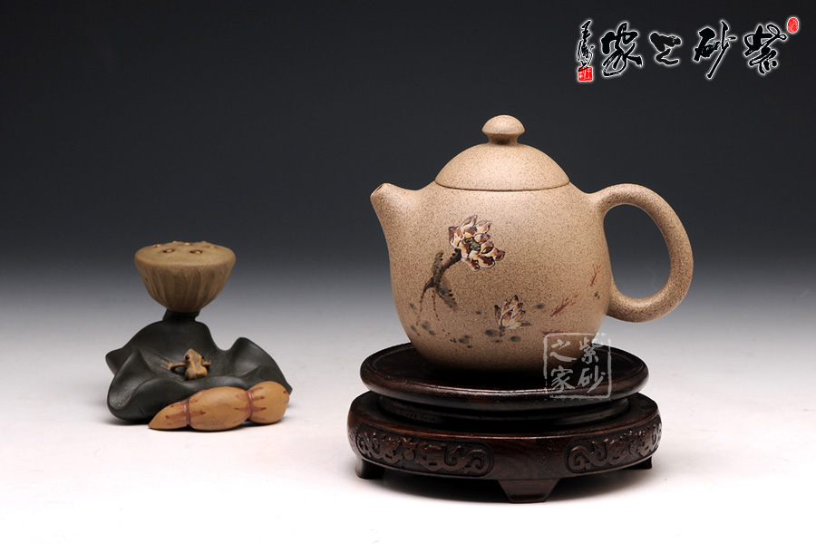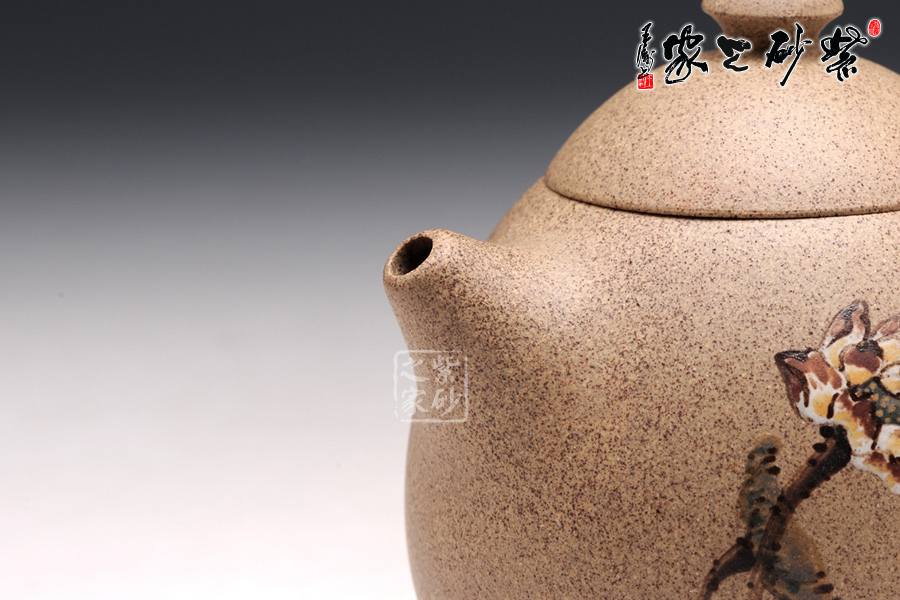 此壺為清仿制時大彬之龍蛋壺,通體狀似蛋形,截蓋,如蘑菇狀壺鈕,直錐嘴,壺嘴短而粗,出水流暢,大圈把勢與壺體趁勢,耳把大而垂,手握舒適,壺體下部過渡平緩,全器平添一種拙味和稚氣的親切感。壺身采用獨特的彩繪工藝裝飾,荷花游魚似水墨畫一般,清麗悠閑的感受讓人向往。