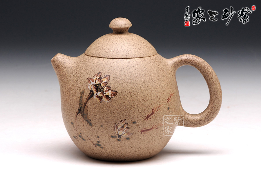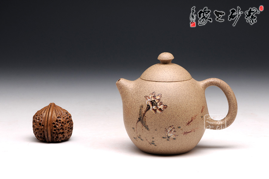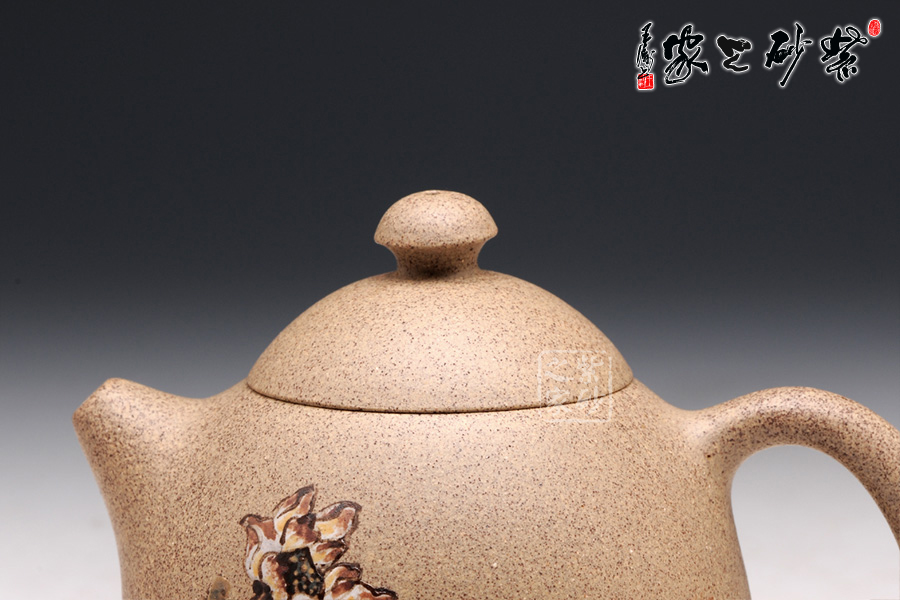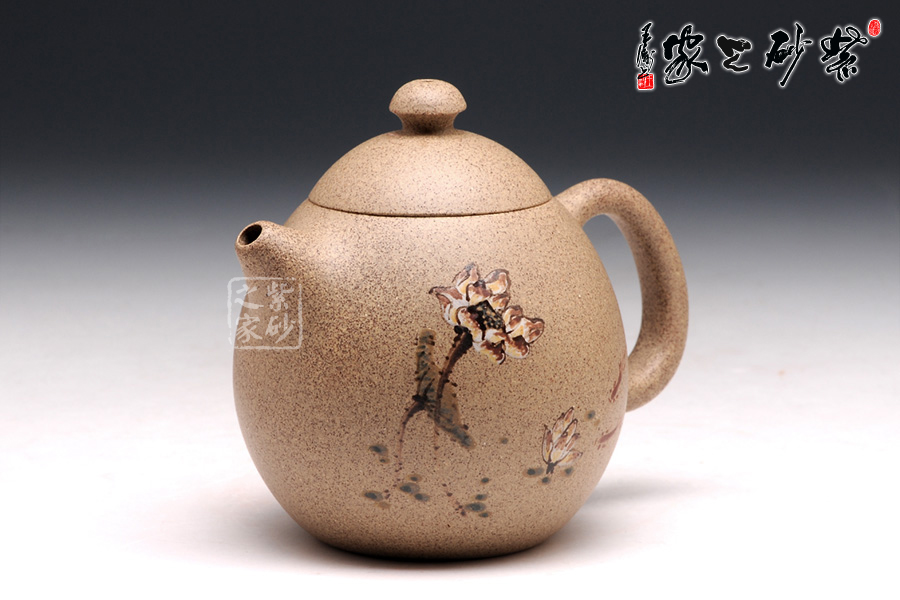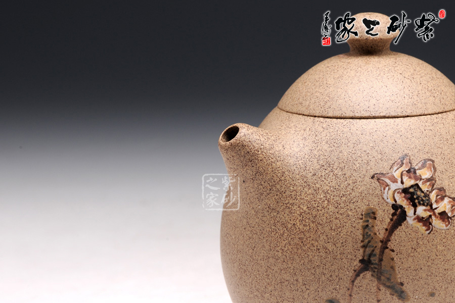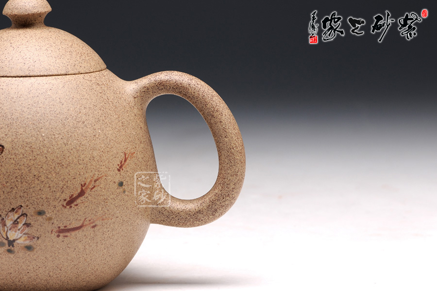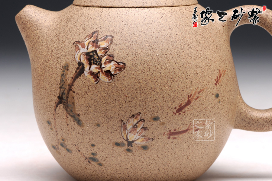 此壺為清仿制時(shí)大彬之龍蛋壺,通體狀似蛋形,截蓋,如蘑菇狀壺鈕,直錐嘴,壺嘴短而粗,出水流暢,大圈把勢(shì)與壺體趁勢(shì),耳把大而垂,手握舒適,壺體下部過(guò)渡平緩,全器平添一種拙味和稚氣的親切感。壺身采用獨(dú)特的彩繪工藝裝飾,荷花亭亭玉立,游魚(yú)自在動(dòng)人。