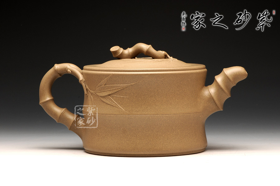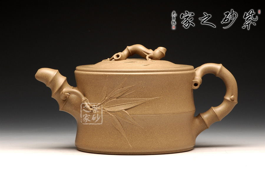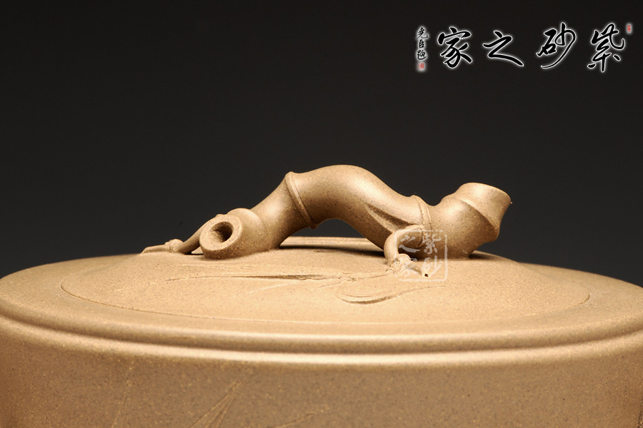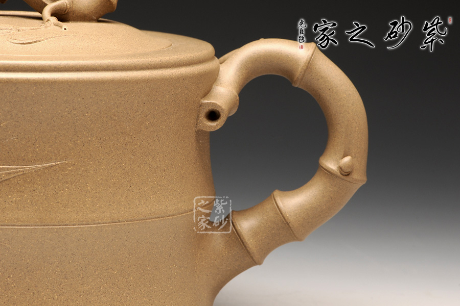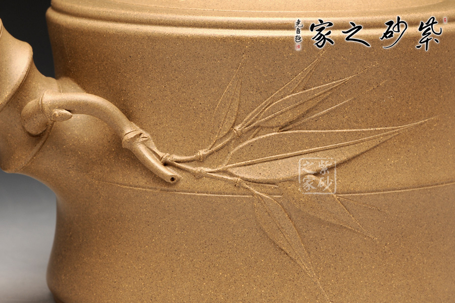 經(jīng)典的花貨造型,以竹為形為意,塑造的作品清新高雅,大氣雅致;壺身呈兩節(jié)竹形狀,的流把均是竹段造型,虬曲有力,高風(fēng)亮節(jié);壺鈕與壺嘴均生出竹葉,壺鈕兩側(cè)各有兩片竹葉,呈相反方向盤桓;壺嘴靠近壺身第一節(jié)竹段上生出一小枝,枝頭上四片竹葉,一片向上迎風(fēng)翻卷,其中兩片自然舒展開來,還有一片向下延伸開去;壺把下端胥出一枝竹葉,住在中間位置,緊靠壺身竹節(jié)所飾腰線,飄逸翩躚;嵌蓋,嚴絲合縫,吻合完美無縫;將壺柄提拿起來,幾個竹節(jié)自然將手指穩(wěn)住,絲滑無滑膩之感;原礦段泥泥料極為細膩溫潤,壺身光潔柔亮,以手撫之,觸手生溫。