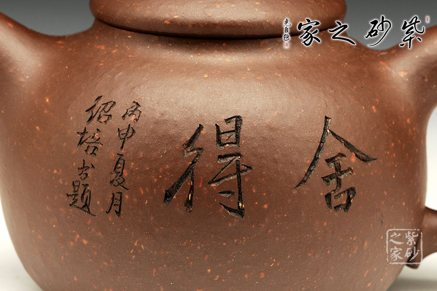 整體來看,此壺的造型非常樸實。壺身是一個圓球,飽滿而潤滑,調(diào)砂肌理豐富有趣。壓蓋圓潤精巧,圓柱壺鈕與壺蓋一體,簡練有趣。短促直嘴和環(huán)形把左右對應(yīng),二者都是線條凝重,似有不散的意味。名為“憨壺”,真的名副其實。
