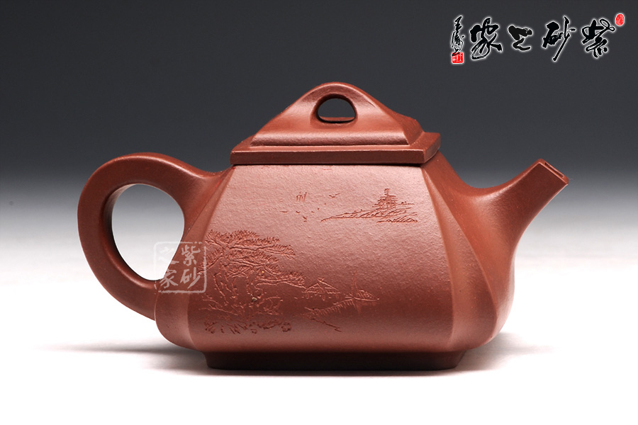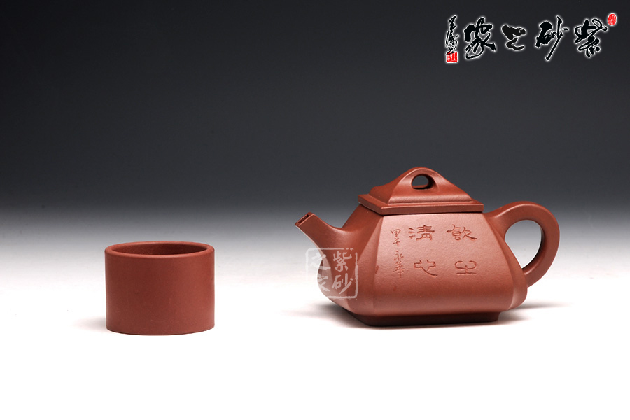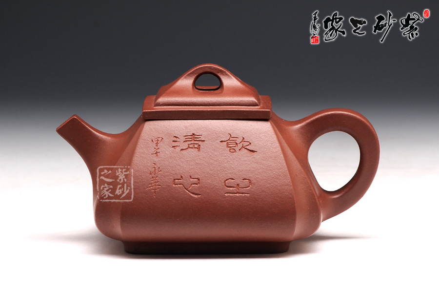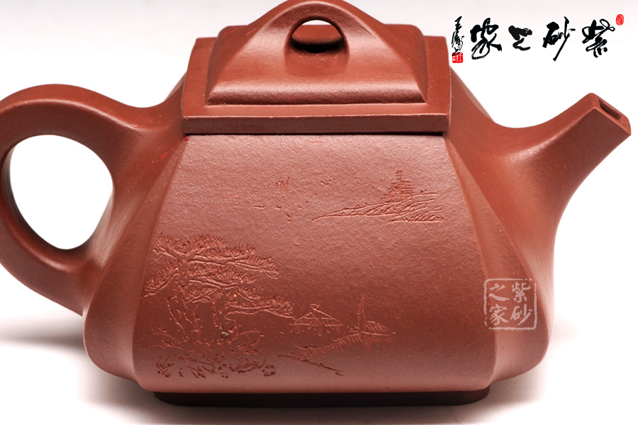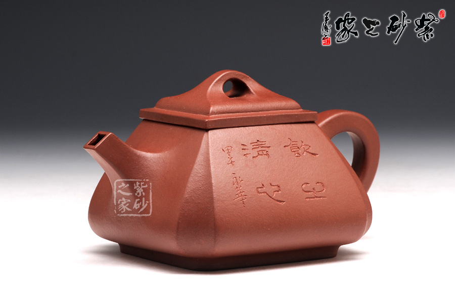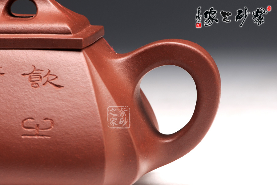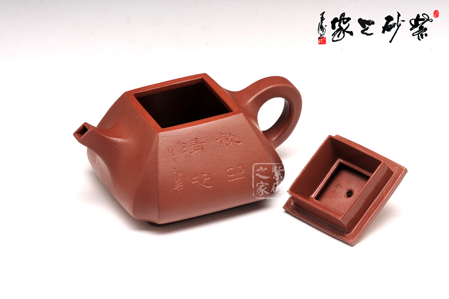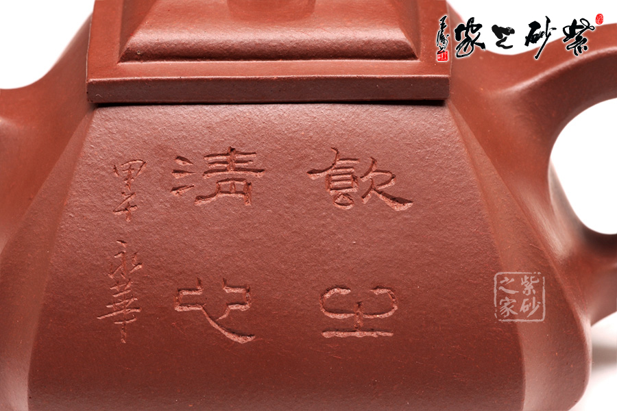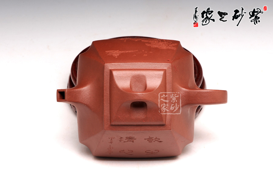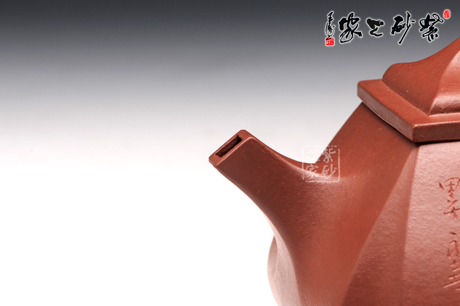 抽角均勻有致,線條均勻挺括,整個(gè)壺身方圓結(jié)合。四方壺蓋,棱角圓潤(rùn),橋形鈕溫婉而出,古樸俊逸;直流嘴方形逐漸胥出,外方內(nèi)圓,出水順暢。