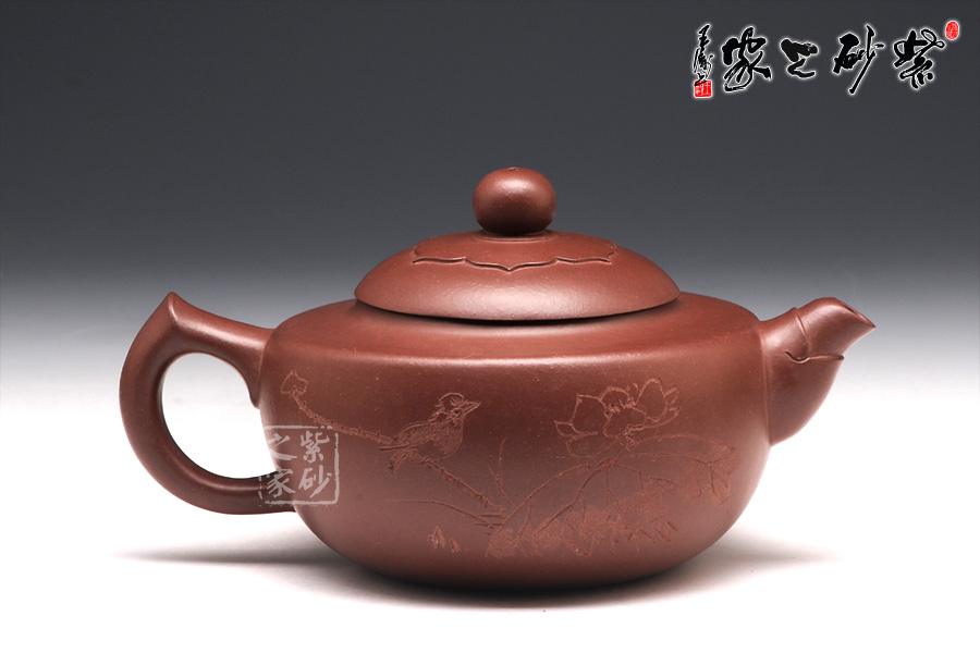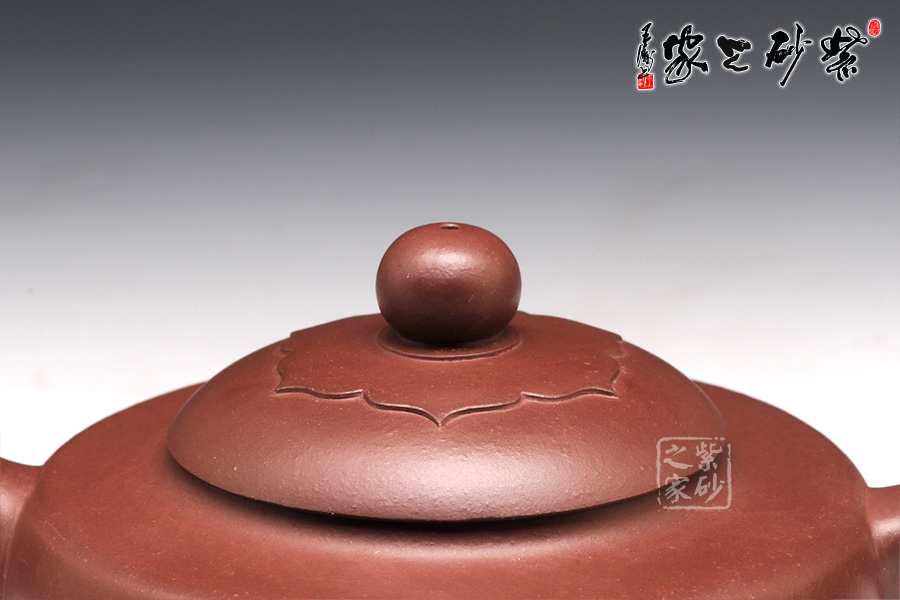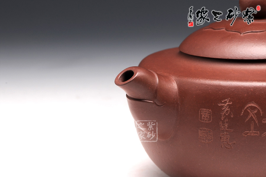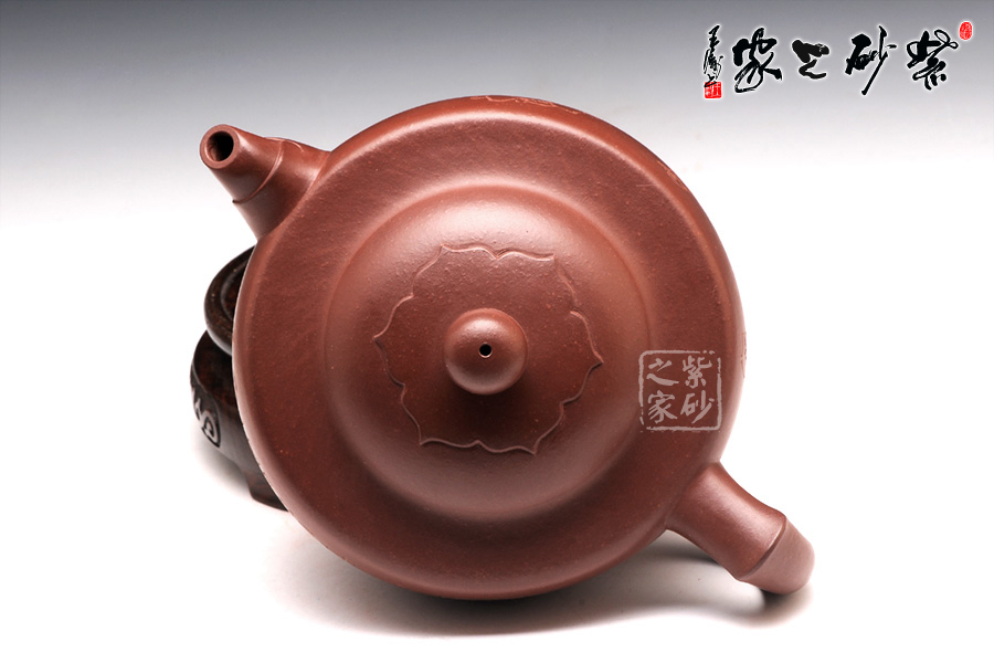 壺身為碗型,上豐下斂,飽滿圓潤。肩部平滑,壺蓋圓潤,一顆圓珠為壺鈕,精致大氣,圍繞圓珠的荷花瓣裝飾美觀自然。壺嘴直流,分層設計,似是從花瓣中伸出。壺把有方有圓,方得筆挺,圓得美妙。
