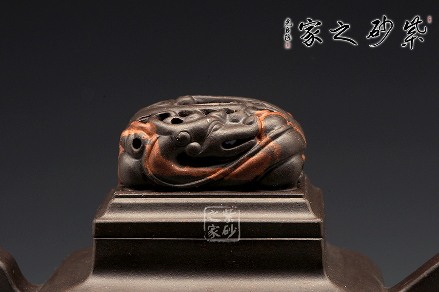 斑斕曲折的花紋,有著大理石肌理般的細膩,仿佛錦繡山河的蜿蜒秀美。酣臥盤區(qū)的神龍,有著中華民族圖騰式的精神,仿佛帝王玉璽的華蓋尊貴。這是一方“中國印”,印章篆刻與紫砂藝術(shù)的結(jié)合,通過絞泥裝飾的精細,完美展現(xiàn)了藝術(shù)情感與創(chuàng)作的交融,實現(xiàn)了大器若拙的返璞歸真。