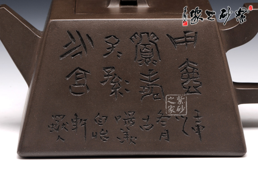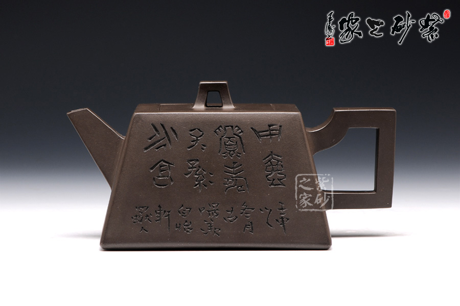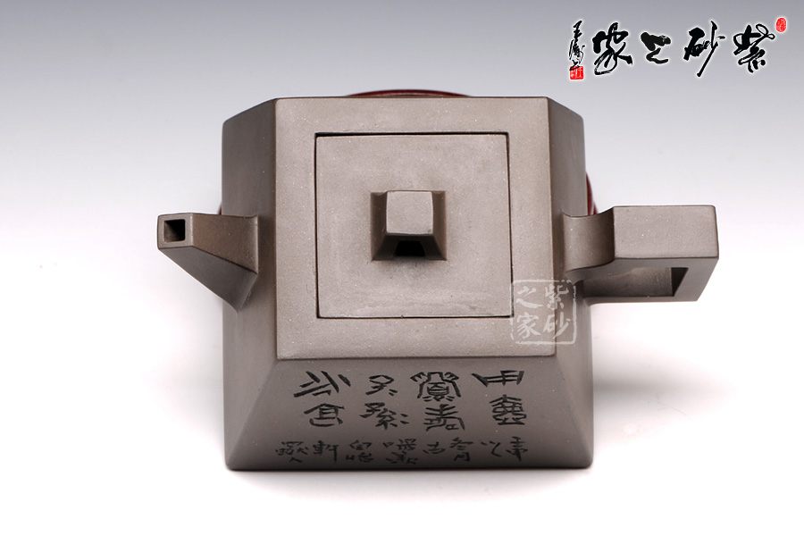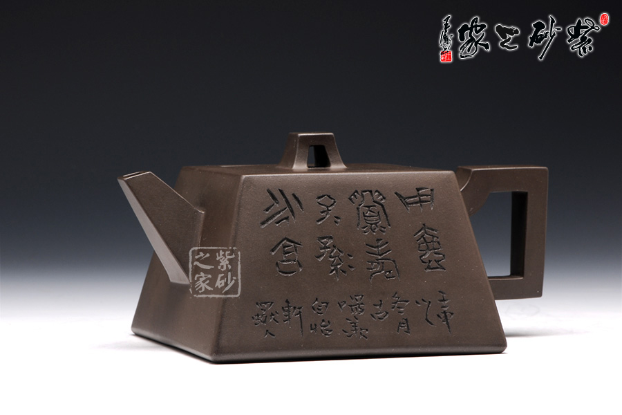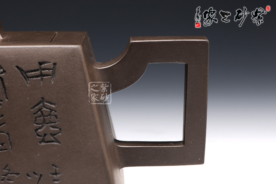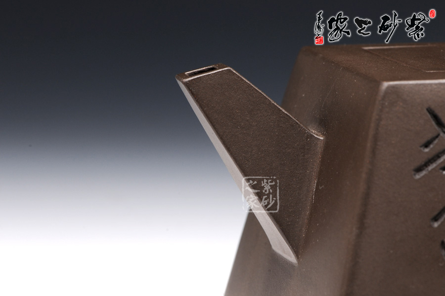 此壺用黑泥制作,色澤內(nèi)斂,深邃靜謐。以手撫之,細(xì)膩、柔潤(rùn)之中略有砂感。俯視,平整的小方蓋與大平底的輪廓線梯形變化,其蓋鈕正處于壺蓋中心的位置上,更顯示出其制作技藝的高超。嵌蓋,橋型方鈕。敦厚實(shí)在。直嘴方把,出水流利,斷水自然,握在手里,剛勁有力,氣勢(shì)雄偉。四方基底,下寬上窄,使此壺具備方壺穩(wěn)重剛強(qiáng)的優(yōu)點(diǎn),又不流于呆板單調(diào),壺鈕于壺身變化與虛實(shí)空間對(duì)應(yīng),變化出現(xiàn)剛?cè)嵯酀?jì)的美感(全手工)??傮w造型簡(jiǎn)練渾樸,寓剛挺于巧麗之中,具有時(shí)代器皿造型簡(jiǎn)樸大度的氣勢(shì),堪稱早期紫砂壺造型高雅佳作。