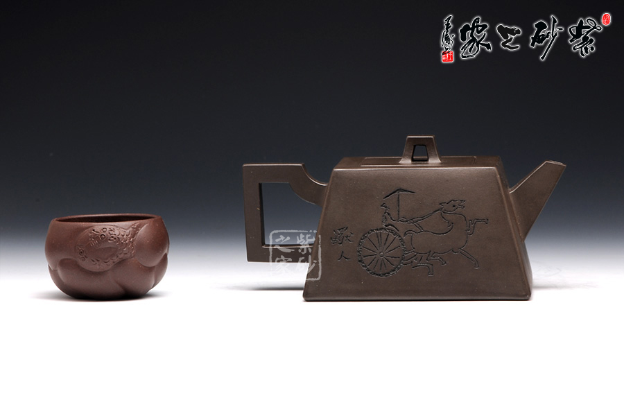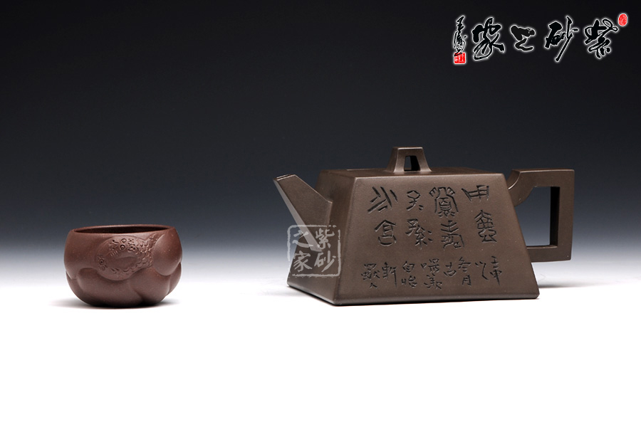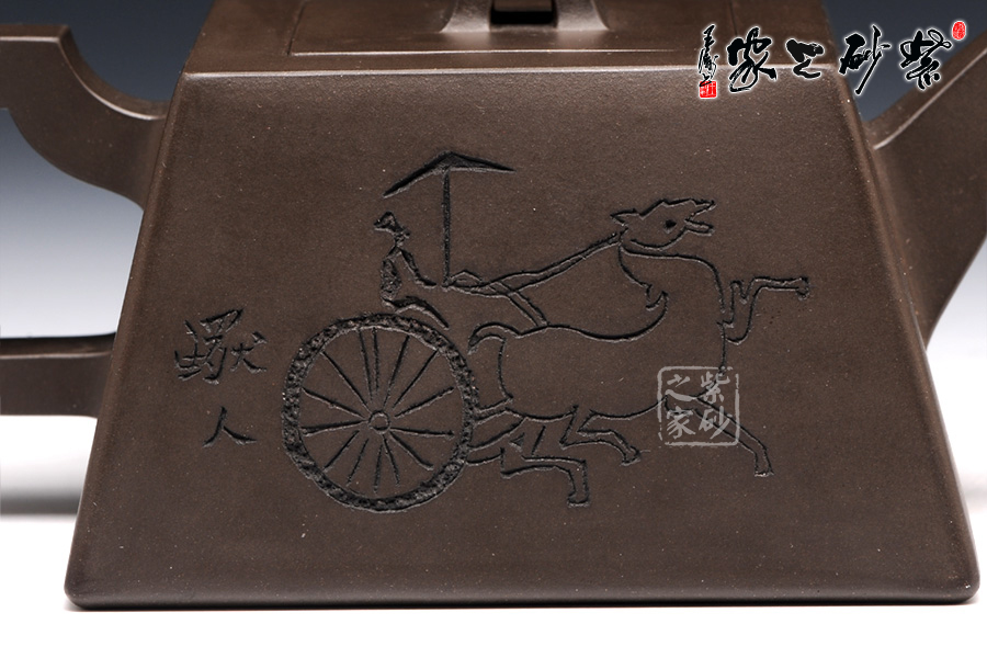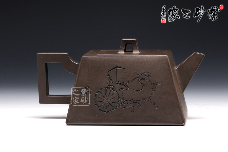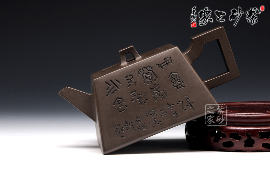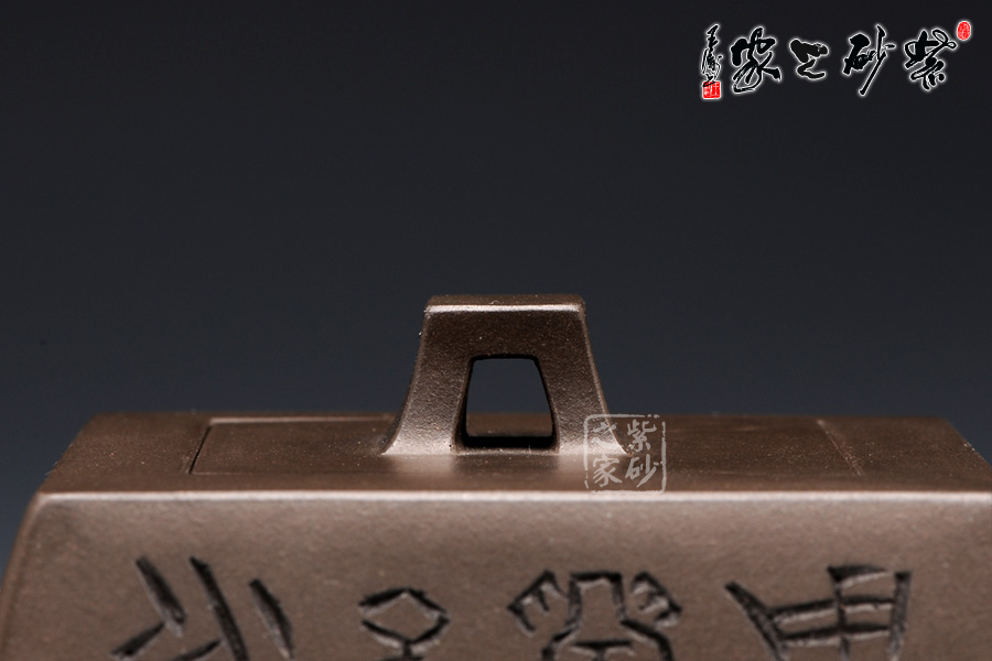此壺用黑泥制作,色澤內(nèi)斂,深邃靜謐。以手撫之,細(xì)膩、柔潤(rùn)之中略有砂感。俯視,平整的小方蓋與大平底的輪廓線梯形變化,其蓋鈕正處于壺蓋中心的位置上,更顯示出其制作技藝的高超。嵌蓋,橋型方鈕。敦厚實(shí)在。直嘴方把,出水流利,斷水自然,握在手里,剛勁有力,氣勢(shì)雄偉。四方基底,下寬上窄,使此壺具備方壺穩(wěn)重剛強(qiáng)的優(yōu)點(diǎn),又不流于呆板單調(diào),壺鈕于壺身變化與虛實(shí)空間對(duì)應(yīng),變化出現(xiàn)剛?cè)嵯酀?jì)的美感(全手工)??傮w造型簡(jiǎn)練渾樸,寓剛挺于巧麗之中,具有時(shí)代器皿造型簡(jiǎn)樸大度的氣勢(shì),堪稱早期紫砂壺造型高雅佳作。