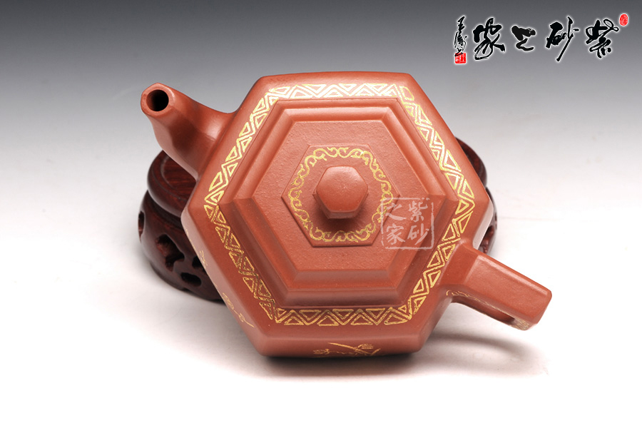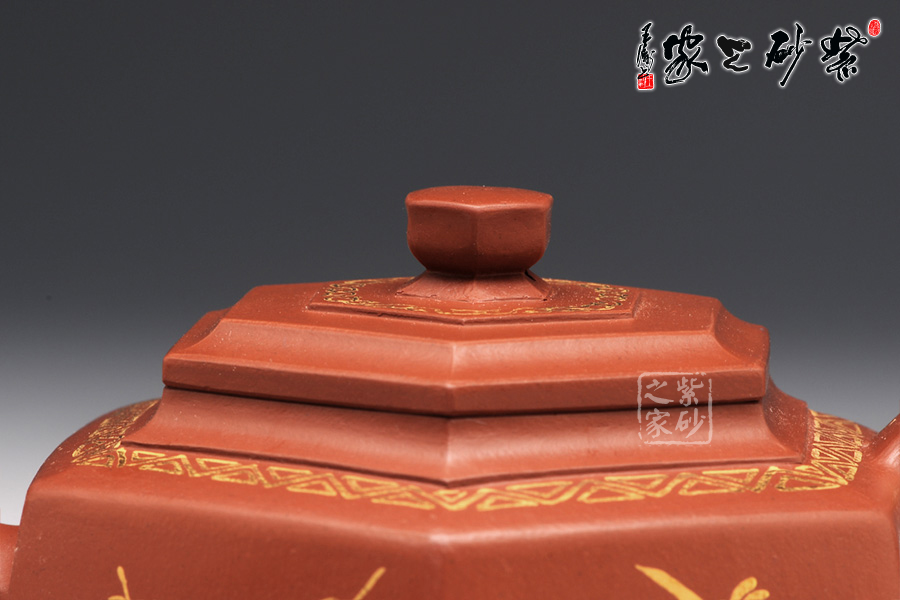 從此個(gè)壺體來(lái)看,多采用的是對(duì)比的手法,整體線條呈現(xiàn)上密下疏,這種六方壺體款式的壺由泥片銜接,而此種方法的制作難度極大,要做到恰到好處需極為細(xì)致。六方壺上下連連通,渾然一體,壺蓋與壺口配合嚴(yán)密,分毫不差,完美的展現(xiàn)了點(diǎn)線面的結(jié)合。傳統(tǒng)的器型,加上精細(xì)的工藝,方非一式,圓不相一,手感極佳,老味極濃,此壺藝術(shù)感極強(qiáng),賞用具佳。朱泥制作,色澤清雅美觀,又格外動(dòng)人。