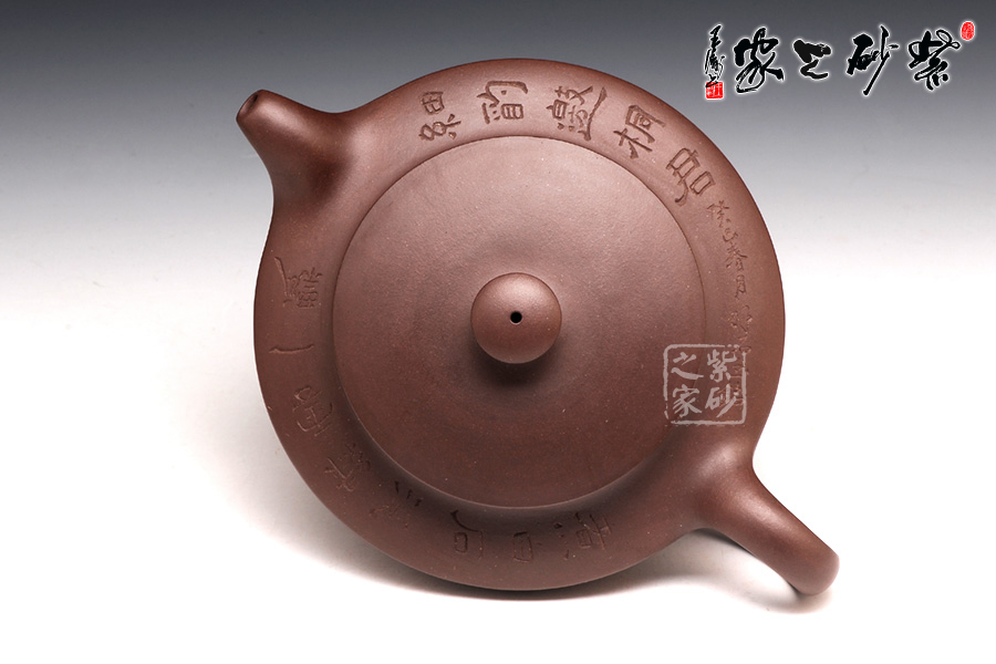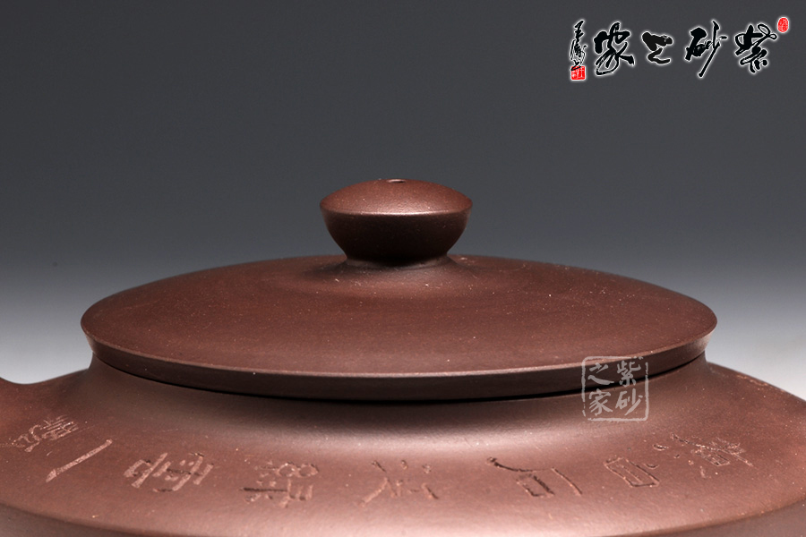 漢扁壺乃是經(jīng)典壺型,此壺是上下兩半對(duì)接而成,線面挺括,平蓋壓口,氣勢(shì)強(qiáng)悍,柱形壺鈕,簡(jiǎn)潔爽快;一彎流壺嘴俊俏自然,出水爽利,和耳形端把相應(yīng) 成趣。該壺采刻繪裝飾工藝,詩(shī)句“煮白石,泛綠云,一瓢細(xì)酌邀桐君”展現(xiàn)出的是非凡清雅的追求和意境,耐人尋味。