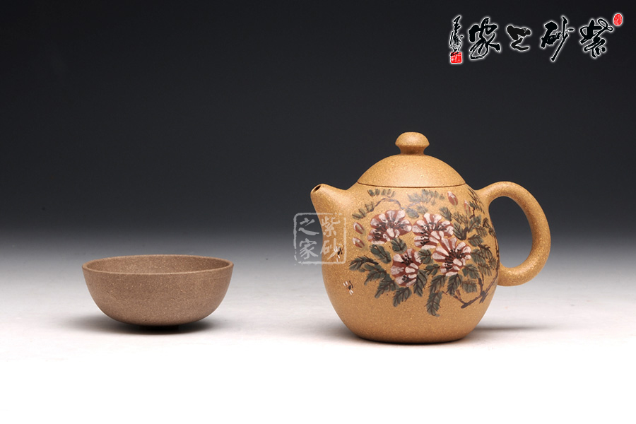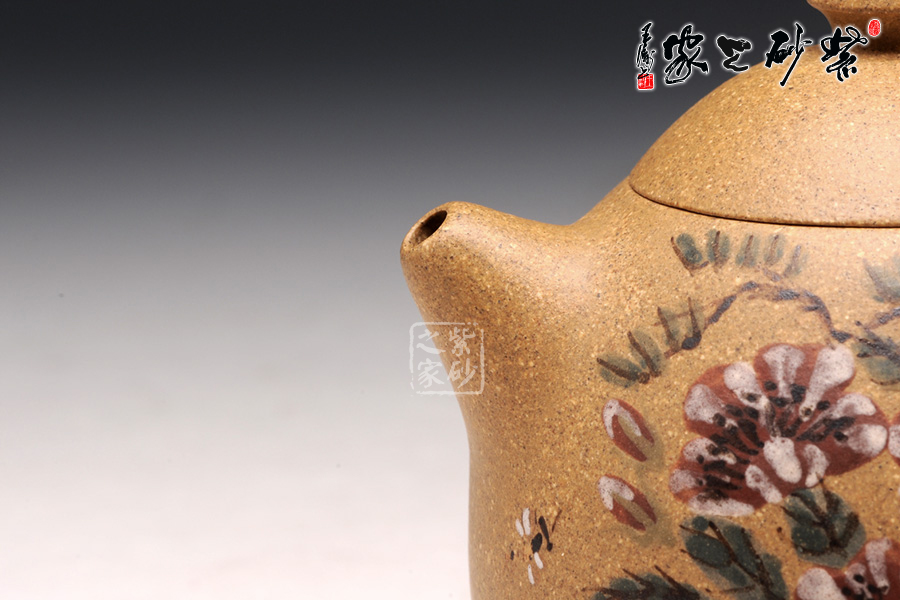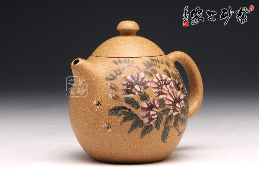 此壺為清仿制時(shí)大彬之龍蛋壺,通體狀似蛋形,截蓋,如蘑菇狀壺鈕,直錐嘴,壺嘴短而粗,出水流暢,大圈把勢(shì)與壺體趁勢(shì),耳把大而垂,手握舒適,壺體下部過(guò)渡平緩,全器平添一種拙味和稚氣的親切感。壺身采用獨(dú)特的泥繪彩繪工藝裝飾,大朵的花開(kāi)得粉艷動(dòng)人,更有蜜蜂成群飛舞。