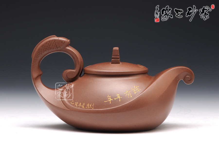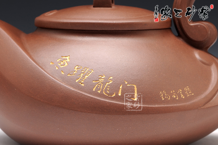 壺身正面刻繪年年有余,背面刻繪魚(yú)躍龍門(mén),金色字體由暗色壺體跳脫而出,提亮整體色調(diào),讓人眼前一亮。