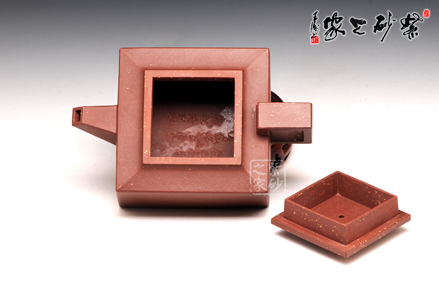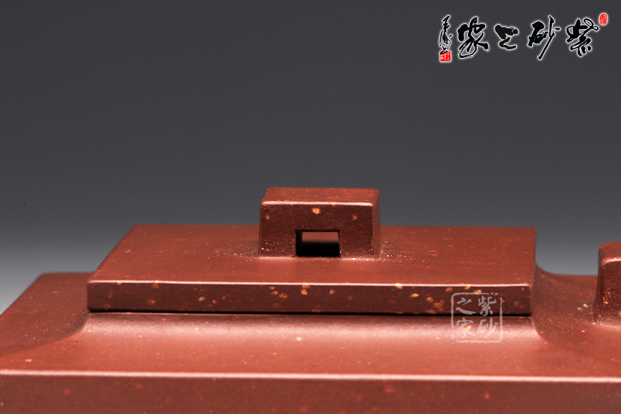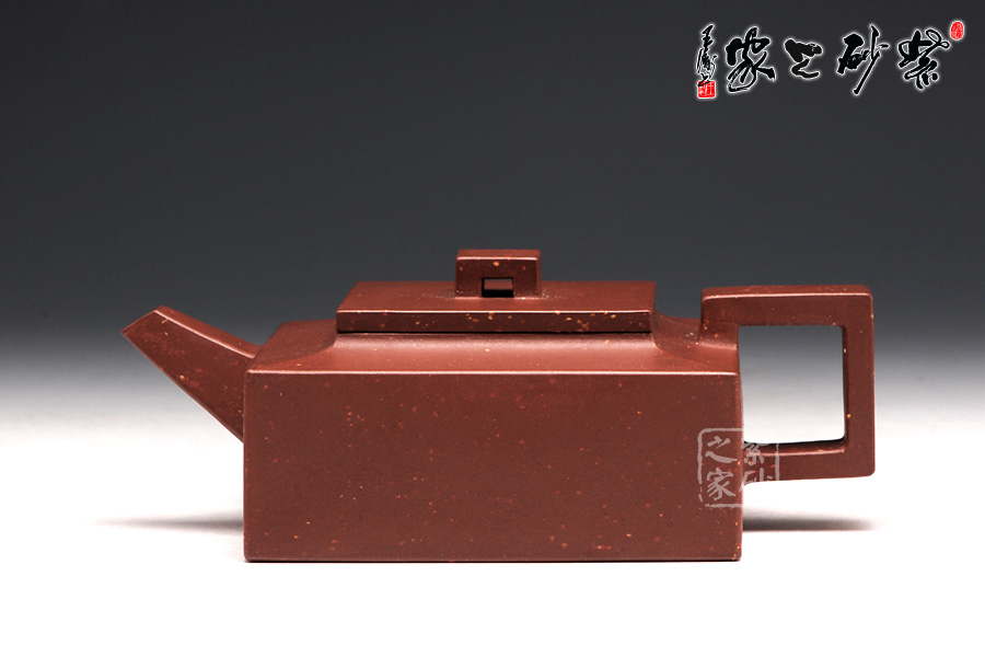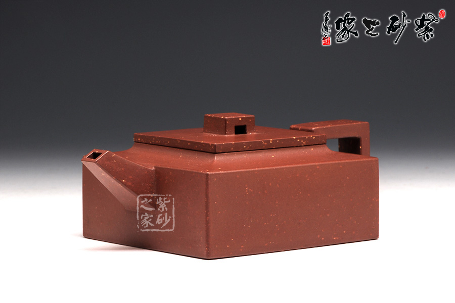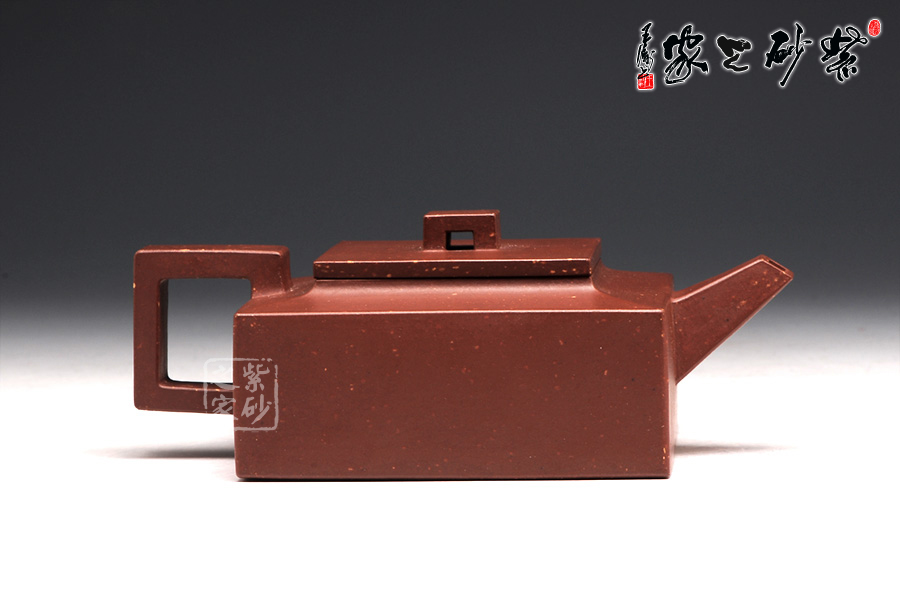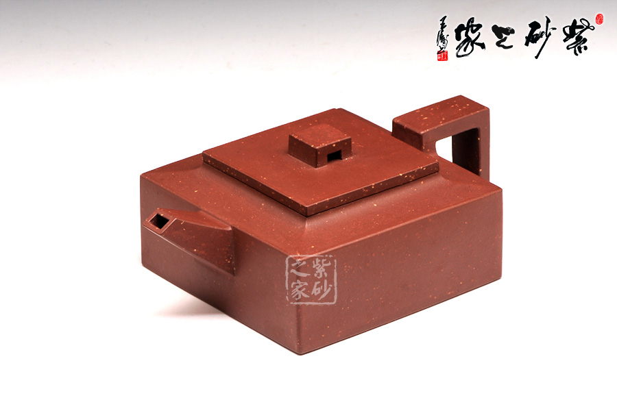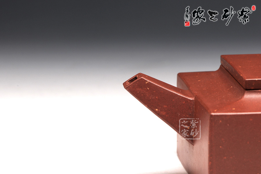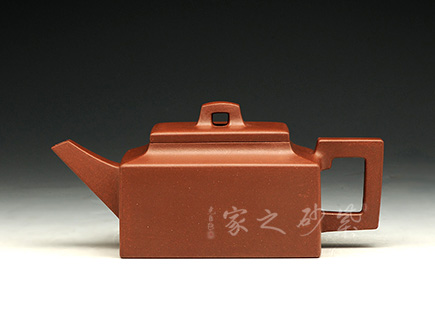 作品全部用方形展示,棱角分明,線條筆挺,絕對是逸士的最鮮明特色。壺身為長方形,壺蓋與此相同,肩部過渡有線條清晰展示,愈發(fā)明了大氣。壺鈕為四方橋型,工整自然。壺嘴雖然有粗細(xì)漸變,但同樣是四方外觀。與此對應(yīng),壺把的形態(tài)也是筆挺大氣。