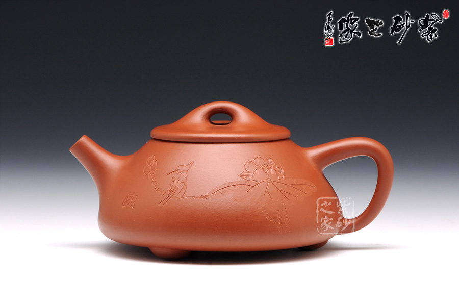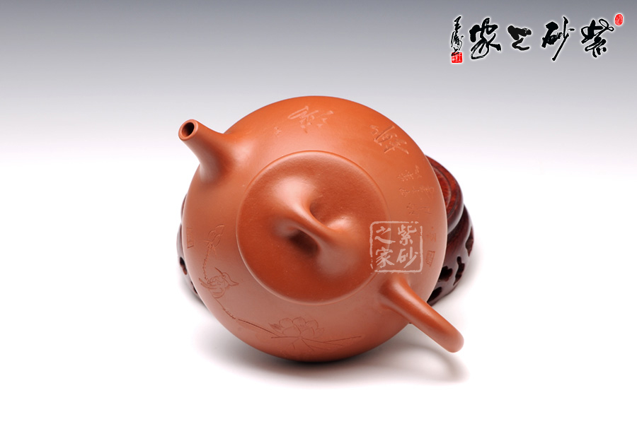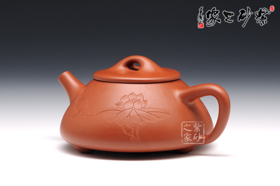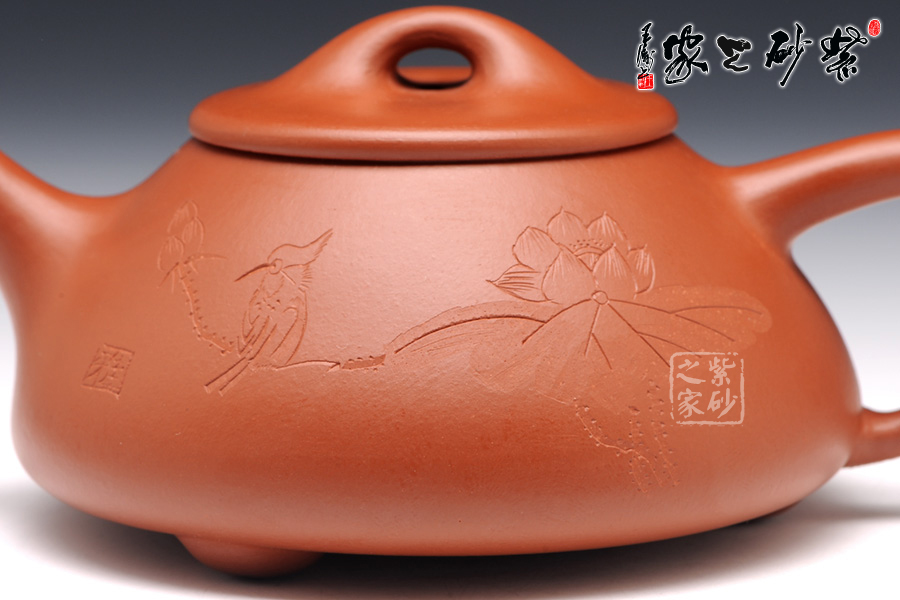 石瓢壺是經(jīng)典的老壺之一,陳洪法的此壺,造型比較經(jīng)典,圓潤光澤,雅致柔和。正面刻繪了荷花與飛鳥。荷花清雅脫俗,朵大葉茂,出淤泥而不染,濯清漣而不妖的姿態(tài)盡收眼底。一鳥坐落在含苞待放的荷花莖上,栩栩如生。背面則是“清趣”二字,字體工整端莊,秀雅脫俗。