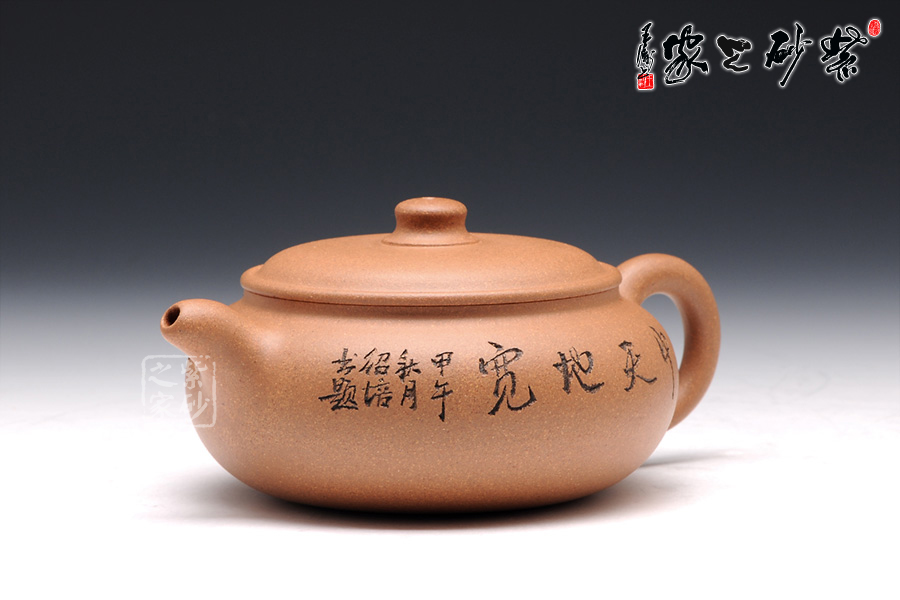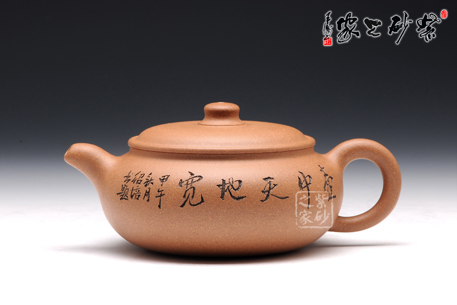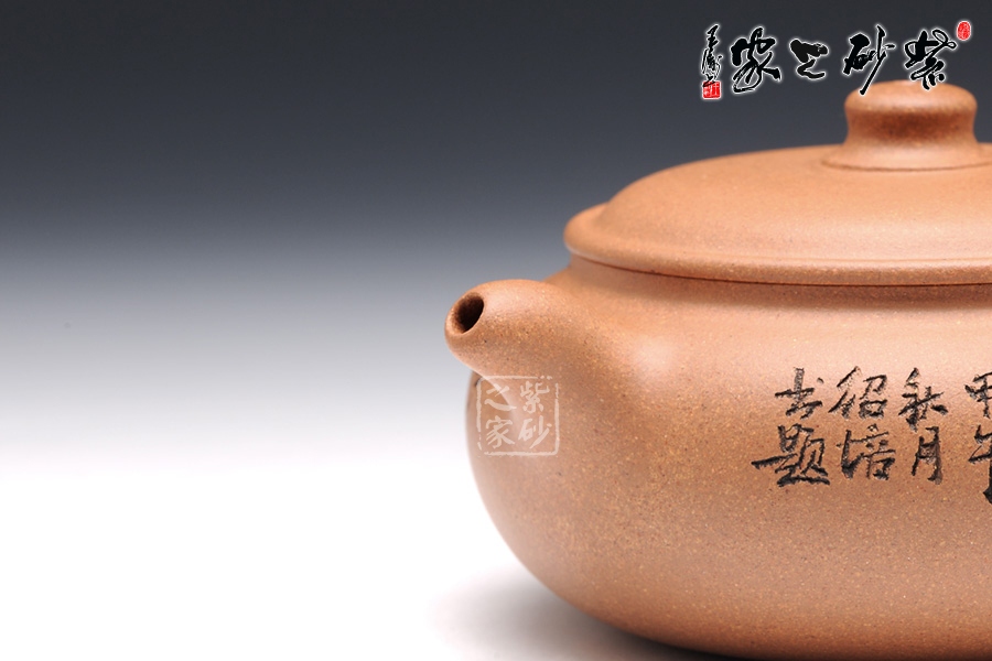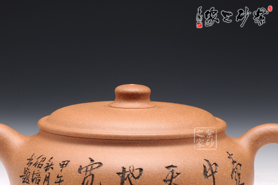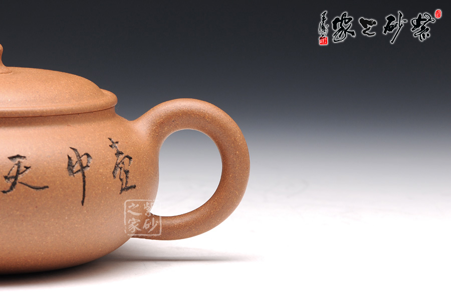 壺型極具特色,壓扁的圓球型豐滿誘人,略帶方形的工整氣息。壺蓋壓在壺身上,蓋沿圓滑精致,蓋上鼓起,正好與壺身呈上下分層的狀態(tài)。壺鈕是一顆小巧的柱形,粗細變化中顯圓滑可愛。彎流小嘴與耳形把氣勢左右貫通,細膩柔和,美得讓人回味無窮。