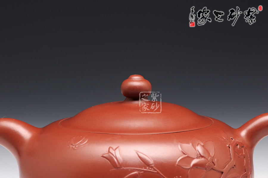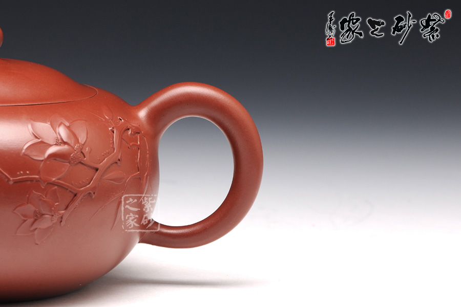 壺身是半球型,圓滑巧妙從頂部一直延伸到底端,外觀尤其飽滿(mǎn),似一顆成熟的果實(shí)。壺蓋是嵌入做法,蓋上漸次收縮鼓起,一顆圓珠壺鈕小巧別致,甚是可愛(ài)。壺嘴是彎流設(shè)計(jì),接連壺身再貫通道壺把,一脈相承的做法細(xì)膩柔和。最是獨(dú)到的在于壺身上的泥繪花朵,其外形精美逼真,花香仿佛傳來(lái)。
