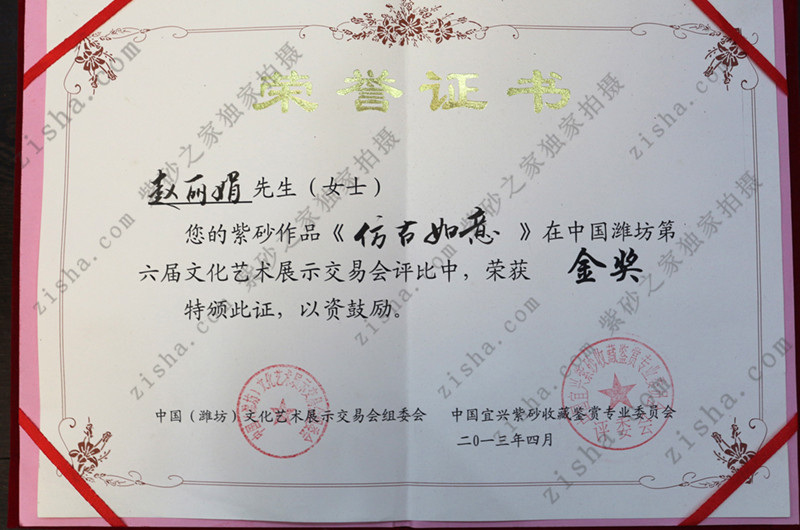 2013年4月作品《仿古如意》榮獲中國濰坊第六屆文化藝術展示交易會評比金獎