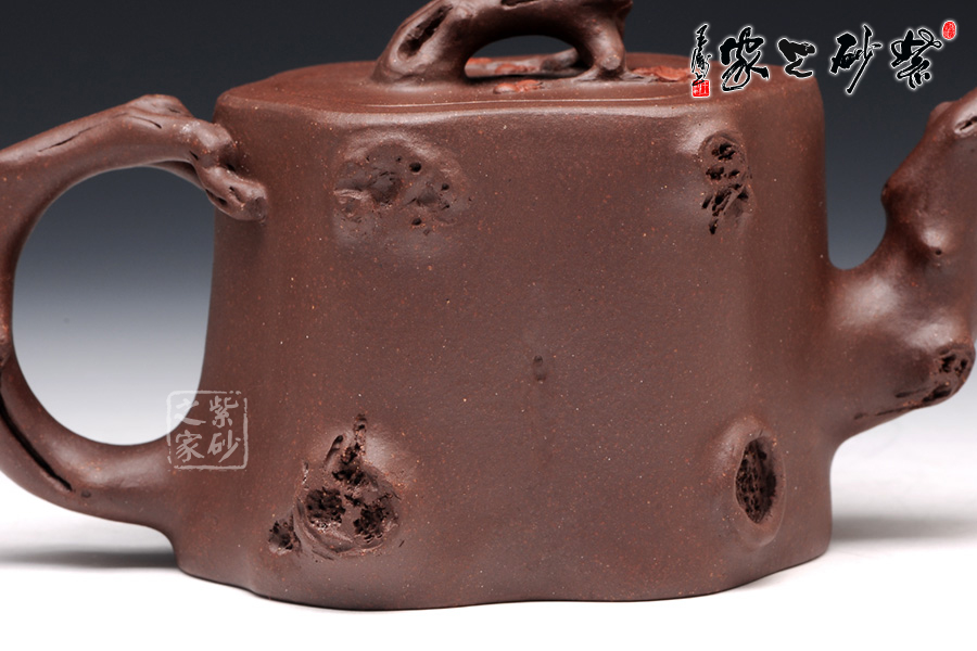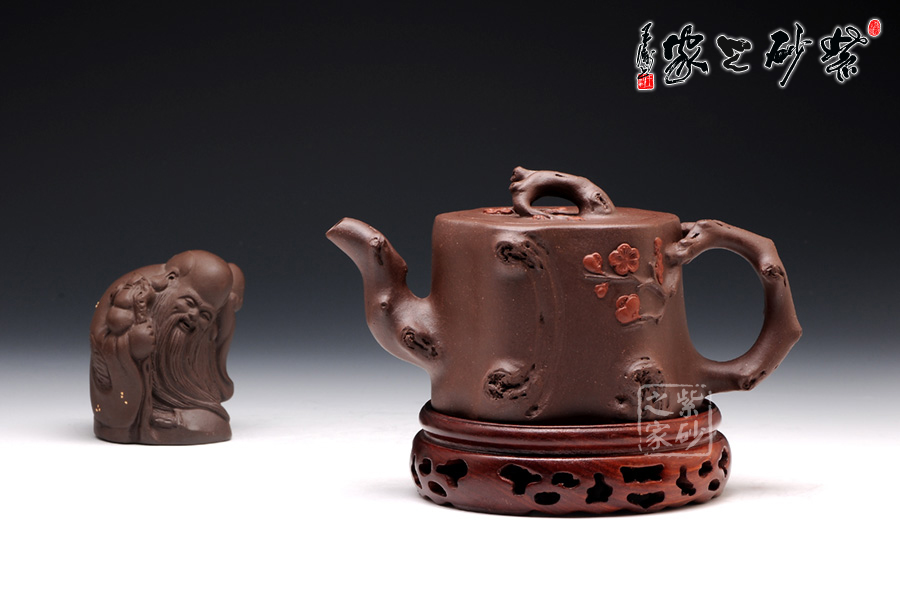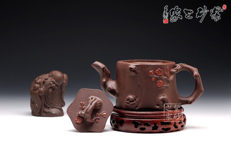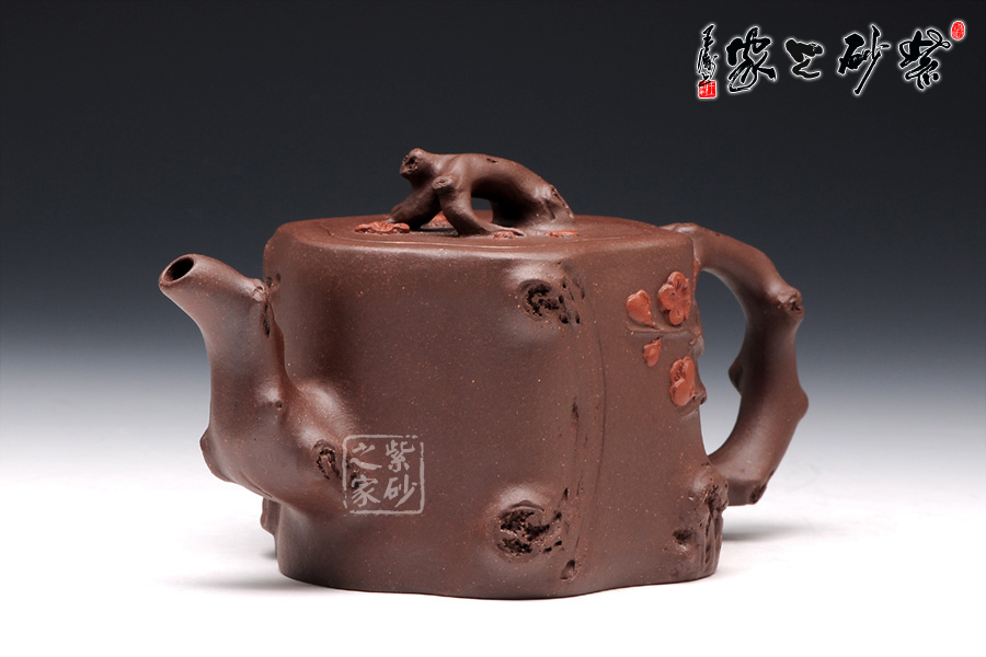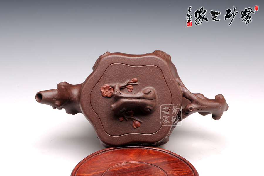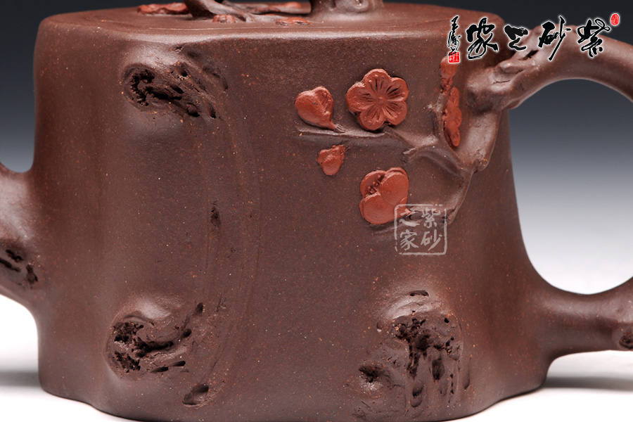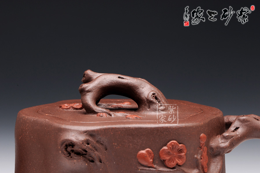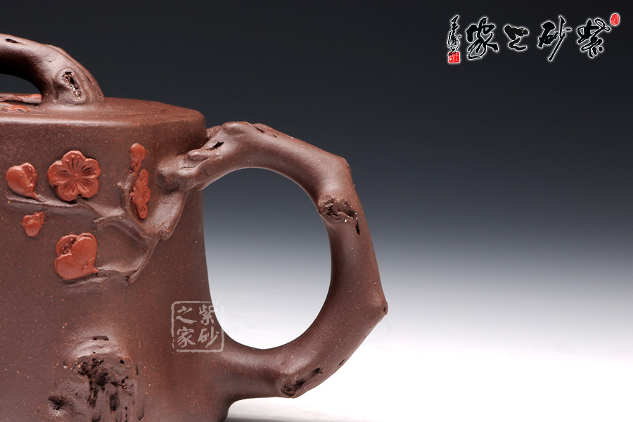 此壺選用原礦紫泥精制而成,從整體看此壺成了一件強有力的紫砂雕塑作品,以梅花燦爛綻放表現(xiàn)報春的主題,從壺身造型到創(chuàng)作原意都洋溢著無比的朝氣,讓人感到了春天來到的勃勃生機;壺身、流、把、蓋全部是用極富生態(tài)的梅樁、樹皮及纏枝組成,形態(tài)自然而富含力度;壺上梅花采用堆花技藝手法,壺嘴壺把為梅樁衍生出的枝干,伸展自然,有如自然長成,仿生性極強,充滿了生命的活力;壺把和壺鈕處胥出梅花,疏影橫斜、暗香動人;壺身融圓、壺足挺立,壺蓋穹窿,整體制作到位,此壺做工精細,氣度非凡,實用性觀賞性都很好,是把玩收藏之佳作!