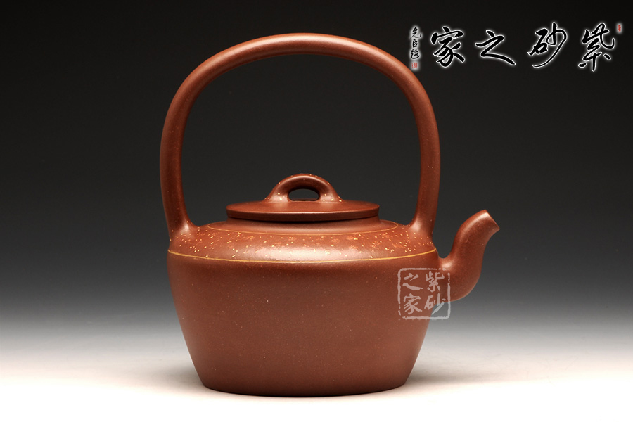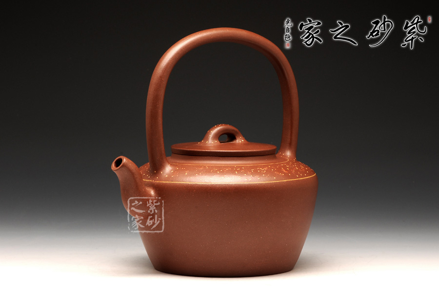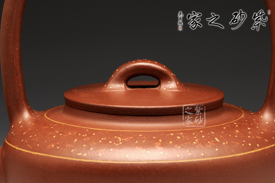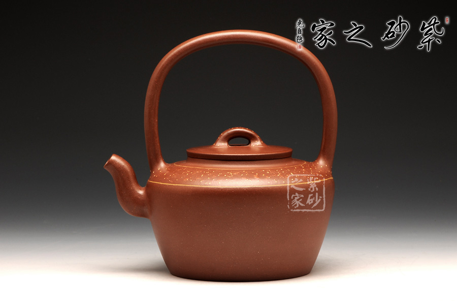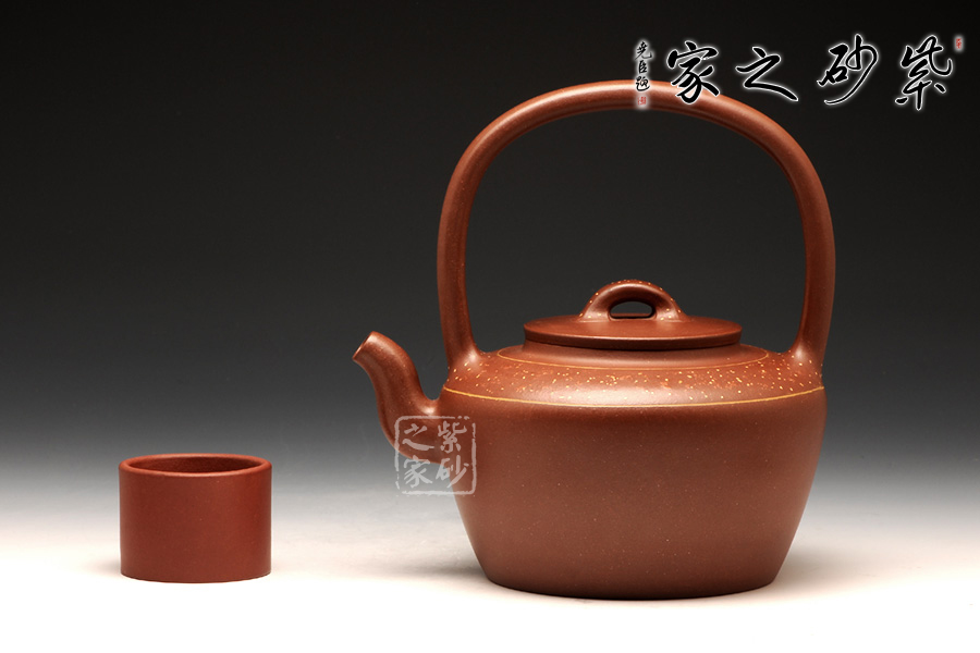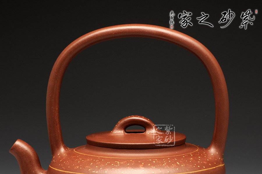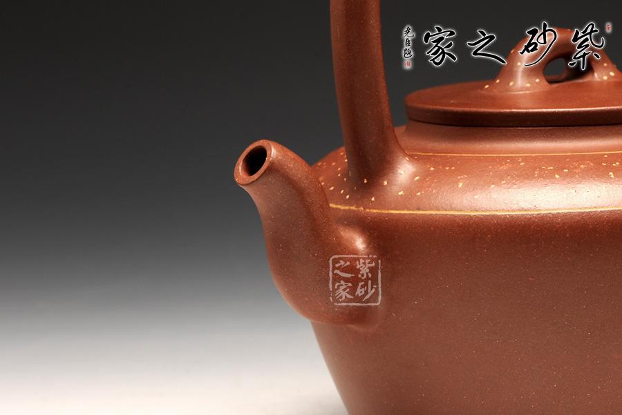 此壺精選原礦底槽清制作而成,手感溫潤細(xì)致;同時,作為一把別致的提梁壺,提梁工整拿捏恰到好處。整款壺透露著端莊、古樸的感覺,極具欣賞、收藏價值;此壺壺身與提梁比例各占一半,整款壺由上至下形成梯形狀,中間的平蓋恰到好處,高高的橋鈕好似如意給人吉祥,鈕孔半月狀甚是富有情趣;三彎嘴蜿蜒而出,出水不含糊。最后此壺點睛之筆壺肩出加以點點鋪砂,極富紫砂魅力!