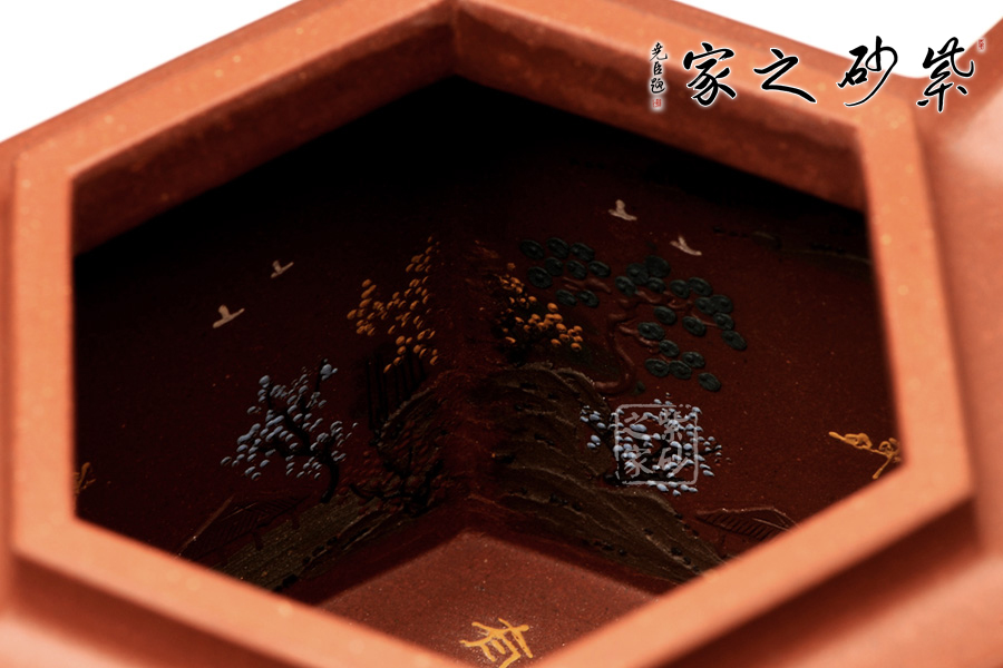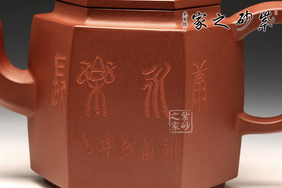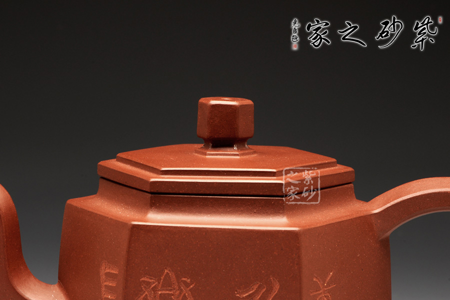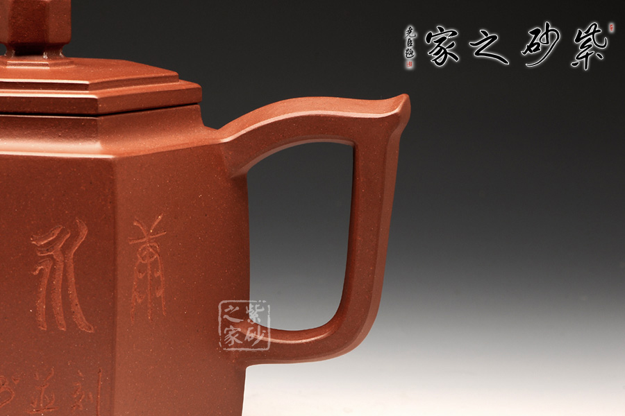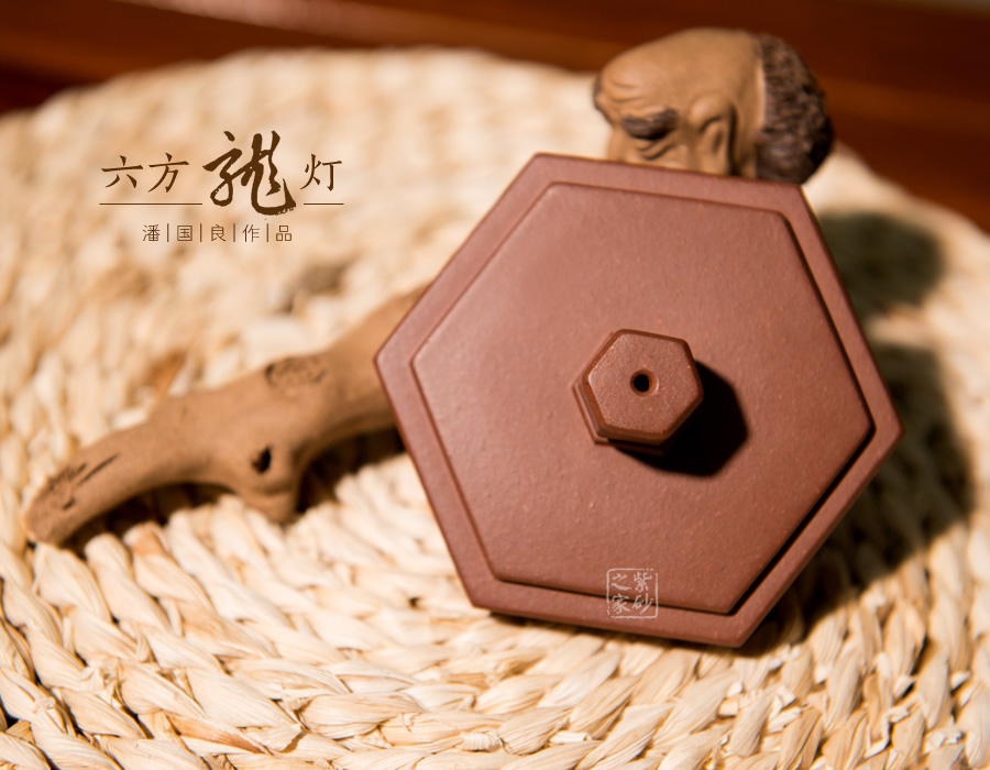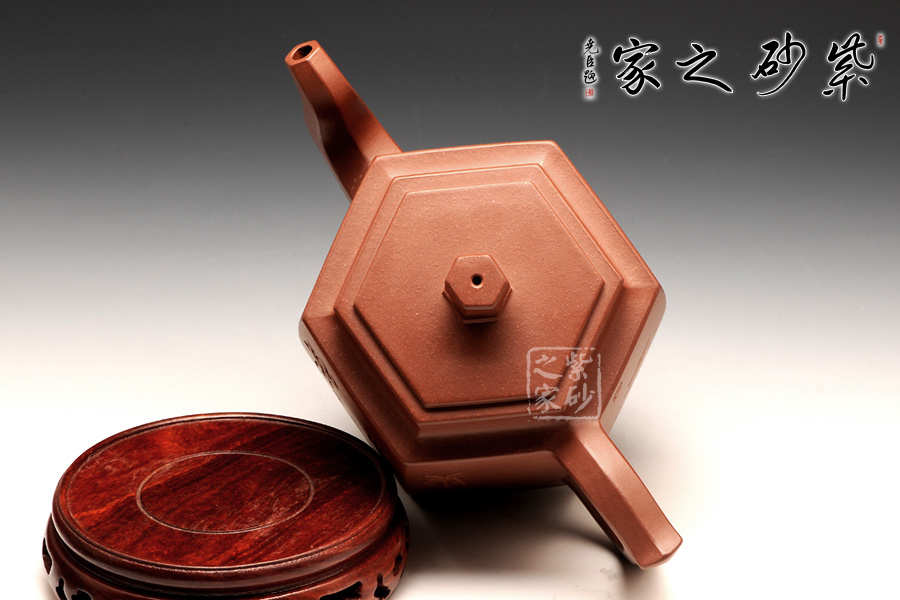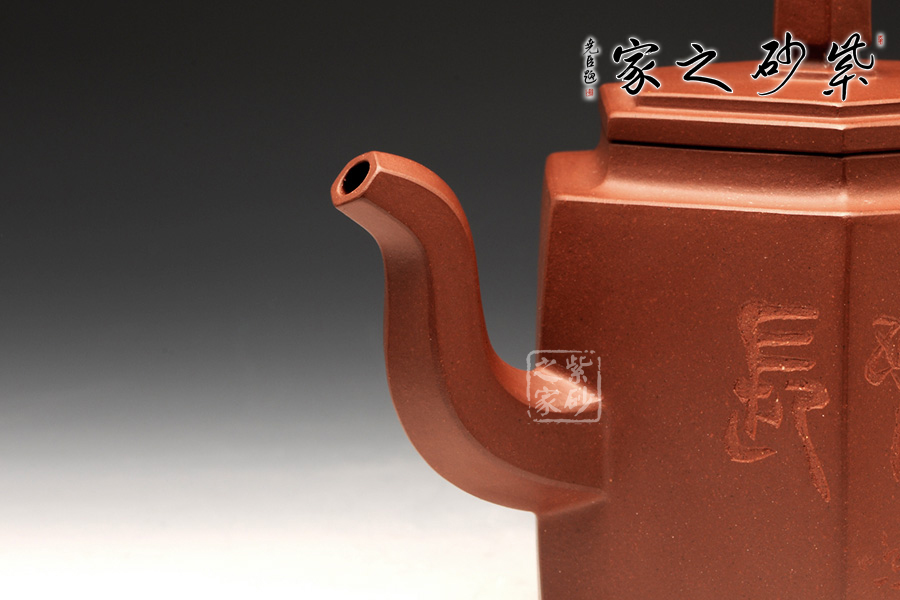 壺身是六方工整的直筒,切面平滑,線條筆挺。略微突出的輪廓線的尤其豐滿,仿佛壺內(nèi)有超然氣勢噴薄欲出。肩部以上是層次過渡,階梯狀收斂,六方形漸次變?yōu)樾∏傻膲剽o,精致美妙。三彎流壺嘴線條細(xì)長柔美,六方裝飾更顯挺拔。方形飛把氣勢不凡,留出一尾韻味無窮。