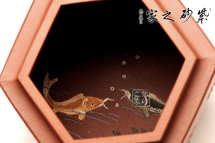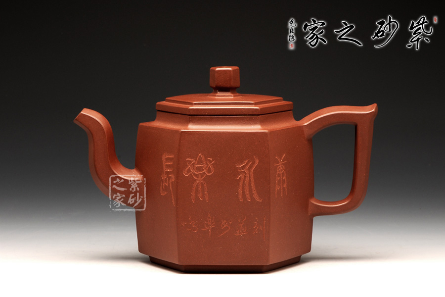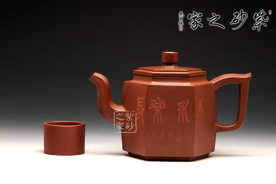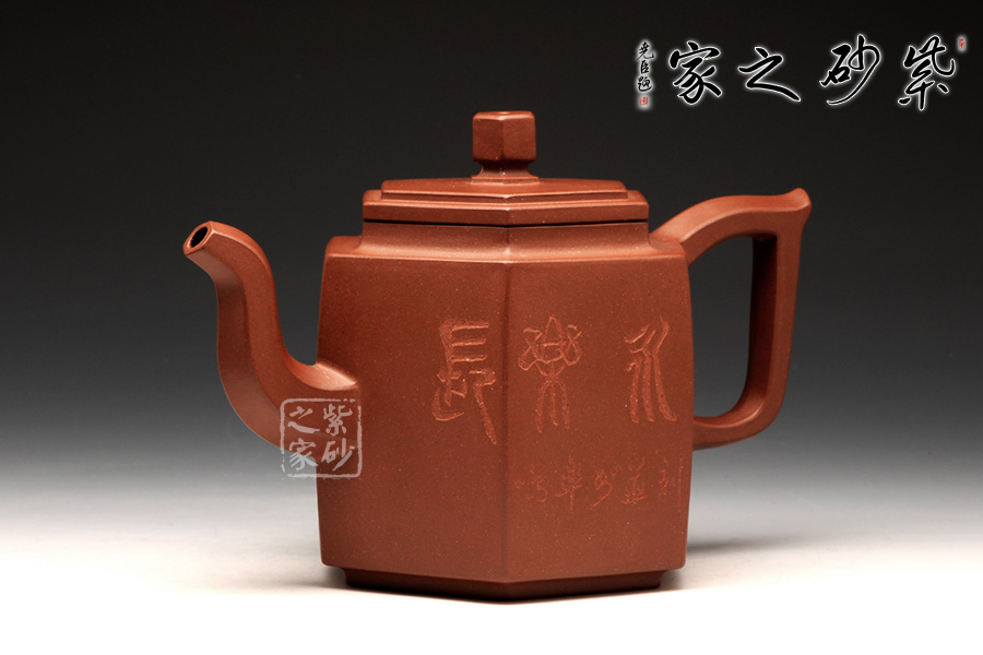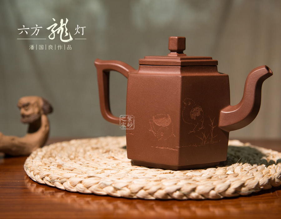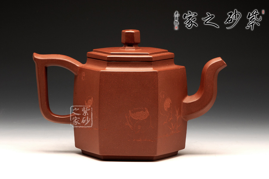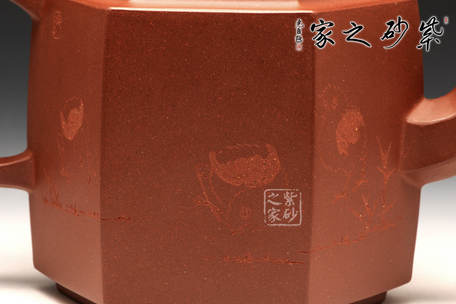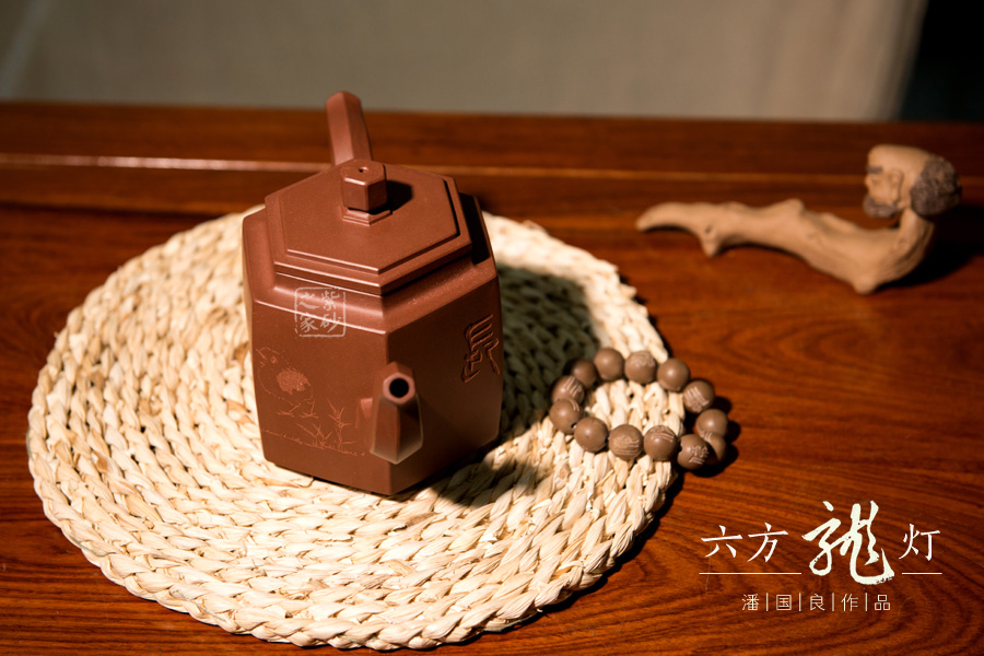 壺身是六方工整的直筒,切面平滑,線條筆挺。略微突出的輪廓線的尤其豐滿,仿佛壺內(nèi)有超然氣勢噴薄欲出。肩部以上是層次過渡,階梯狀收斂,六方形漸次變?yōu)樾∏傻膲剽o,精致美妙。三彎流壺嘴線條細(xì)長柔美,六方裝飾更顯挺拔。方形飛把氣勢不凡,留出一尾韻味無窮。