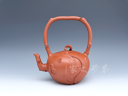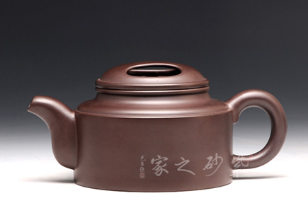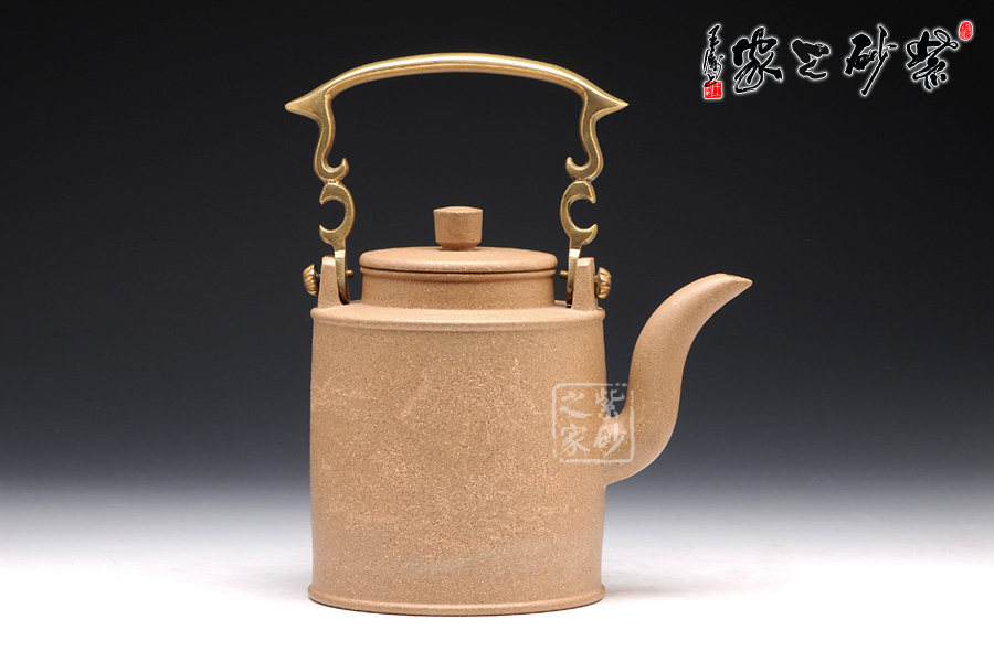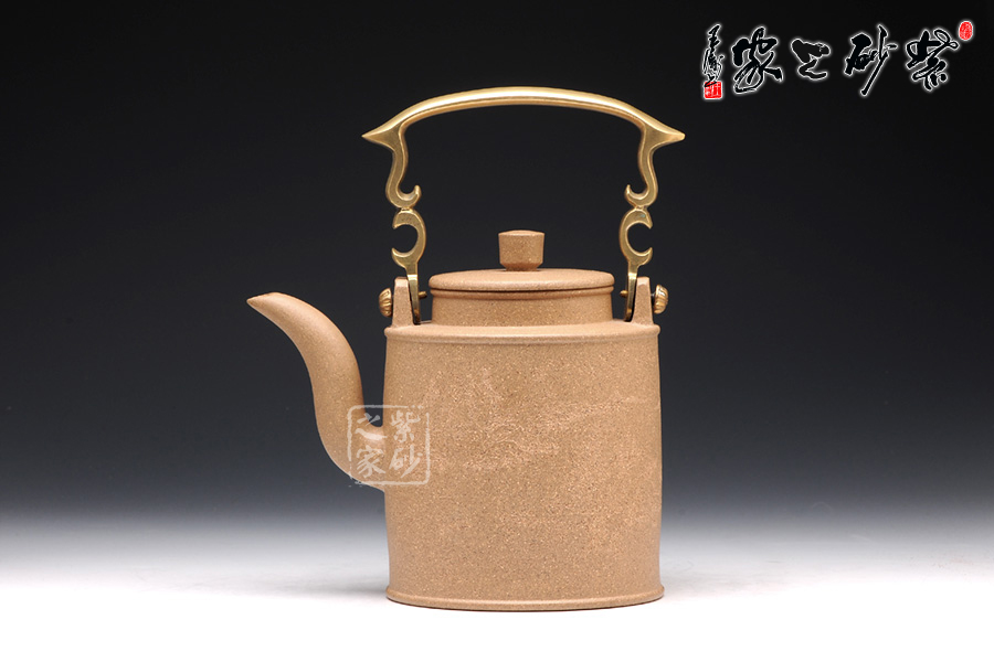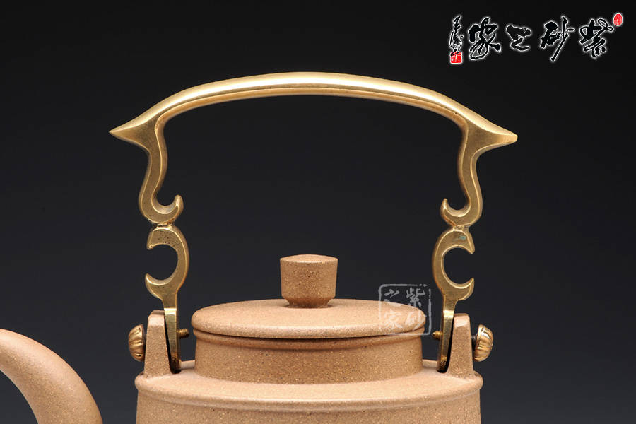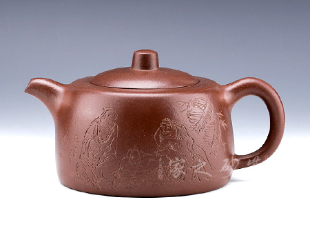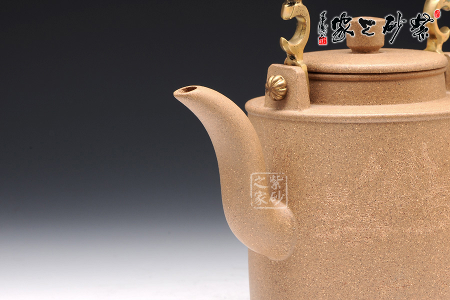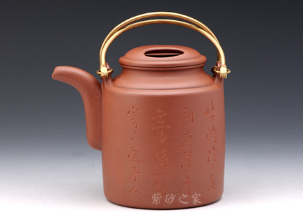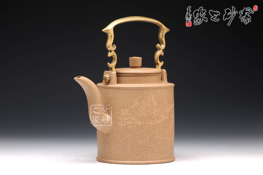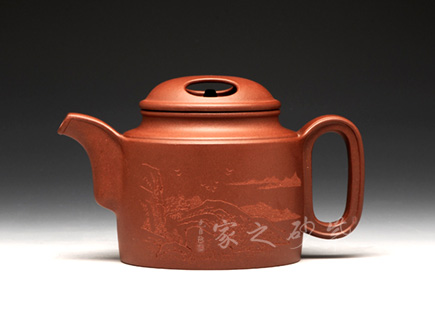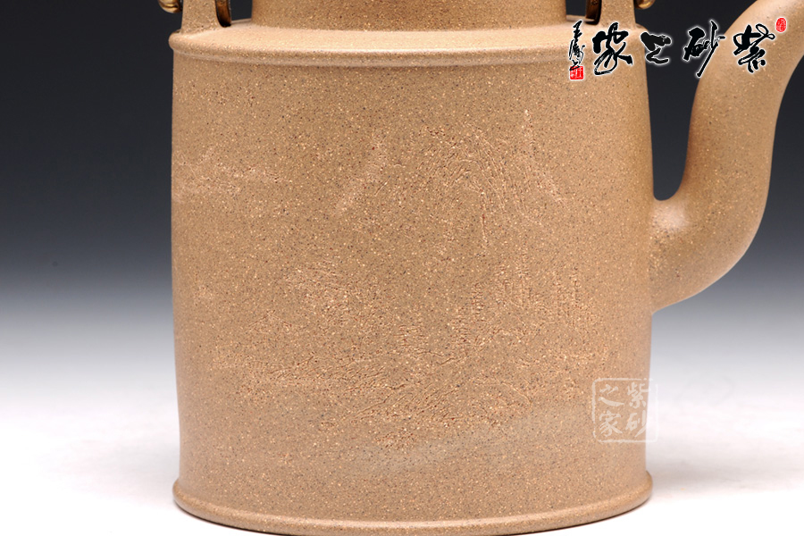 洋桶為經(jīng)典款式,但此作推陳出新,倒是新奇。該壺壺身挺拔高俊,酷似洋桶。細(xì)觀此壺,有四大亮點(diǎn),引人入勝。銀質(zhì)提梁,耀眼奪目,和壺身泥質(zhì)形成鮮明的對(duì)比,營(yíng)造了一種良好的視覺(jué)效果。傳統(tǒng)的牛蓋不用,到是更加古樸端莊的壓蓋圓鈕式。壺嘴不同于普通的三彎流,獨(dú)特的設(shè)計(jì),憨厚質(zhì)樸,和壺身相應(yīng)成趣。壺身采用刻繪裝飾壺工藝,山水景色環(huán)繞壺身,配合段泥更顯朦朧。