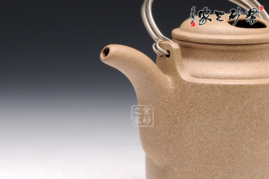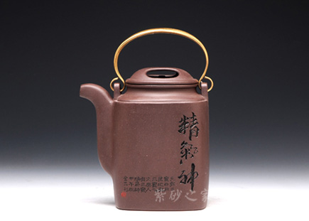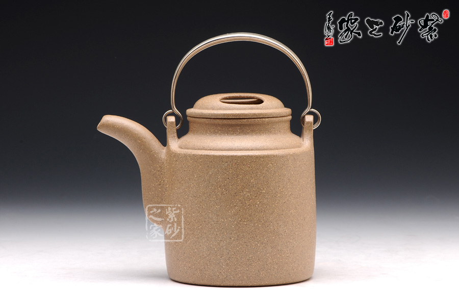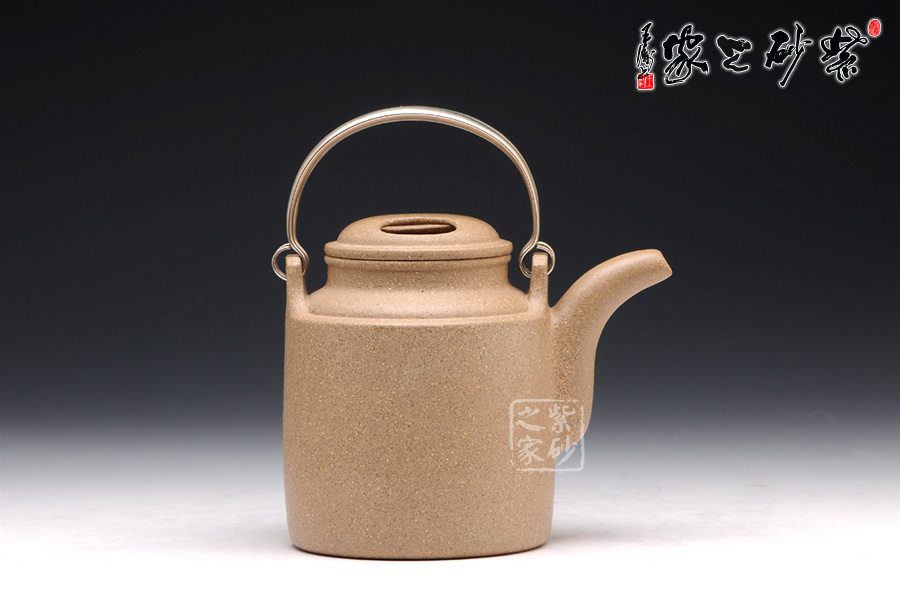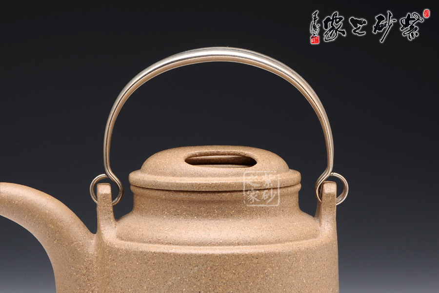 該壺壺身挺拔高俊,酷似洋桶。細(xì)觀此壺,有四大亮點(diǎn),引人入勝。銀質(zhì)提梁,耀眼奪目,和壺身泥質(zhì)形成鮮明的對比,營造了一種良好的視覺效果。壺蓋采用牛蓋式設(shè)計(jì),美觀精巧。壺嘴不同于普通的三彎流,獨(dú)特的設(shè)計(jì),憨厚質(zhì)樸,和壺身相應(yīng)成趣。