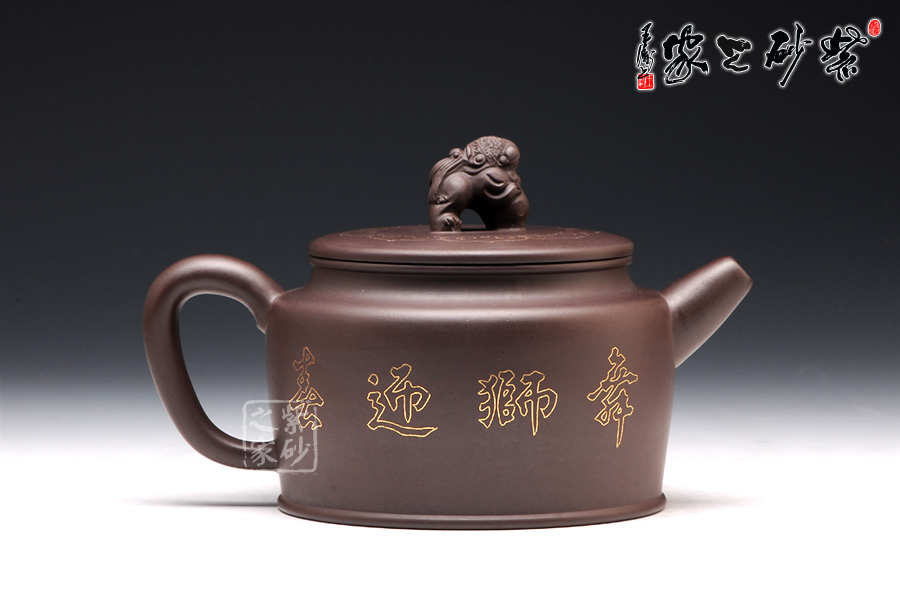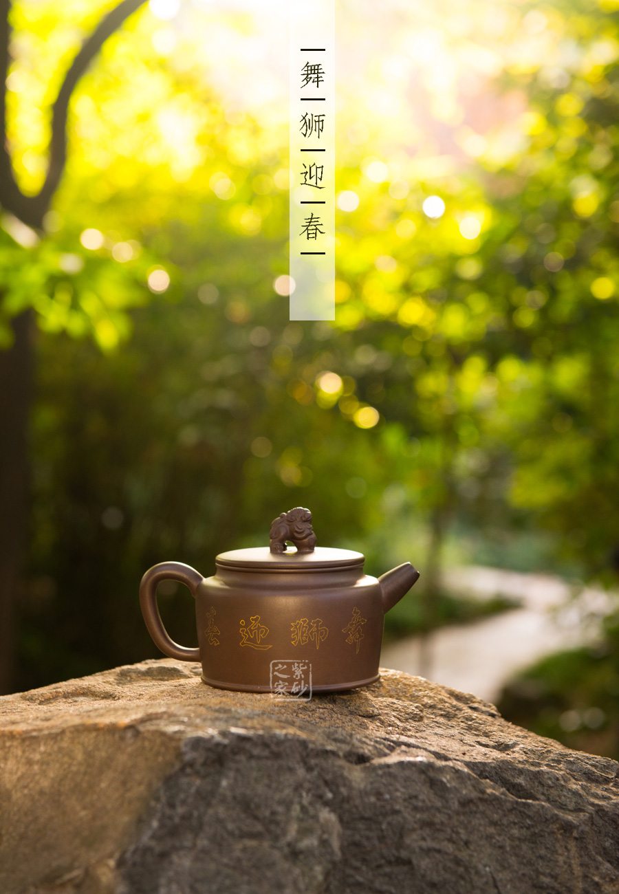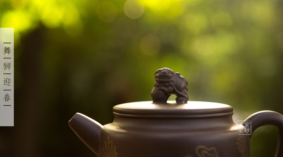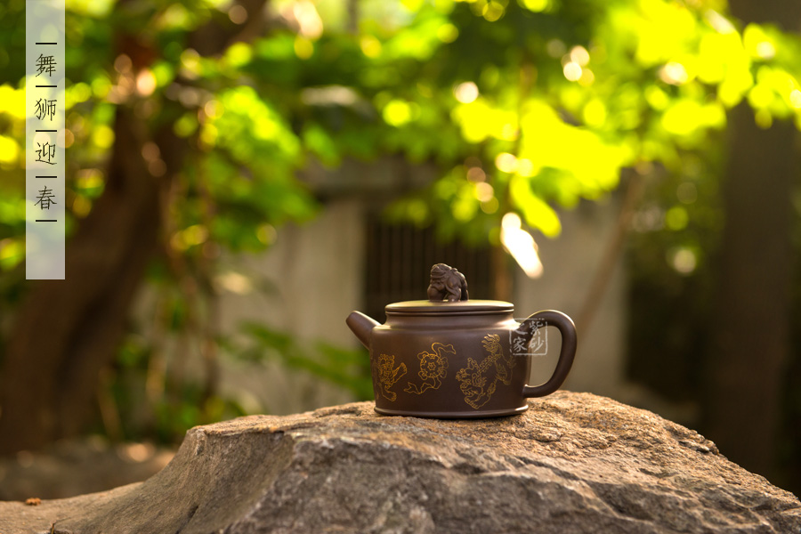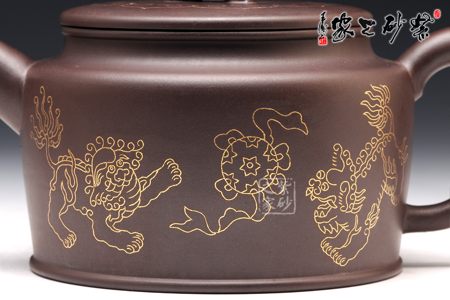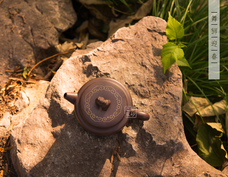 壺身上下呈圓柱形,底部加圈足,更穩(wěn)重實在。肩部過渡自然,收于壺頸,迎字母蓋設計,對仗工整。平整壺蓋上用描金裝飾,如意線條讓人心生喜歡。蓋上的獅子壺鈕,造型生動傳神,踩著繡球,更讓人心中難舍。壺嘴和壺把造型簡練,不加修飾。壺身兩面的描金最是寶貴,一面是兩只獅子戲耍彩球,另一面是“舞獅迎春”四個鑲金字,吉慶祥瑞,非常有趣。