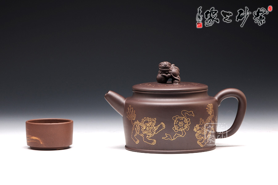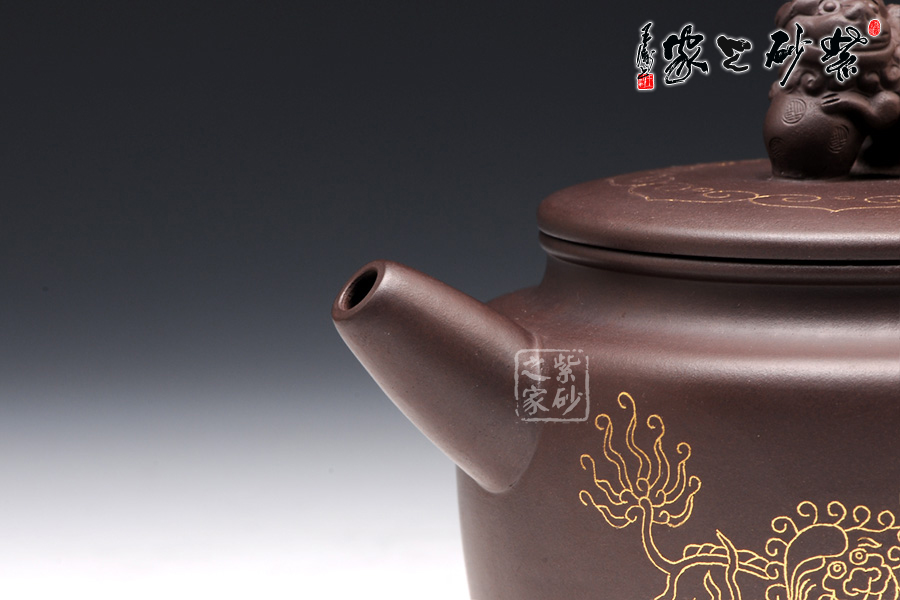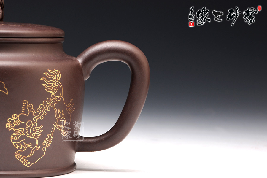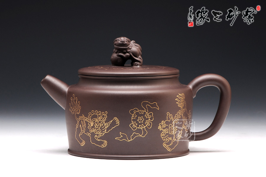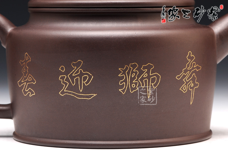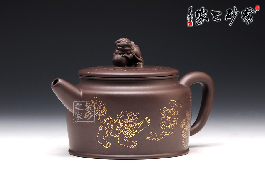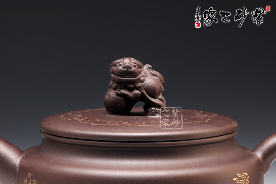 壺身上下呈圓柱形,底部加圈足,更穩(wěn)重實在。肩部過渡自然,收于壺頸,迎字母蓋設計,對仗工整。平整壺蓋上用描金裝飾,如意線條讓人心生喜歡。蓋上的獅子壺鈕,造型生動傳神,踩著繡球,更讓人心中難舍。壺嘴和壺把造型簡練,不加修飾。壺身兩面的描金最是寶貴,一面是兩只獅子戲耍彩球,另一面是“舞獅迎春”四個鑲金字,吉慶祥瑞,非常有趣。