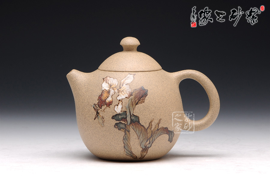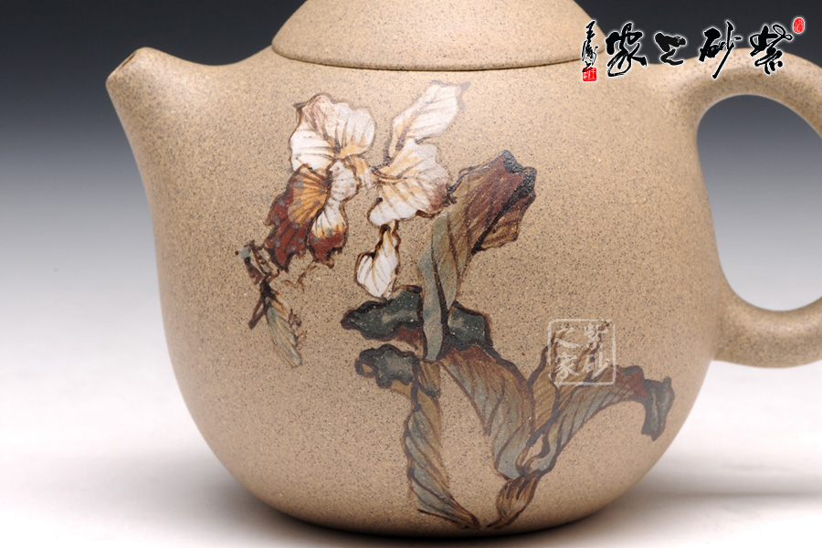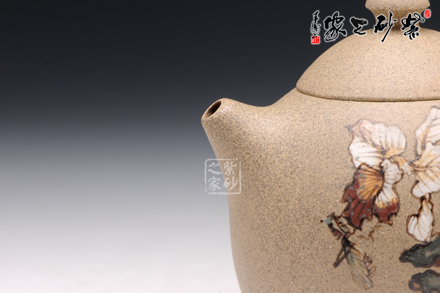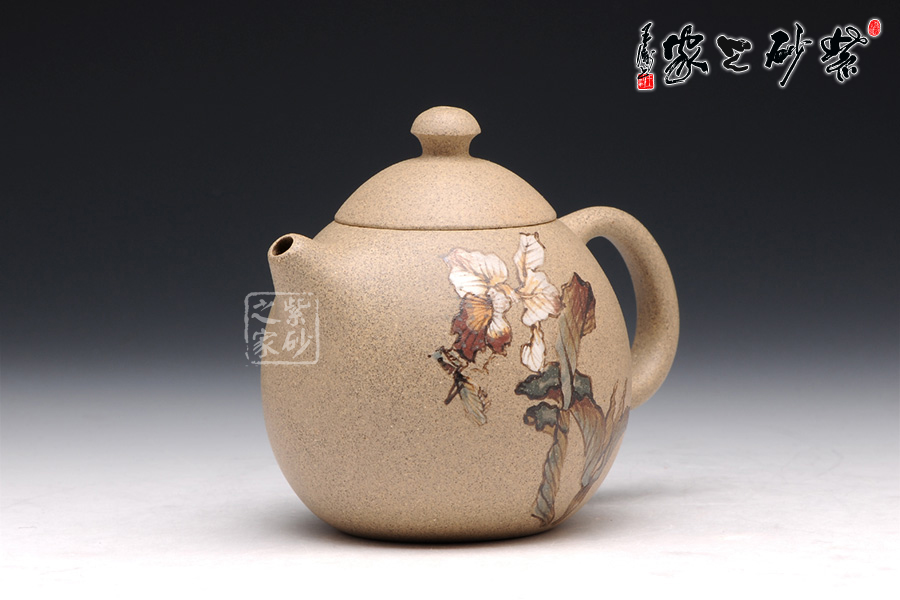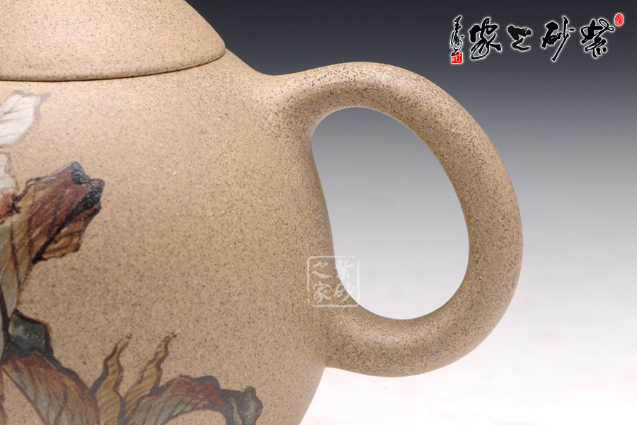 此壺為清仿制時(shí)大彬之龍蛋壺,通體狀似蛋形,截蓋,如蘑菇狀壺鈕,直錐嘴,壺嘴短而粗,出水流暢,大圈把勢與壺體趁勢,耳把大而垂,手握舒適,壺體下部過渡平緩,全器平添一種拙味和稚氣的親切感。壺身采用獨(dú)特的泥繪工藝裝飾,潔白的花開得粉艷動(dòng)人。
