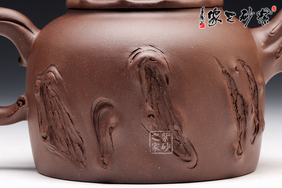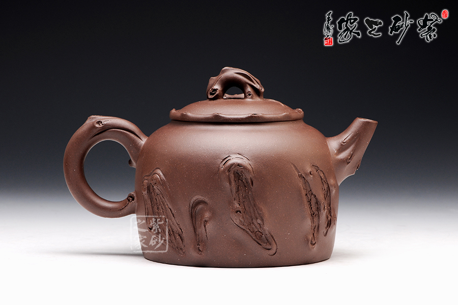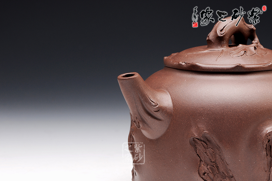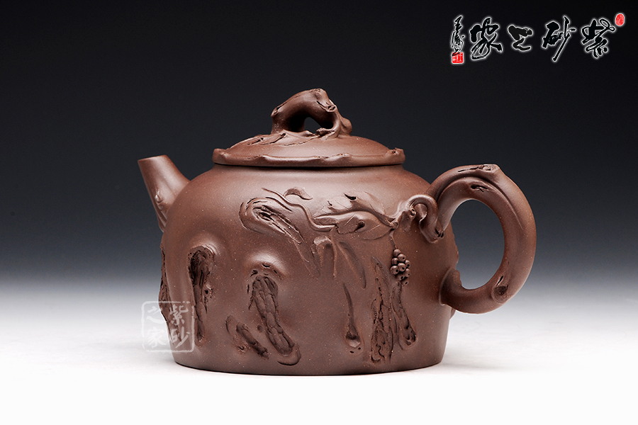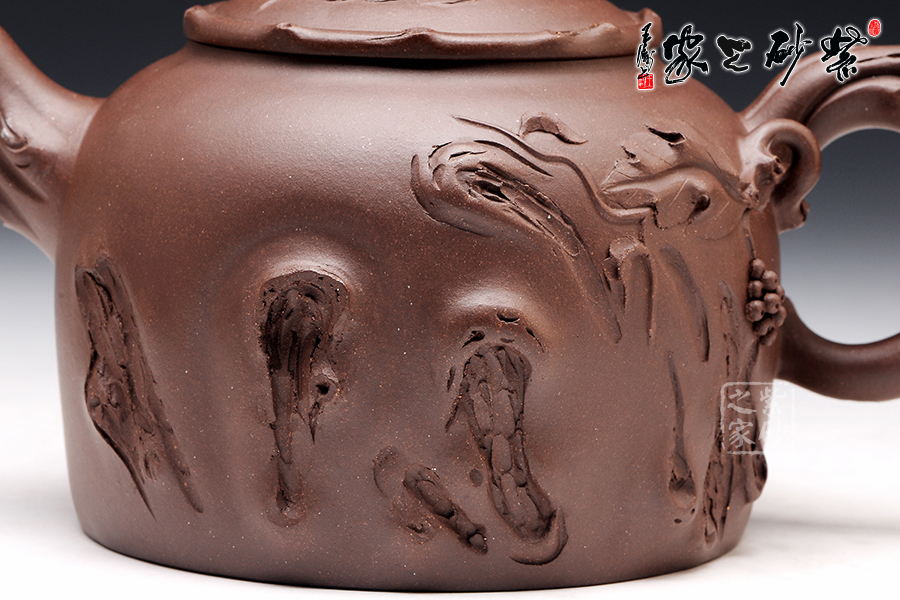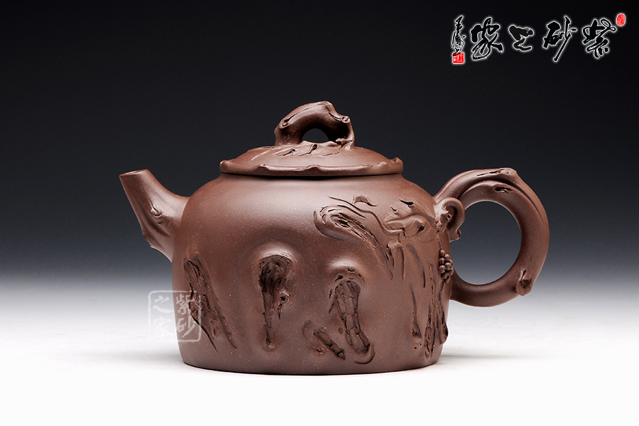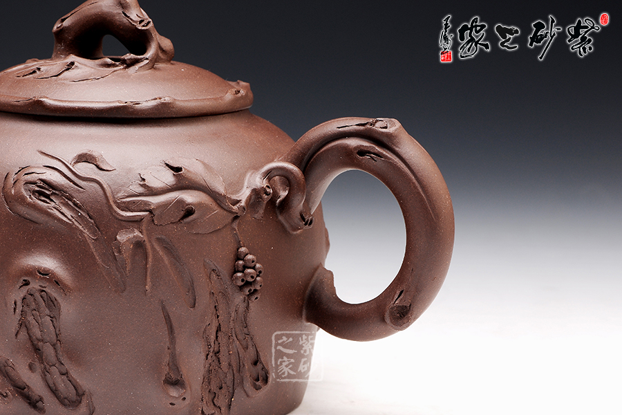 壺型氣度不凡,加上樹枝紋理的裝飾,更顯工藝獨到。壺身上沿平滑,底部非常工整,壓蓋圓潤,橋形鈕為一截樹枝,貼花葉片在上面,更顯自然情趣逼真。壺嘴和壺把的姿態(tài)相互對應(yīng),壺嘴彎流且上翹,舒暢里顯工整,壺把則是微微下伏,粗細轉(zhuǎn)變中有均勻細致。裝飾的木質(zhì)紋理異常逼真,而在壺把旁邊的葡萄一串正應(yīng)了此壺名稱。