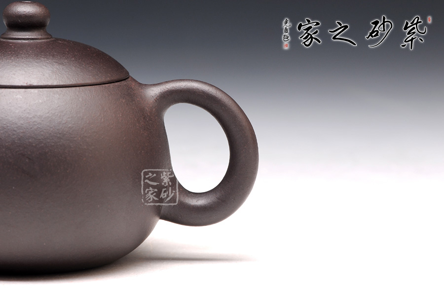 此款西施壺雖不飾任何雕琢,卻露出原有的醇美,本是傾國(guó)傾城貌,何須多加雕飾呢;此壺采用黑拼紫泥制成,泥質(zhì)的細(xì)膩柔滑猶如少女的肌膚,這種獨(dú)特的泥質(zhì)是任何一種陶土都無(wú)法比擬和代替的,給紫砂壺注入了靈性!整器勻稱流暢,無(wú)懈可擊,器型上柔和嫵媚,圓中有變,小而不弱,細(xì)而精致,有骨有肉骨肉亭勻。