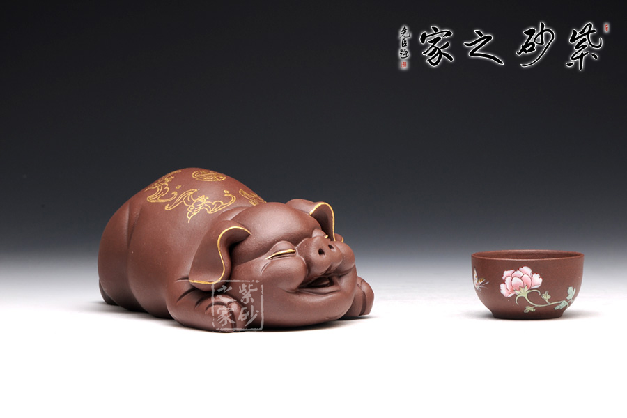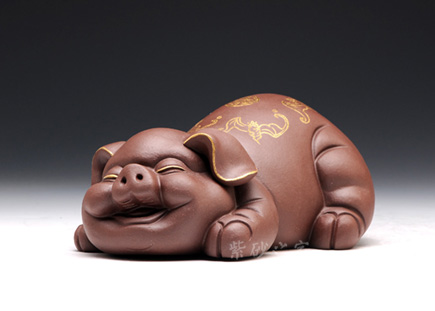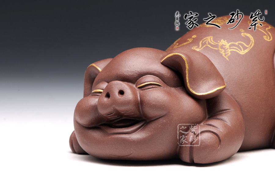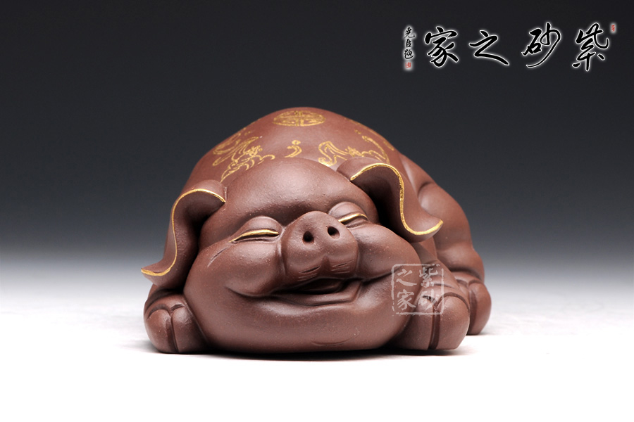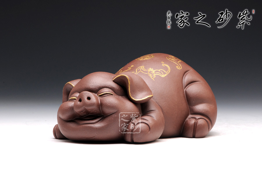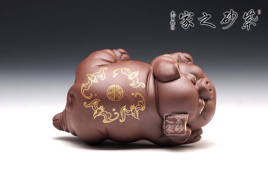 小豬趴在地面上,眼睛微閉,笑意盈盈,正是在做美夢(mèng)的模樣。再看其造型,臉蛋滾圓,耳朵肥大,通身都肉嘟嘟。擬人化的做法,讓這只小豬尤其可愛。描金的蝙蝠更是讓此豬有招財(cái)納福的功效。賞玩之,天真的童趣和無(wú)限感慨讓人忘憂。