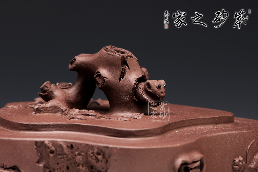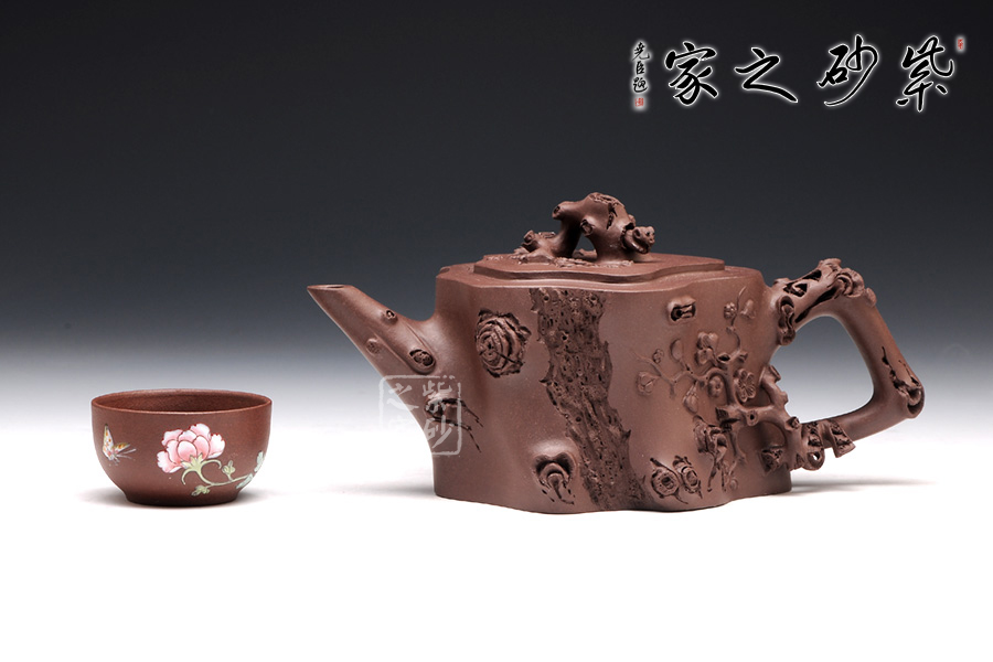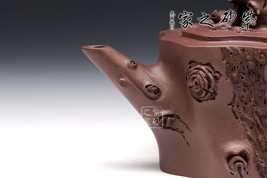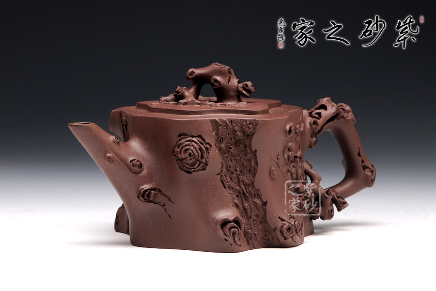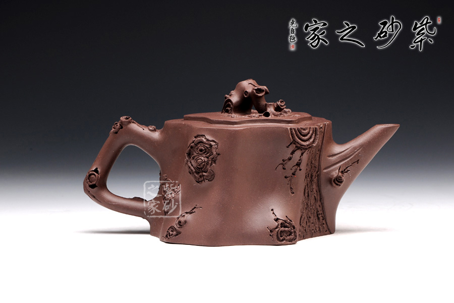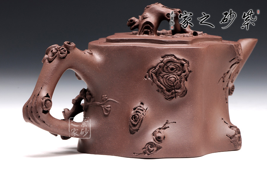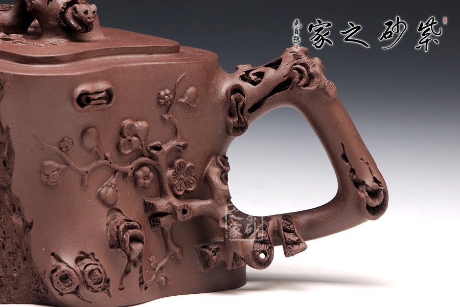 梅樁,是一款經典的紫砂壺器型,選用原礦紫泥精制而成,以梅花燦爛綻 放表現報春的主題,從壺身造型到創(chuàng)作原意都洋溢著無比的朝氣,讓人感到了春天來到的勃勃生機;壺身、流、把、蓋全部是用極富生態(tài)的梅樁、樹皮及纏枝組成, 形態(tài)自然而富含力度;壺上梅花采用貼花技藝手法,壺嘴壺把為梅樁衍生出的枝干,伸展自然,有如自然長成,仿生性極強,充滿了生命的活力;壺把和壺鈕處胥出梅花,疏影橫斜、暗香動人;壺身融圓、壺足挺立,壺蓋穹窿,整體制作到位,此壺做工精細,實用性觀賞性都很好。