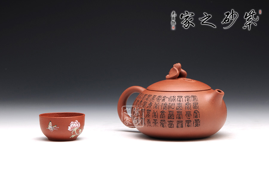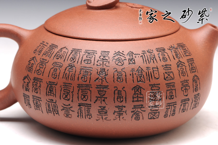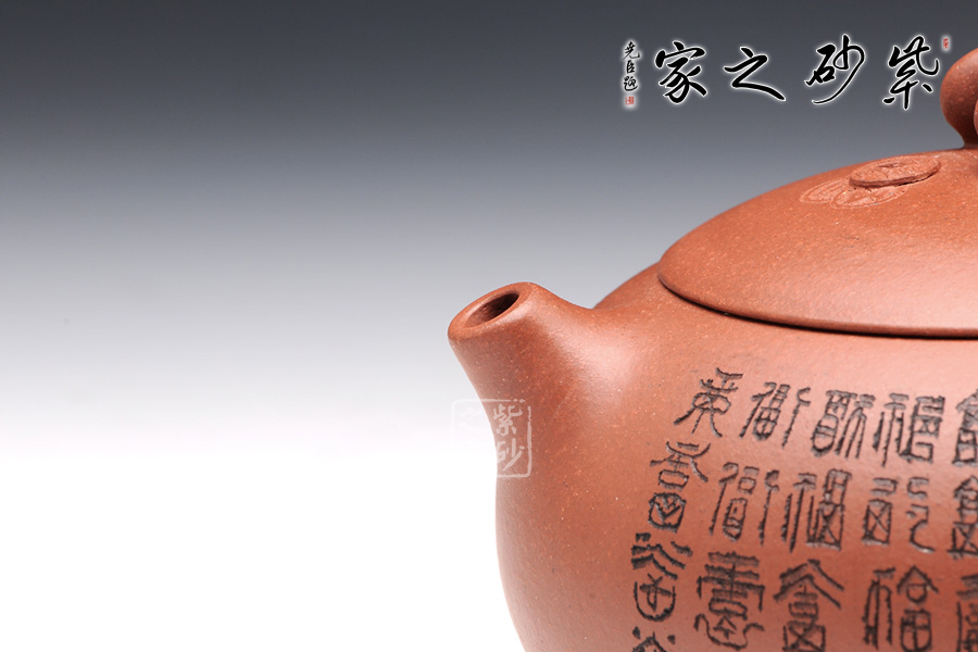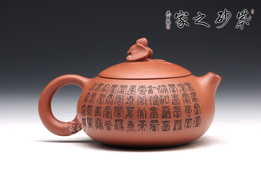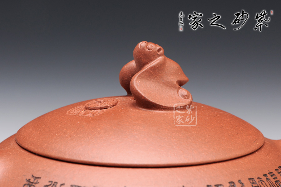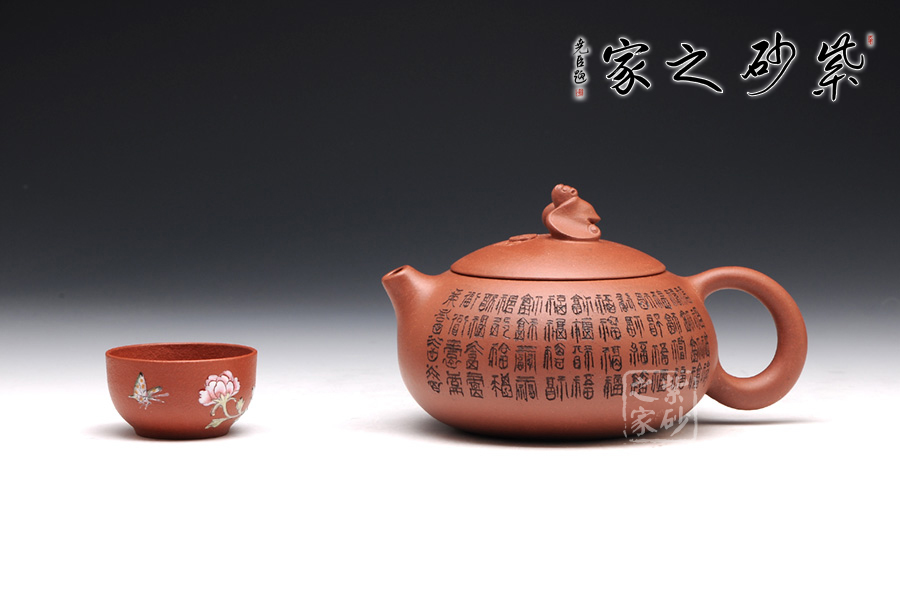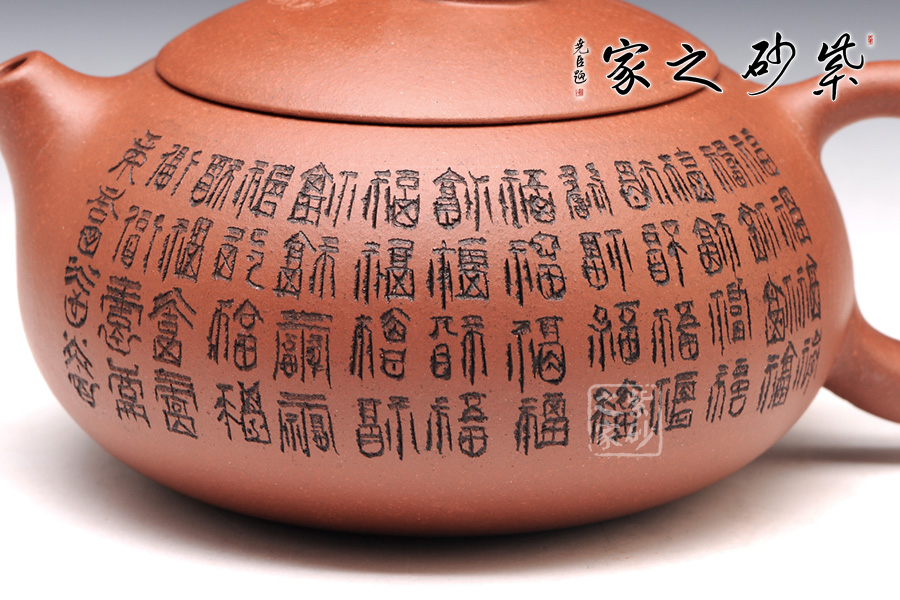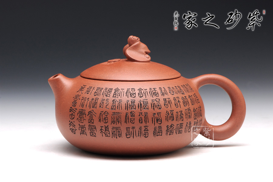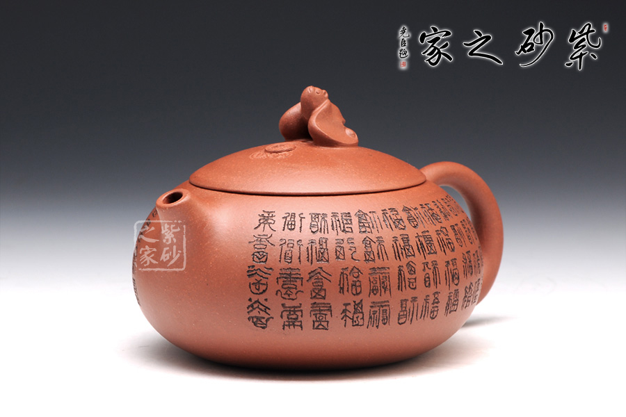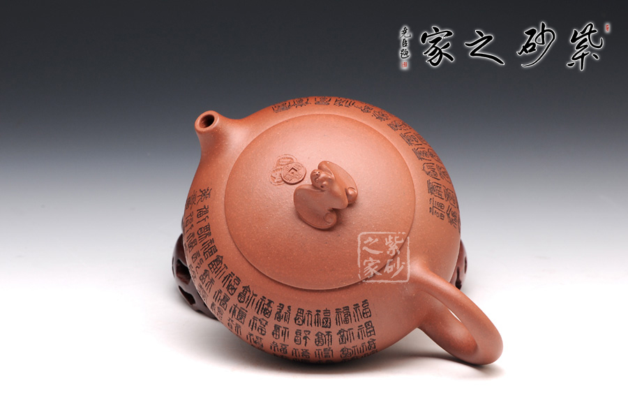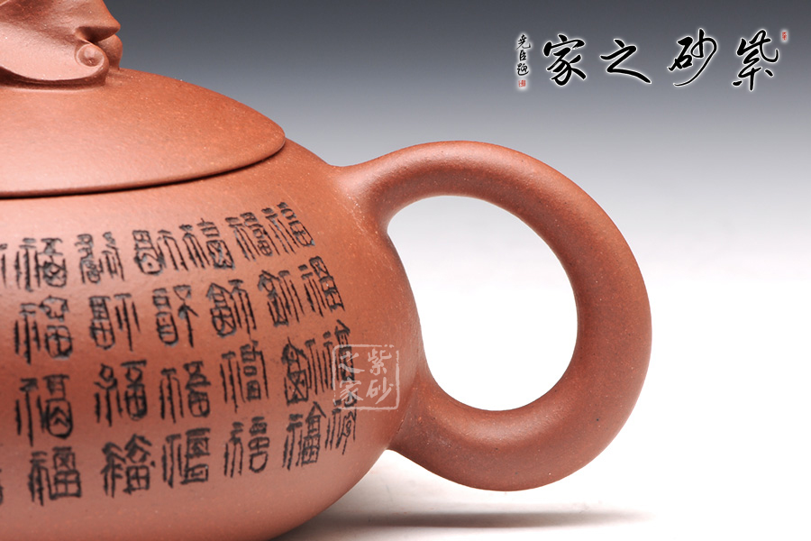 壺型是經(jīng)典的西施,半球型圓潤美觀,精致不俗。倒把和小嘴相得益彰,更讓人感覺意味無窮。壺蓋之上是一只蝙蝠的造型壺鈕,形態(tài)逼真,讓人贊嘆。壺身上刻繪的百福寓意美好,正應了壺名。