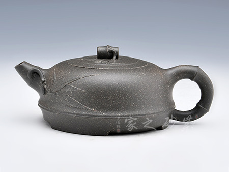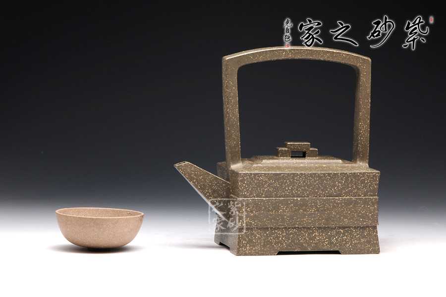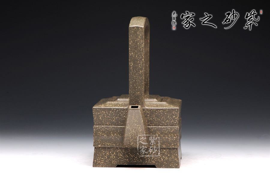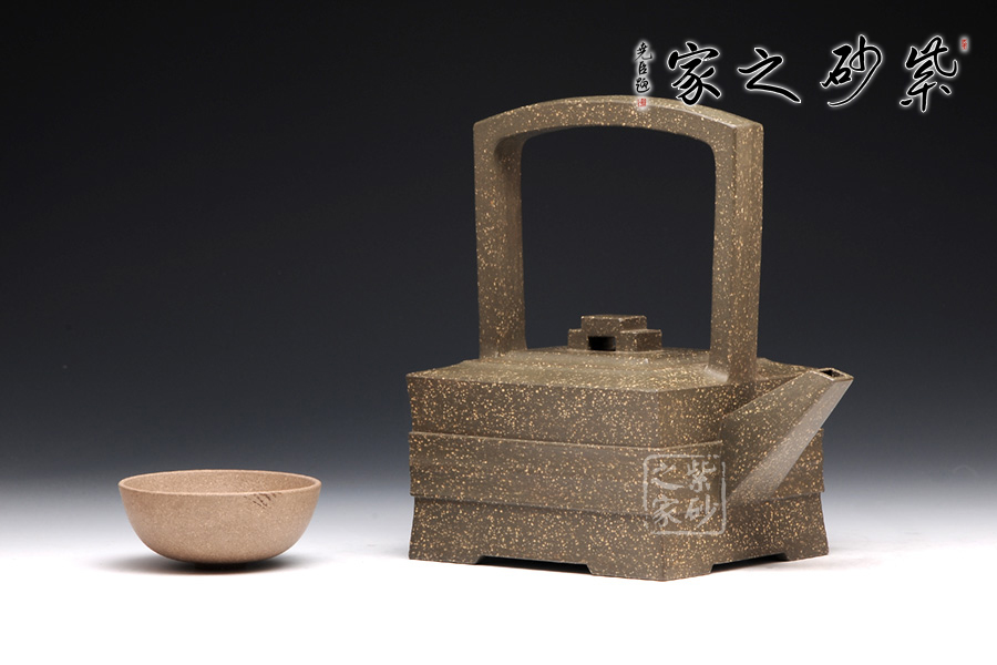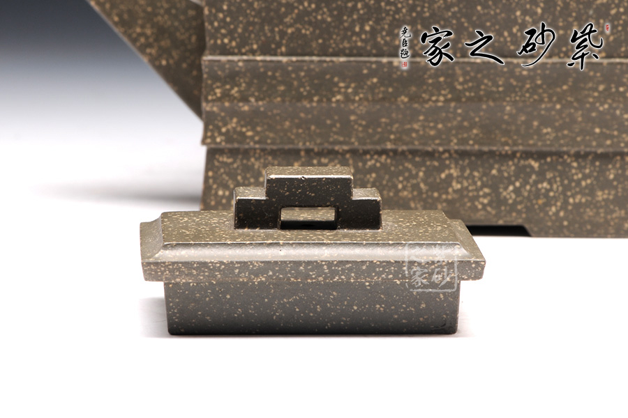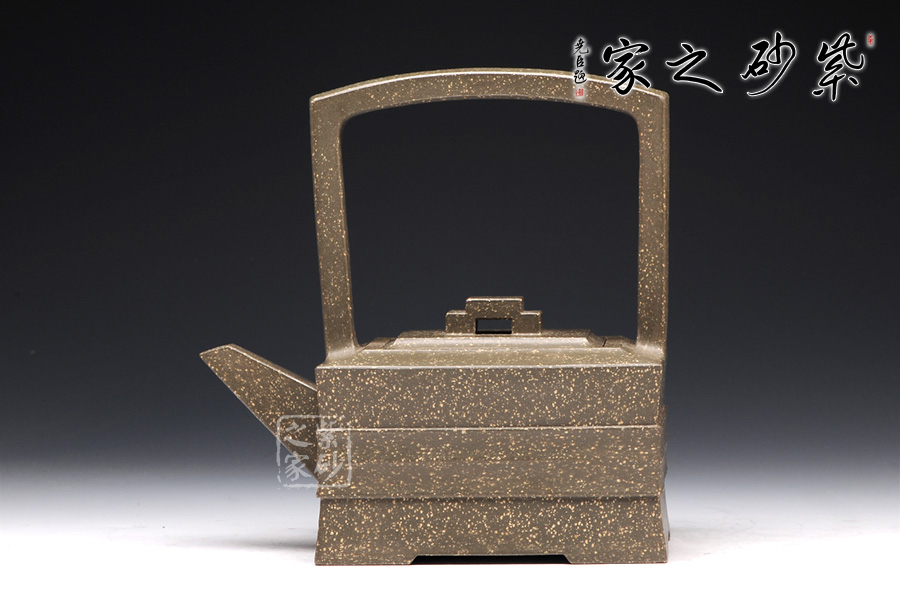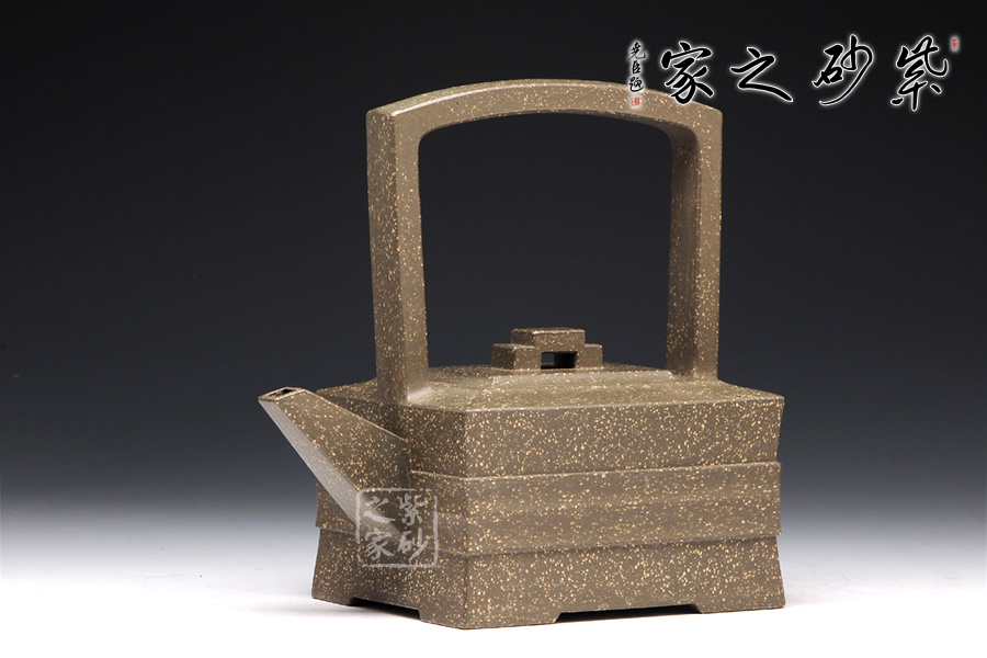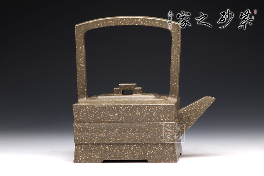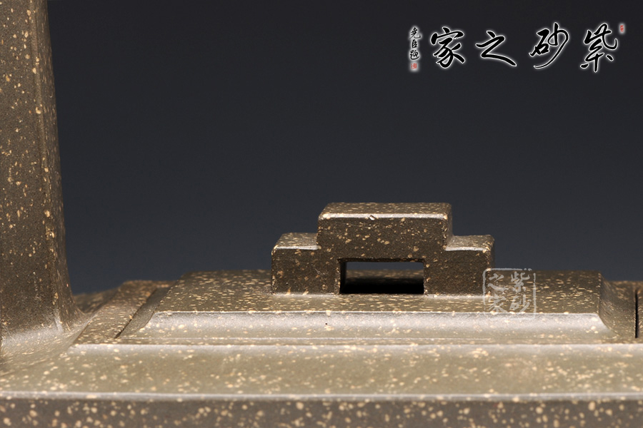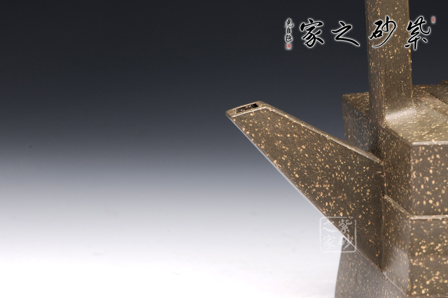 此壺玉帶提梁,老師在點線面起承轉(zhuǎn)合之間巧妙處理,棱角分明,脈絡(luò)清晰。四方嵌蓋,方磚壺鈕,磊落大氣。方形壺身,中間稍微內(nèi)斂,以雙腰帶束之,故為“玉帶”。方鈕、方把、方嘴,嘴流輸出強悍,由粗變細,直挺有力。自兩側(cè)壺肩為根提梁橫出,其實宏大,立體感極強。泥料又獨特不凡,讓此壺分外突出。整把壺線條挺括,折角交代清晰,面線結(jié)合爽利,是方器中難得極品。
