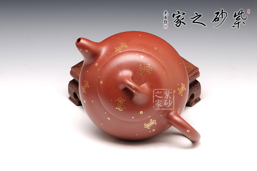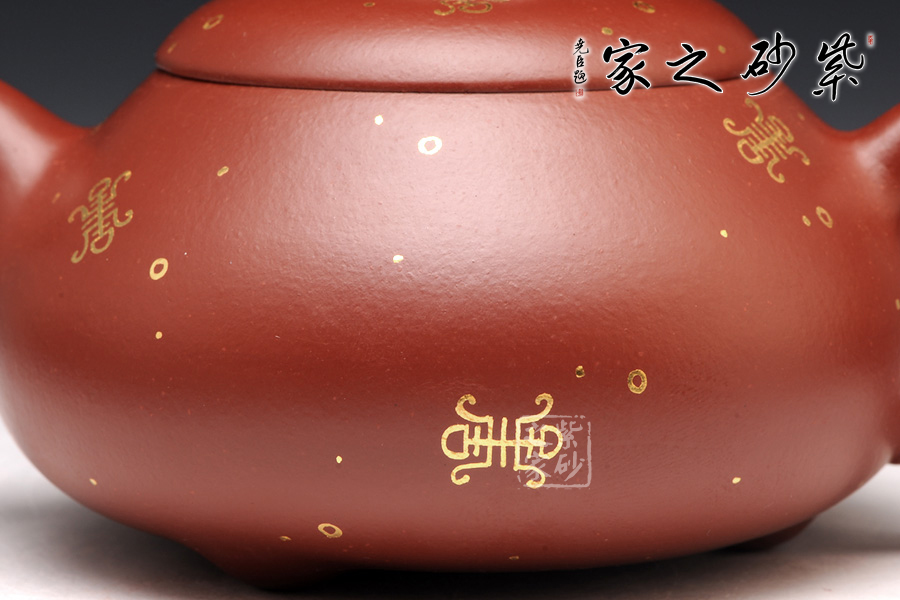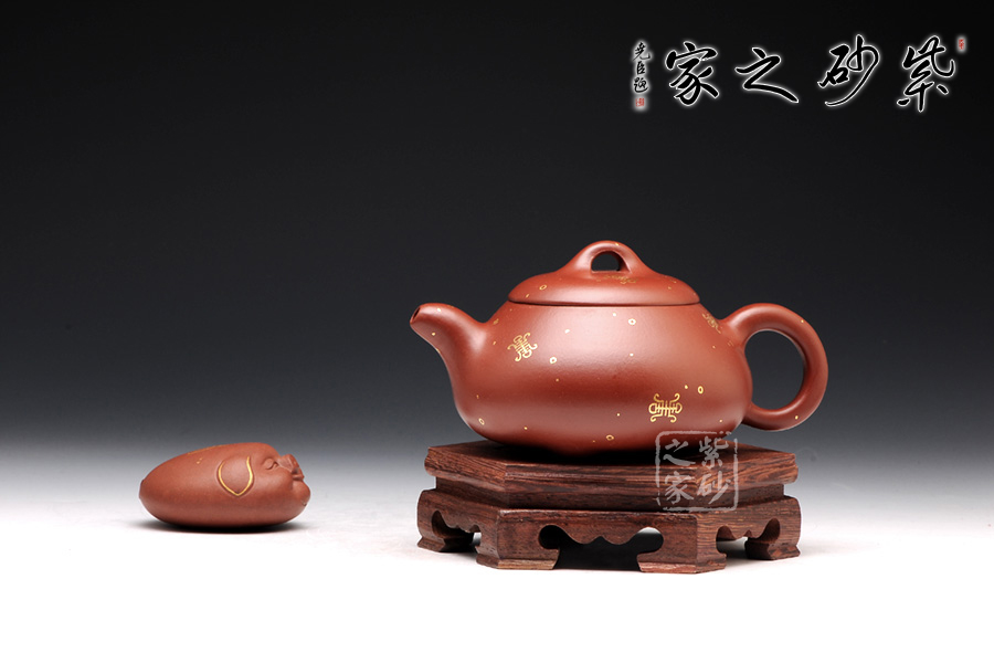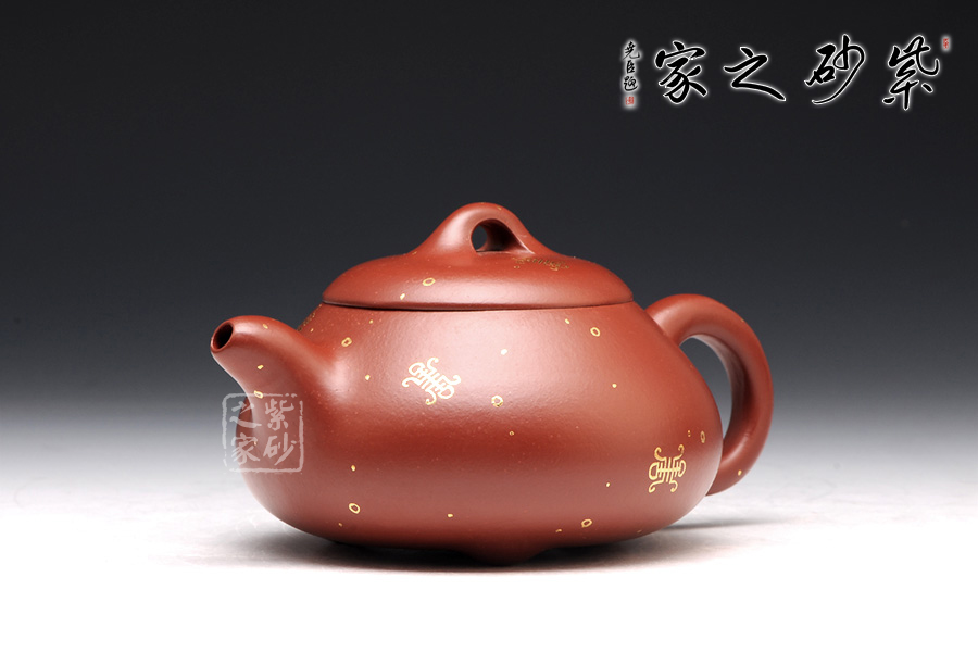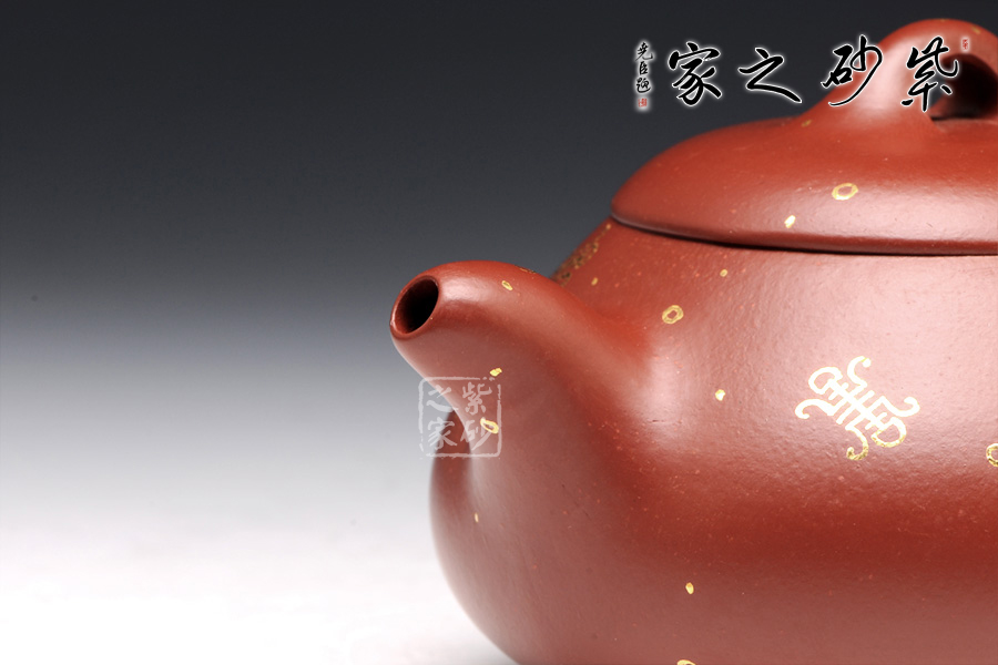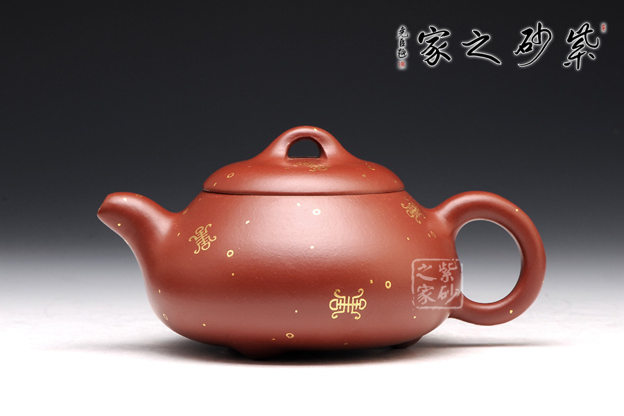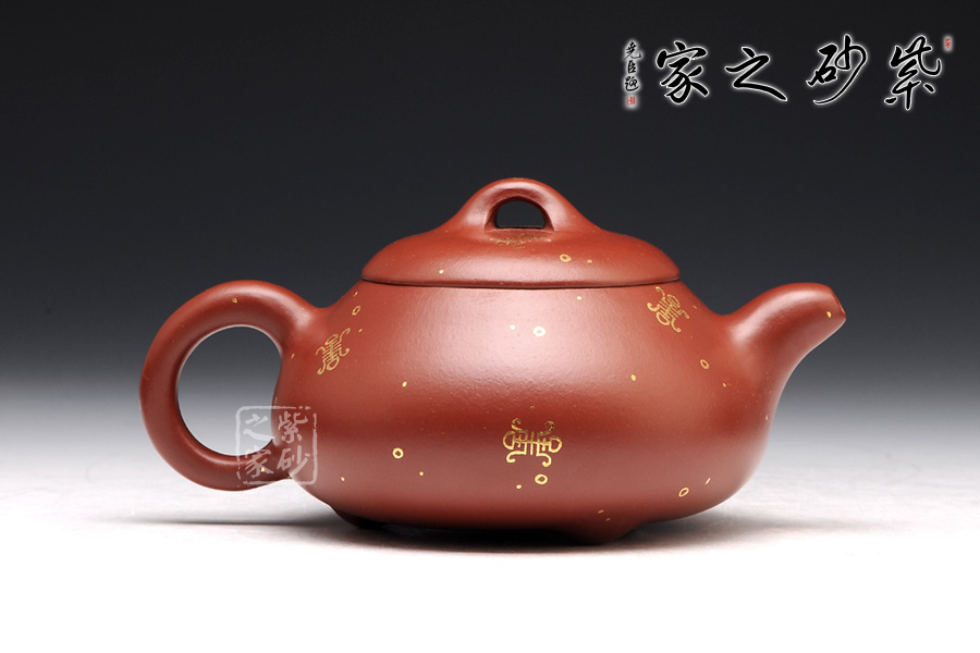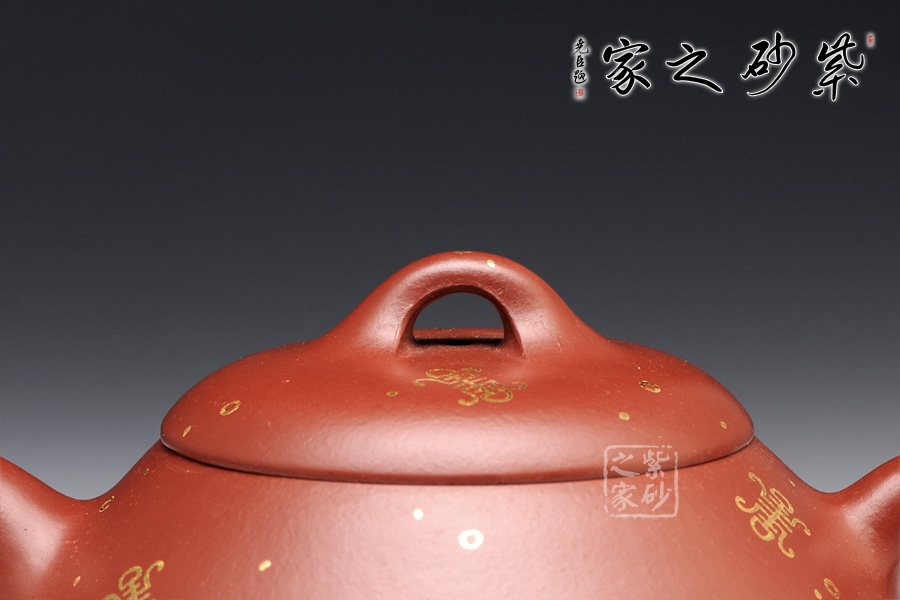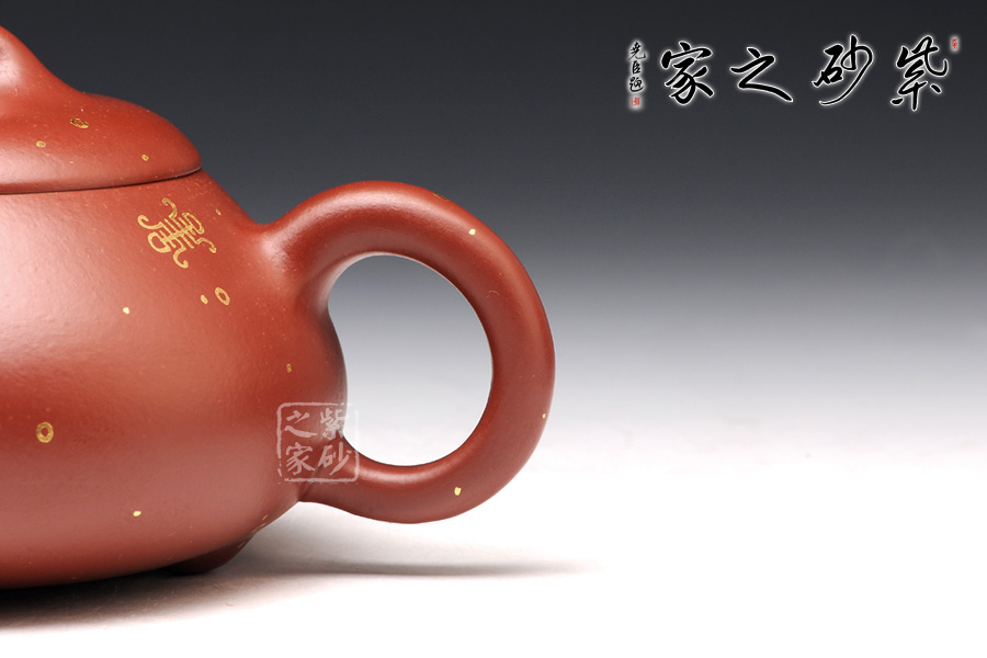 此款石瓢標(biāo)新立異,不同凡響。以往石瓢都是三角形壺身,挺拔倔強之態(tài)畢露。此石瓢,卻接近半圓,雖沒了那份傲骨,但更顯敦厚和圓潤。壺蓋是壓蓋,覆于壺身上,更使壺型收短。壺嘴和壺把則呈現(xiàn)弧線,顯得平和自然,溫柔生動。描金的裝飾映襯在紅艷的泥料里更寓意生活紅火富貴,此壺一定不能錯過。