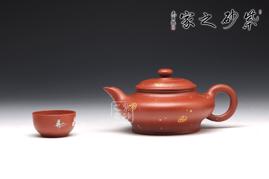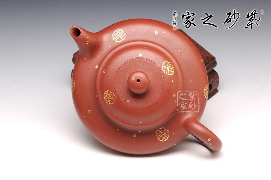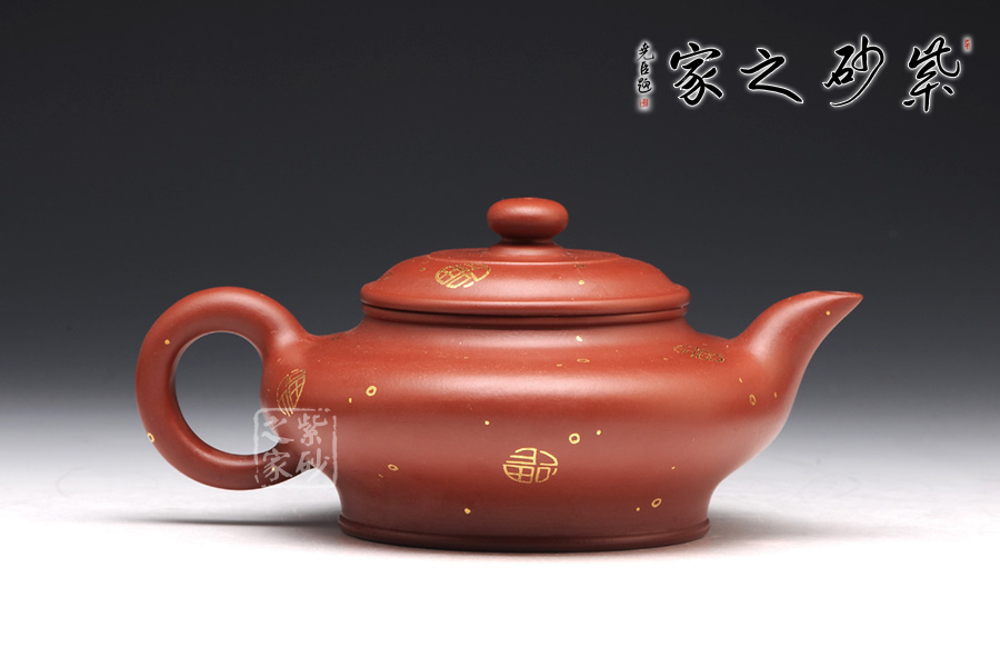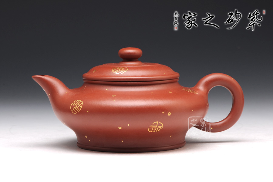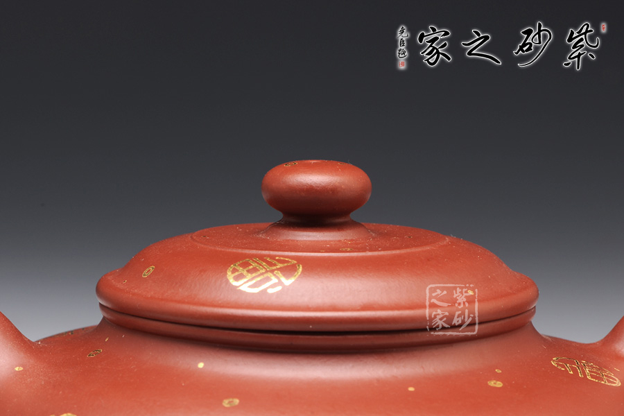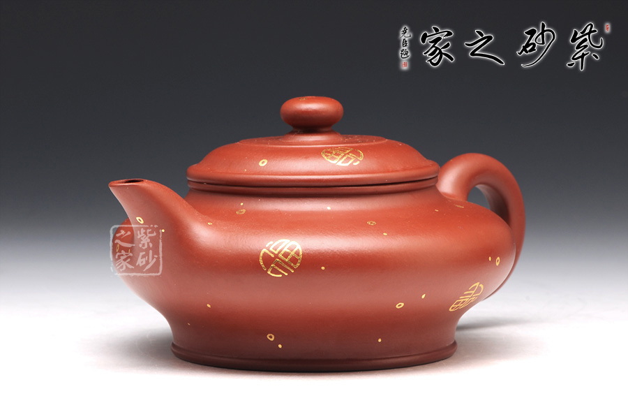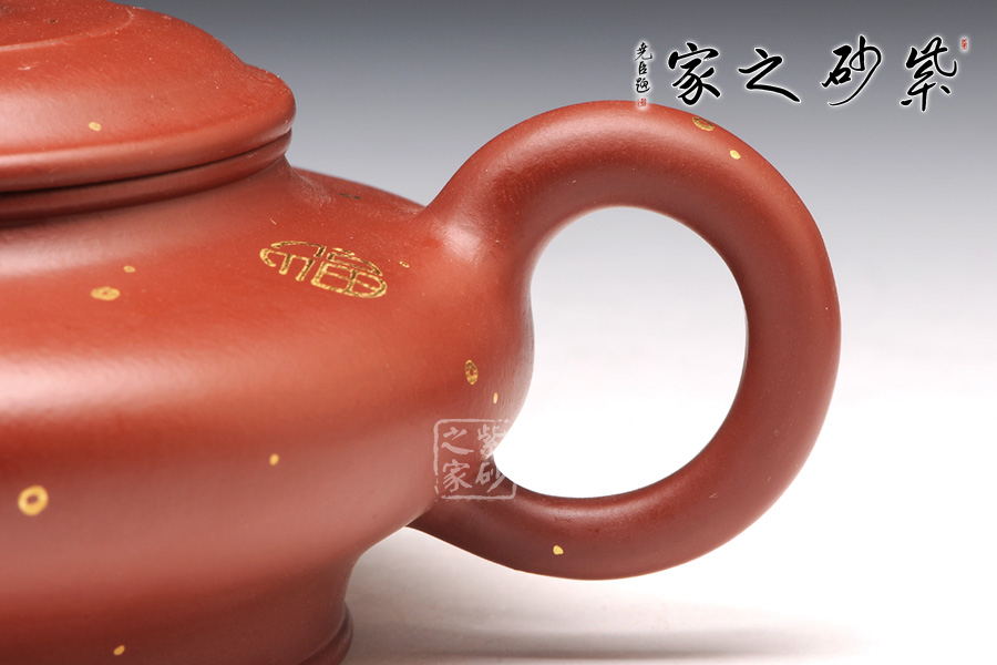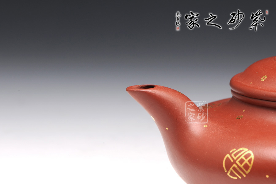 此壺通身紅潤亮澤,古雅大氣。該壺名為虛扁,眾所周知,“器 型扁一分,造型難一分”這是紫砂行業(yè)的一句行話,而眾多器型當中當屬虛扁造型最獨特,極難成形,這款虛扁壺卻不得不讓人佩服,清雅脫俗的氣韻襯托出作品典雅的味道,嘴頭處理干脆利落,略微下沉,蓋微鼓,古樸典雅。此為經(jīng)典而簡單的虛扁式樣,壺身極 扁,而造型不虛,實用而雅致,細節(jié)精細,大處舒展,實為賞心悅目的好壺。加上描金裝飾,更顯富麗高雅。