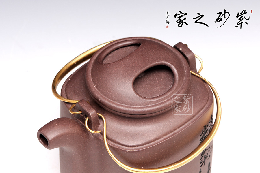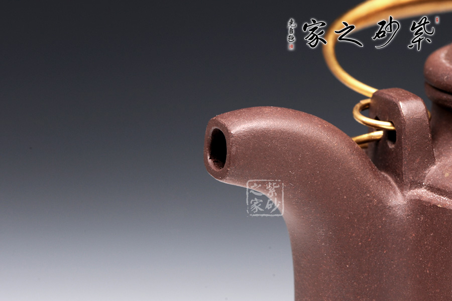 此洋桶壺色澤溫潤,泥質(zhì)淳樸,工藝精湛,線條挺括,精、氣、神俱佳。壺蓋做的很精致,壓蓋,與壺口緊密結(jié)合,口蓋整體平整光滑,外形流暢。壺鈕制作別出心裁,采用了像牛鼻孔式的鏤空結(jié)構(gòu),生動與趣味完美結(jié)合。蓋沿,口沿為母子線。壺把采用了活提梁樣式,在壺身兩端置軟提梁雙耳。兩柄銅把提梁置于其上。