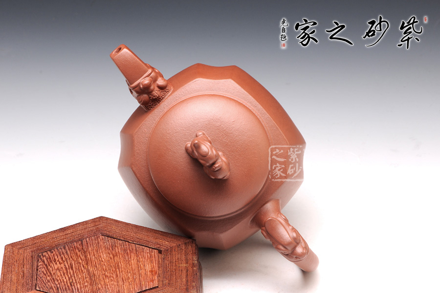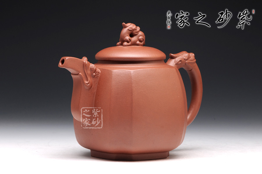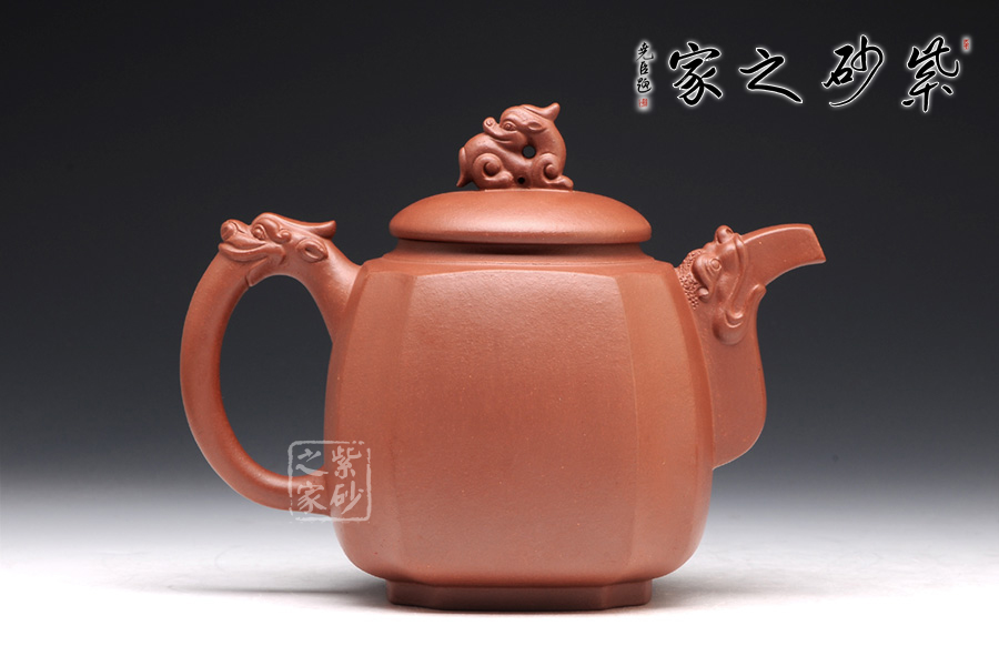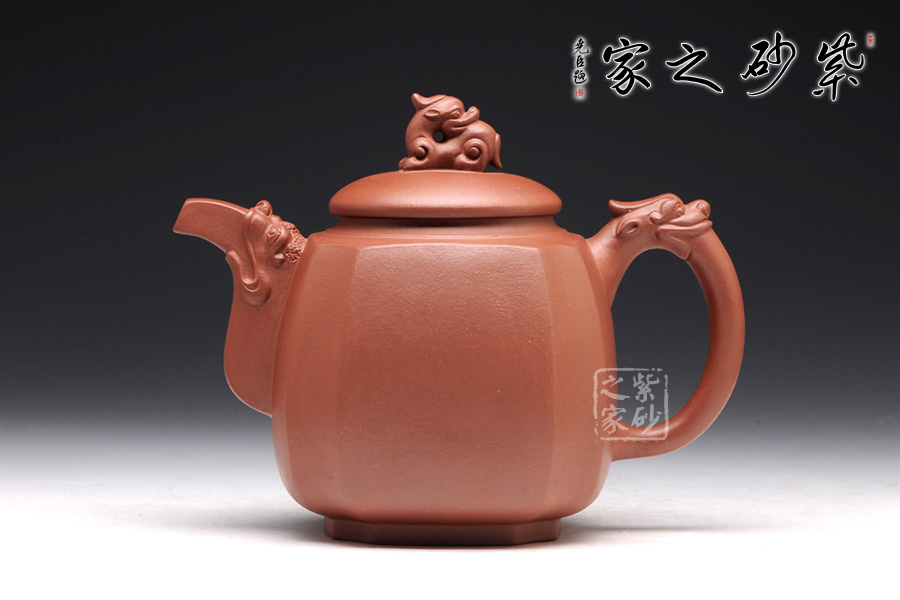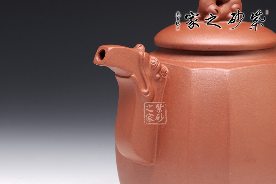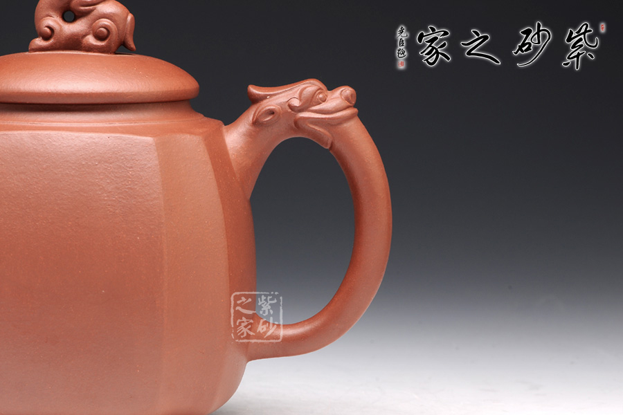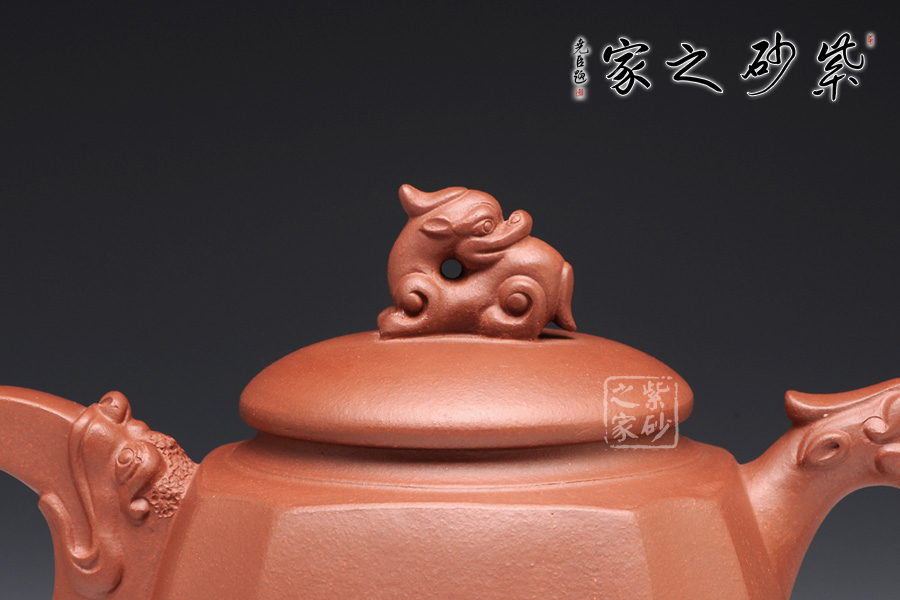 精選原礦底槽清泥料制成的此壺,泥質(zhì)醇厚,色澤古穆。該壺名為高瞻遠矚,可謂是寄寓深刻。壺身高挺,壺嘴和壺把處皆有一龍頭,呈吐納一切的姿勢,氣勢磅礴。壺鈕為龍頭做回望狀,形象逼真,高高在上的姿勢,恢宏大氣,和此壺所表達主題完美呼應(yīng)。