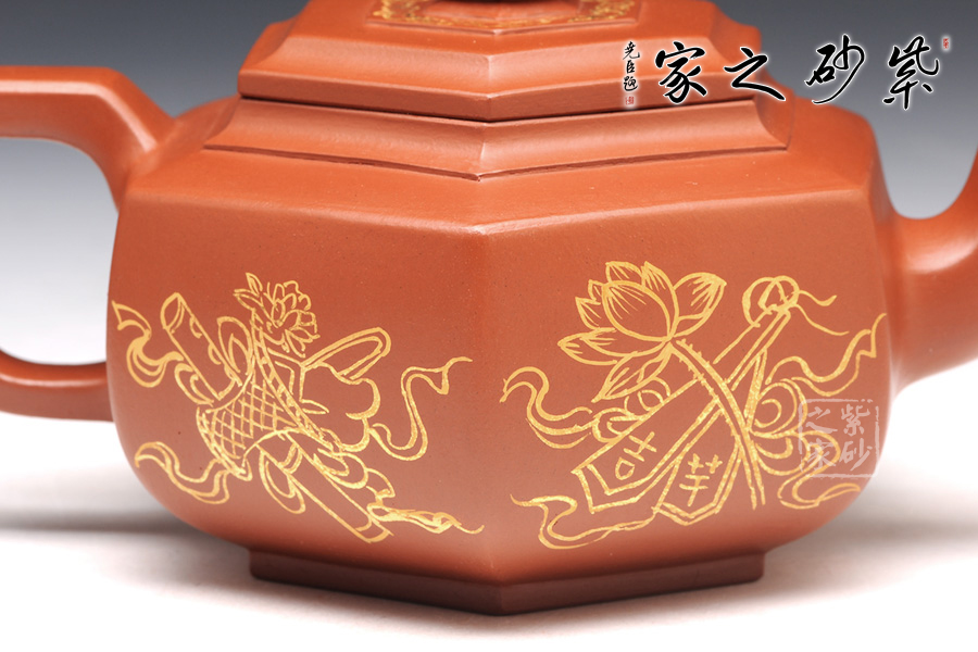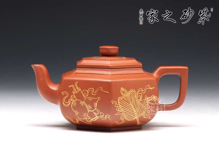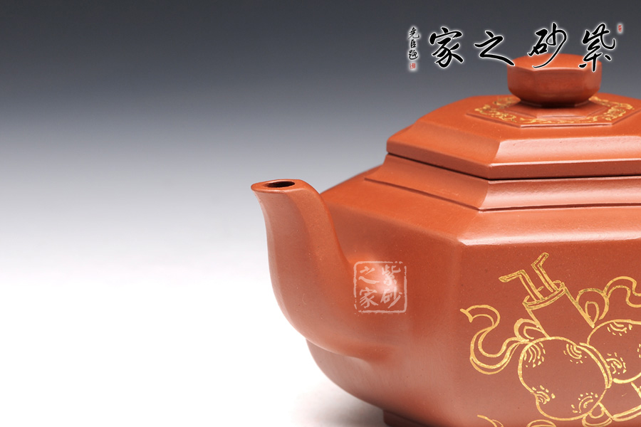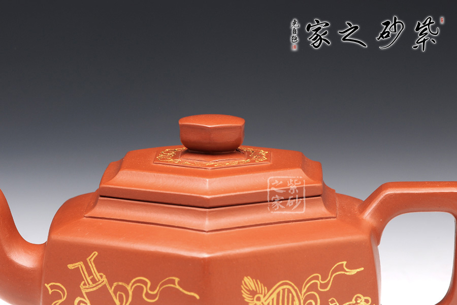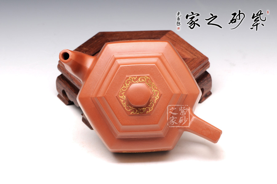 從此個(gè)壺體來(lái)看,多采用的是對(duì)比的手法,整體線條呈現(xiàn)上密下疏,這種六方壺體款式的壺由泥片銜接,而此種方法的制作難度極大,要做到恰到好處需極為細(xì)致。六方壺上下連連通,渾然一體,壺蓋與壺口配合嚴(yán)密,分毫不差,完美的展現(xiàn)了點(diǎn)線面的結(jié)合。傳統(tǒng)的器型,加上精細(xì)的工藝,方非一式,圓不相一,手感極佳,老味極濃,此壺藝術(shù)感極強(qiáng),賞用具佳。朱泥制作,色澤清雅美觀,又格外動(dòng)人。