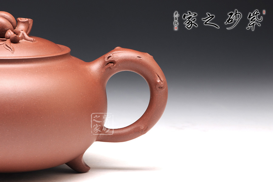 壺嘴和壺把桃枝裝飾而成,在壺嘴處一側伸出一條嫩枝,幾片綠綠的桃葉在壺身舒展開去,另外還有一只小小的桃子在枝杈上,小巧可愛,充滿生命的活力。三足小巧而立,也煞是可人。