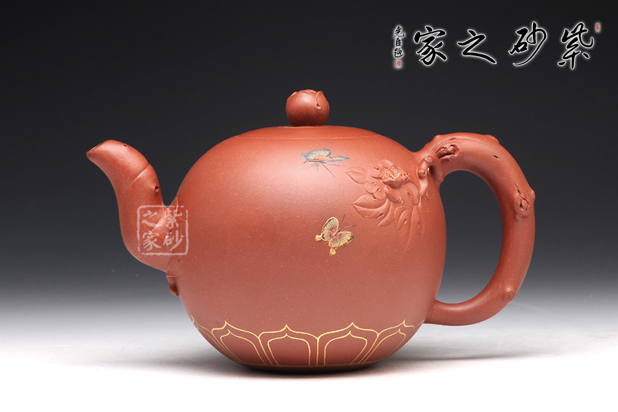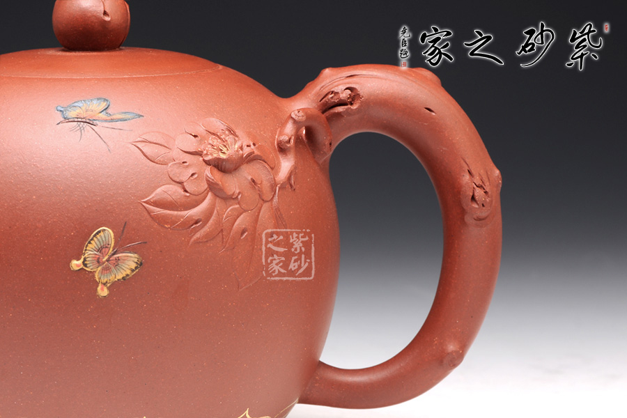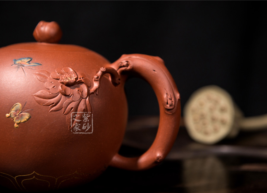 造型別致雅趣,壺身為圓球,輪廓飽滿,外觀圓潤(rùn),無一處不是精致細(xì)膩。壺鈕為含包待放的花骨朵,寧靜慧心,小巧中有工整。壺嘴彎流,線條曲折繁復(fù)。壺把卻是大方順暢,力道分明。壺嘴與壺把三點(diǎn)連一線,兩者設(shè)計(jì)均如老枝盤纏,節(jié)點(diǎn)突出。貼花裝飾為此壺一大特色,非常逼真,花開富貴引得彩蝶翩舞。而壺身下方的花瓣描繪圍繞整壺,與壺鈕上下呼應(yīng),實(shí)則巧妙!
